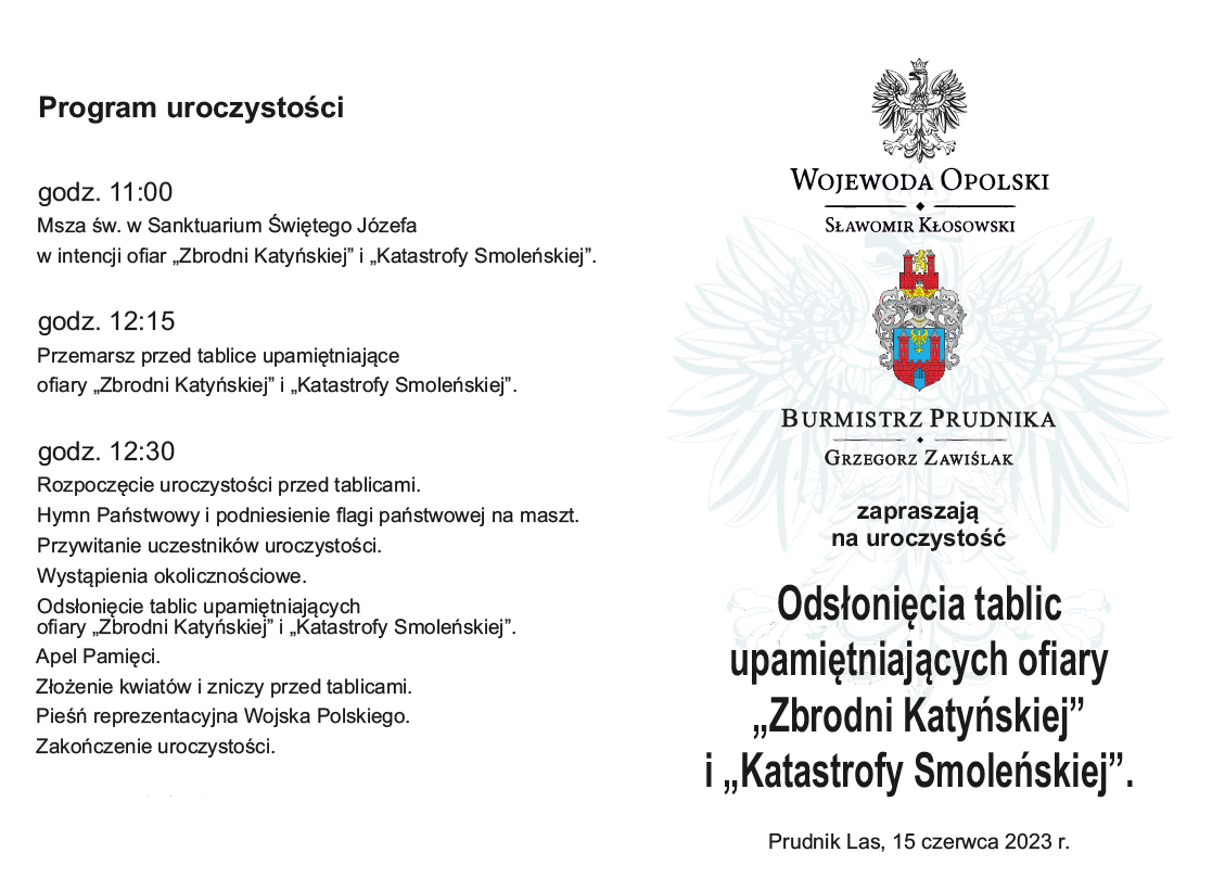 Wojewoda Opolski zaprasza na uroczystość odsłonięcia tablic upamiętniających ofiary „Zbrodni Katyńskiej” i „Katastrofy Smoleńskiej". Uroczystość odbędzie się 15 czerwca w Prudnik Las.