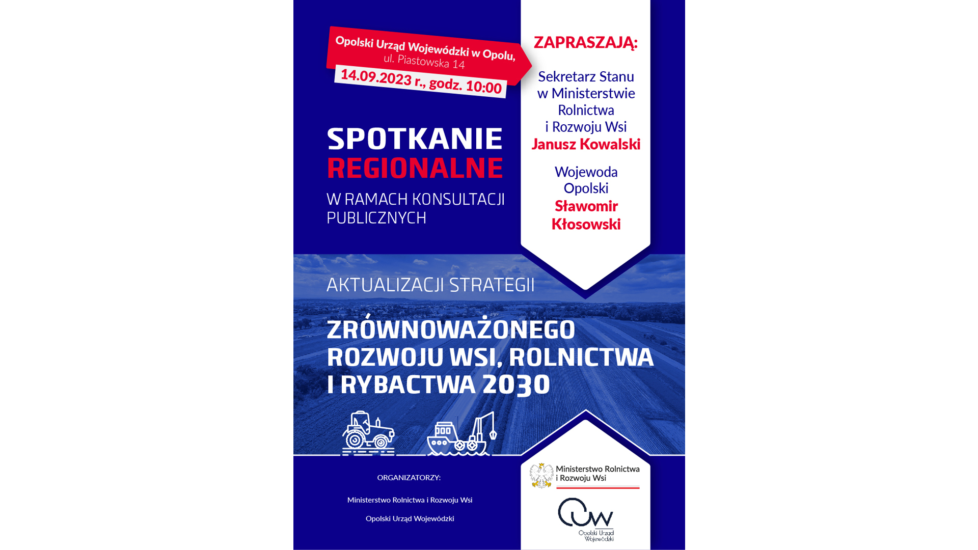 14 września 2023 r. w Opolskim Urzędzie Wojewódzkim w Opolu odbyła się VI konferencja regionalna w ramach konsultacji publicznych zaktualizowanej Strategii zrównoważonego rozwoju wsi, rolnictwa i rybactwa 2030. Dokument został zaktualizowany m.in. w oparciu o diagnozy regionalne, w tym diagnozę dla województwa opolskiego. W konferencji udział wzięli m.in. przedstawiciele Ministerstwa Rolnictwa i Rozwoju Wsi, na czele z Panem Januszem Kowalskim – Sekretarzem Stanu w Ministerstwie Rolnictwa, Pan Sławomir Kłosowski - Wojewoda Opolski, członkowie wojewódzkiego Zespołu ds. analizy szans i zagrożeń oraz potencjalnych kierunków rozwoju obszarów wiejskich do 2030 r. (w tym m.in. przedstawiciele organizacji i rolniczych), producenci rolni oraz pracownicy Opolskiego Urzędu Wojewódzkiego w Opolu.