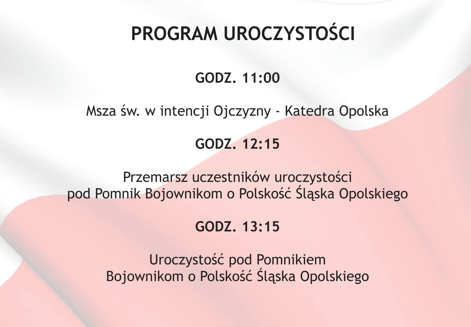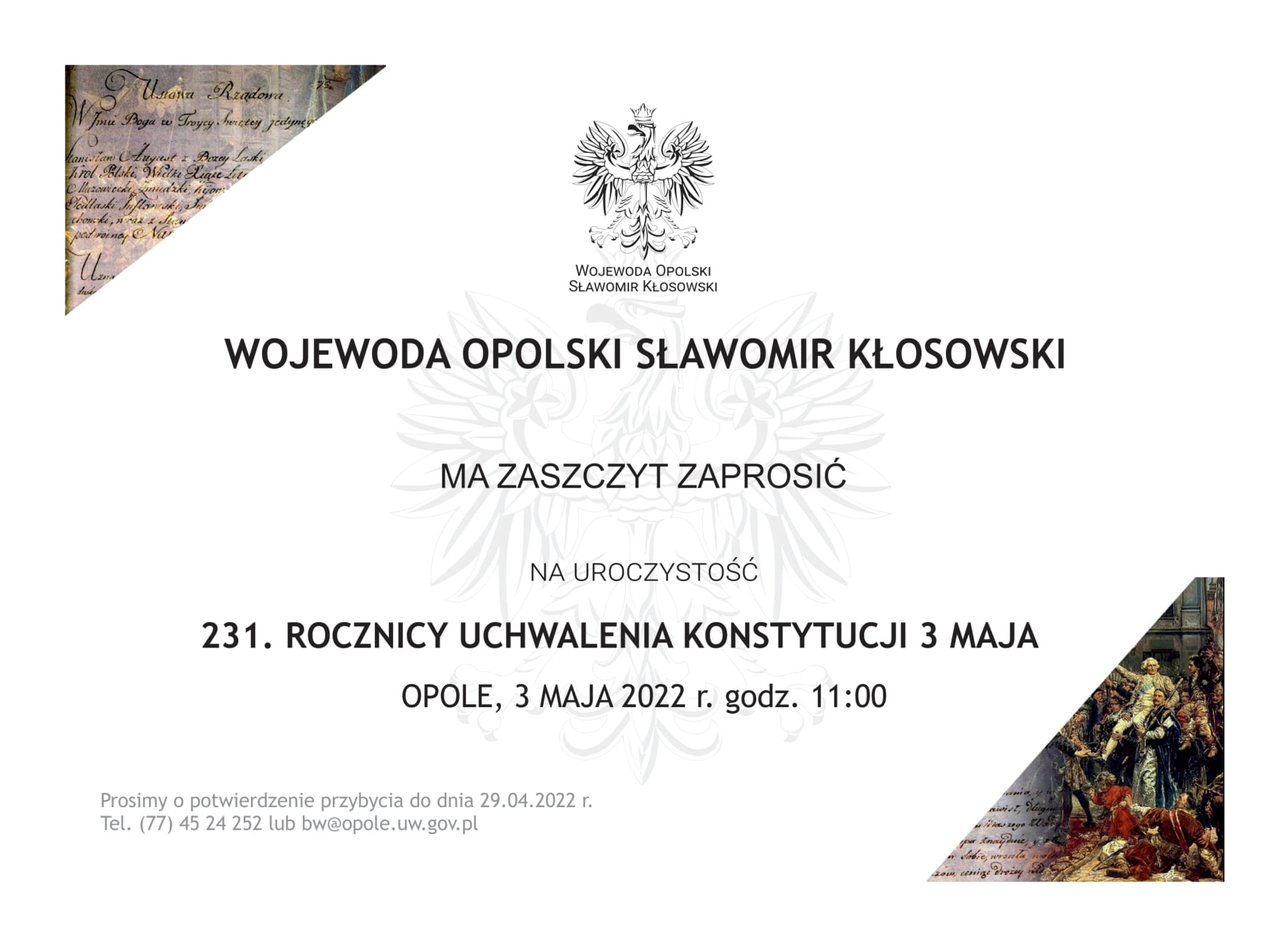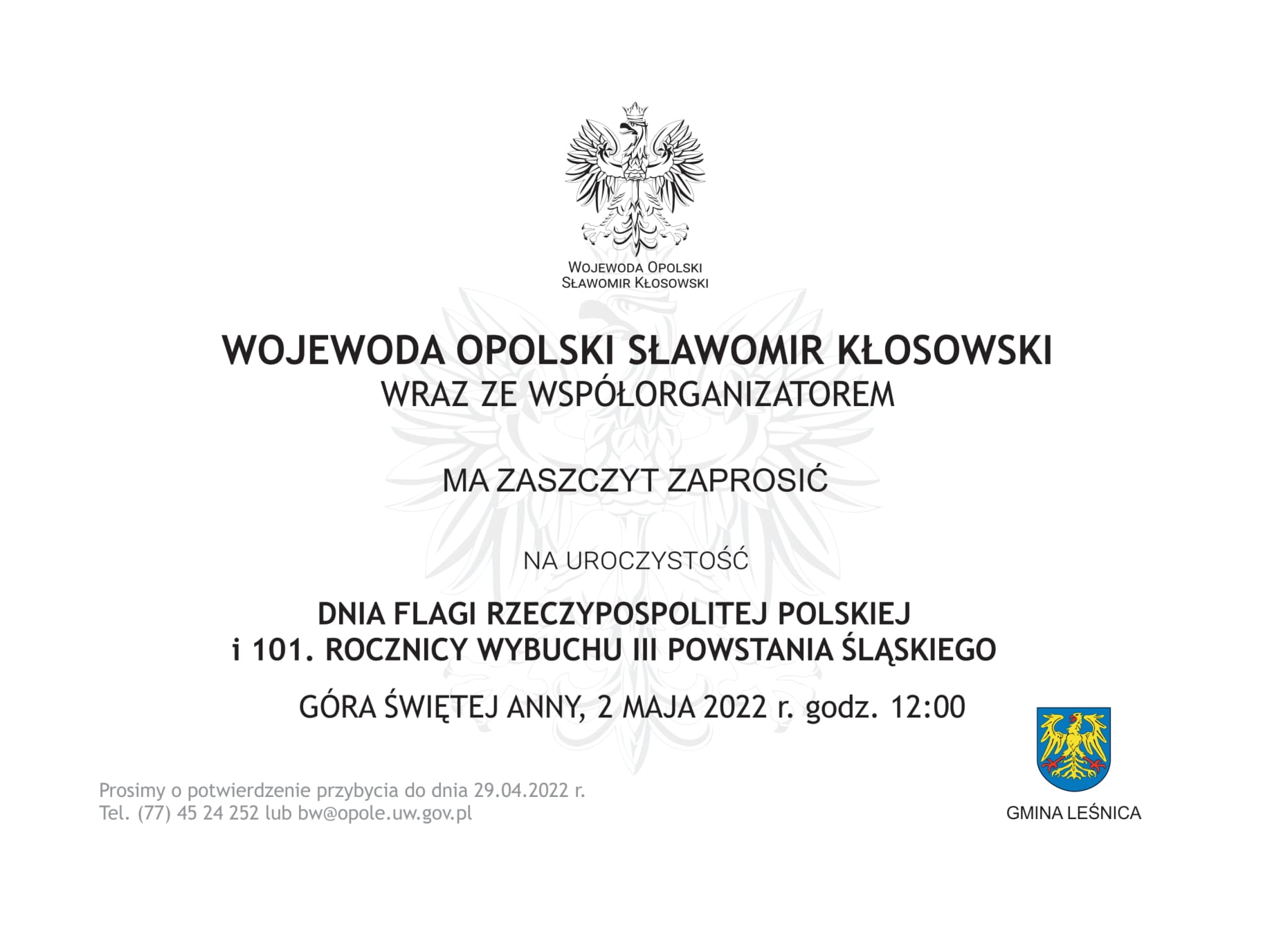 Wojewoda Opolski wraz z partnerami, zaprasza do wzięcia udziału w uroczystościach z okazji Dnia Flagi RP oraz 101. rocznicy III Powstania Śląskiego oraz na uroczystości, upamiętniające 231. rocznicę uchwalenia Konstytucji 3 Maja.