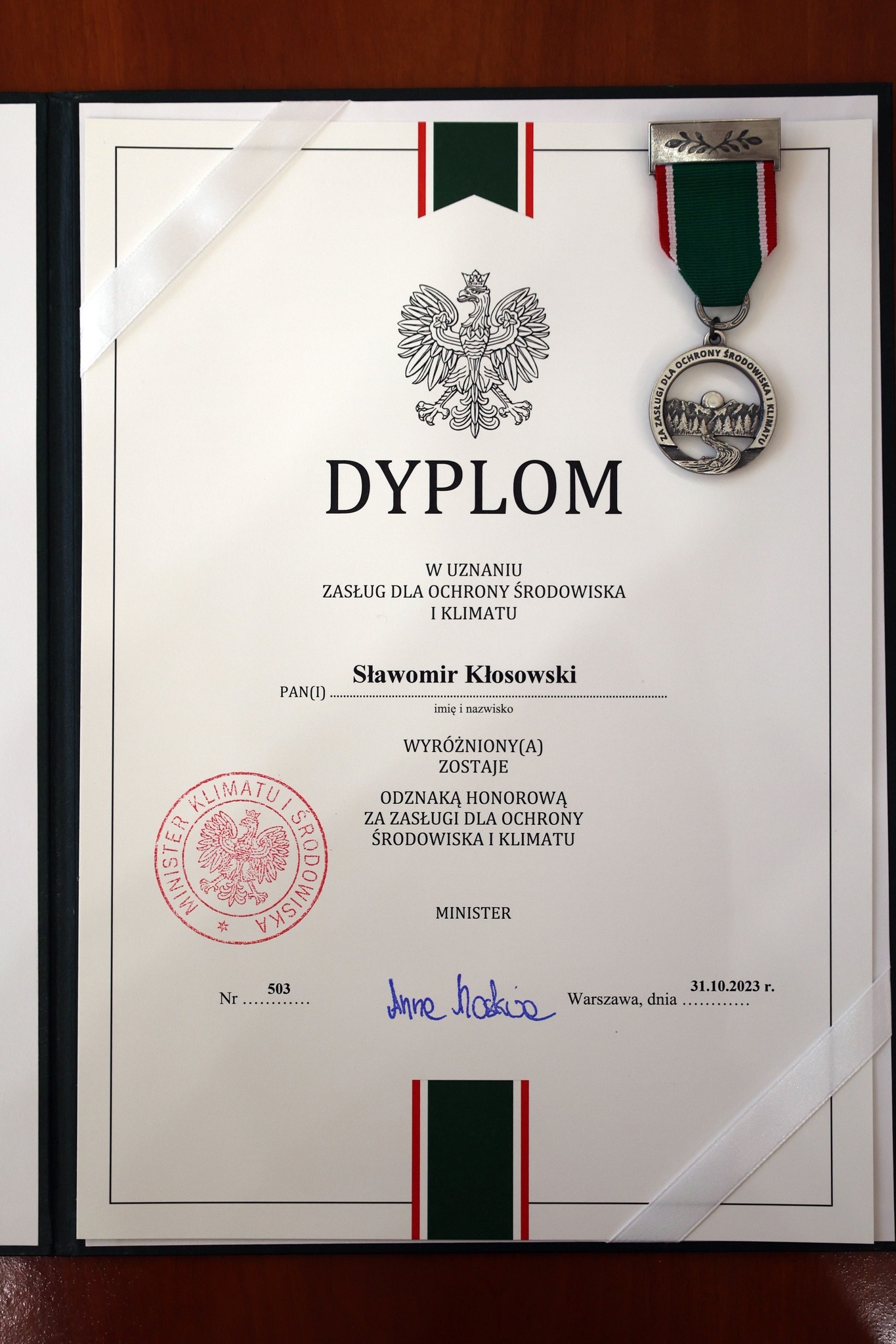 30 listopada 2023 r. Prezes Zarządu Wojewódzkiego Funduszu Ochrony Środowiska i Gospodarki Wodnej w Opolu Aleksandra Drescher reprezentując Ministra Klimatu i Środowiska wręczyła Wojewodzie Opolskiemu Sławomirowi Kłosowskiemu Odznakę Honorową za Zasługi dla Ochrony Środowiska i Klimatu.