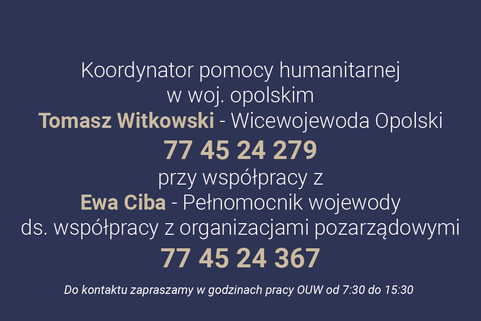 Sławomir Kłosowski, wojewoda opolski informuje, że koordynatorem pomocy humanitarnej w województwie opolskim jest Tomasz Witkowski, wicewojewoda opolski. Nr tel. 77 45 24 279 przy współpracy Ewa Ciba, pełnomocnika wojewody ds. współpracy z organizacjami pozarządowymi. Telefon nr 7745 24 367 Do kontaktu zapraszamy w godzinach pracy Opolskiego Urzędu Wojewódzkiego. Od 7.30 - 15.30.