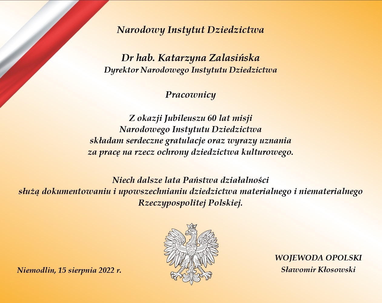 Sześć dekad działalności Narodowego Instytutu Dziedzictwa zobowiązuje do podzielenia się efektami realizowanej przez nas misji. NID powstał w 1962 roku, funkcjonując na początku pod nazwą Ośrodka Dokumentacji Zabytków. W 2002 roku został on połączony z Ośrodkiem Ochrony Zabytkowego Krajobrazu, a w 2011 roku nazwę zmieniono na obecną. Jubileusz to dla nas doskonała okazja by przedstawić dokonania Instytutu i funkcjonujących w jego strukturze oddziałów terenowych, w tym Oddziału Terenowego NID w Opolu. Robimy to w formie specjalnie przygotowanej wystawy “Przyszłym pokoleniom. 60 lat misji Narodowego Instytutu Dziedzictwa”, która już od 15 sierpnia zostanie zaprezentowana mieszkańcom województwa opolskiego - podkreśliła dr hab. Katarzyna Zalasińska - dyrektor Narodowego Instytutu Dziedzictwa.