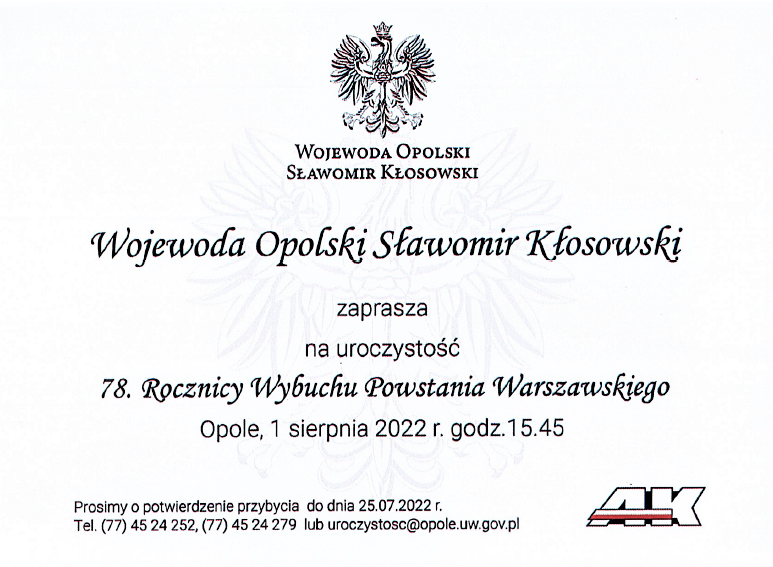 Wojewoda Opolski Sławomir Kłosowski ma zaszczyt zaprosić 1 sierpnia br. na obchody 78. rocznicy Powstania Warszawskiego.
