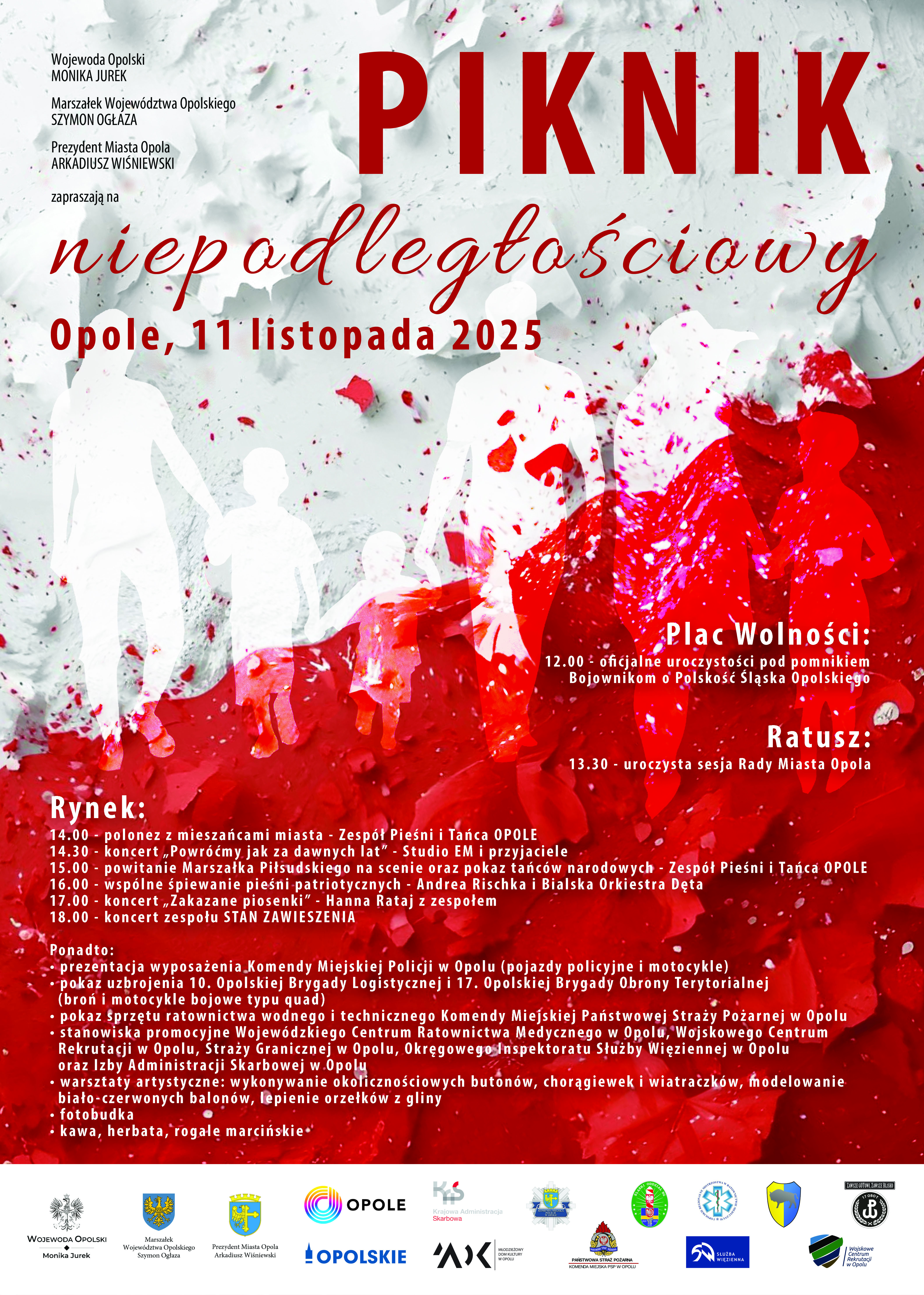 O 13:30 zaplanowano uroczystą sesję Rady Miasta Opola w Ratuszu, a od 14:00 na opolskim Rynku rozpocznie się Piknik Niepodległościowy – wspólne świętowanie z mieszkańcami, koncerty, pokaz sprzętu służb mundurowych oraz liczne atrakcje dla całych rodzin.