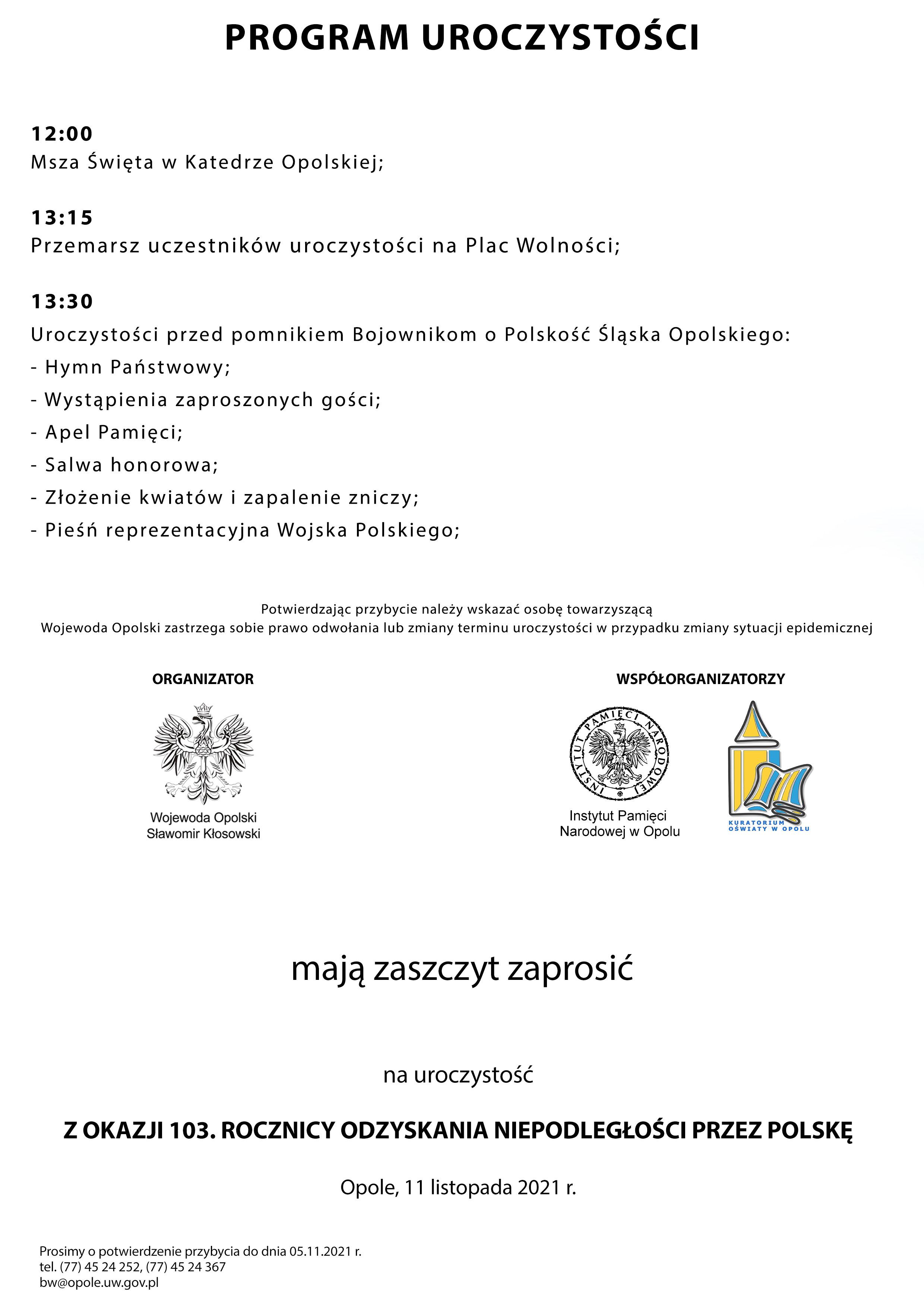 Już w najbliższy czwartek - 11 listopada, w Opolu uroczystości rozpoczną się od uroczystej mszy świętej w Katedrze. Tuż po niej, w okolicach 13.30 - po przemarszu na Plac Wolności, wojewoda opolski wraz z współorganizatorami, zaprasza do wzięcia udziału w oficjalnej części Święta.