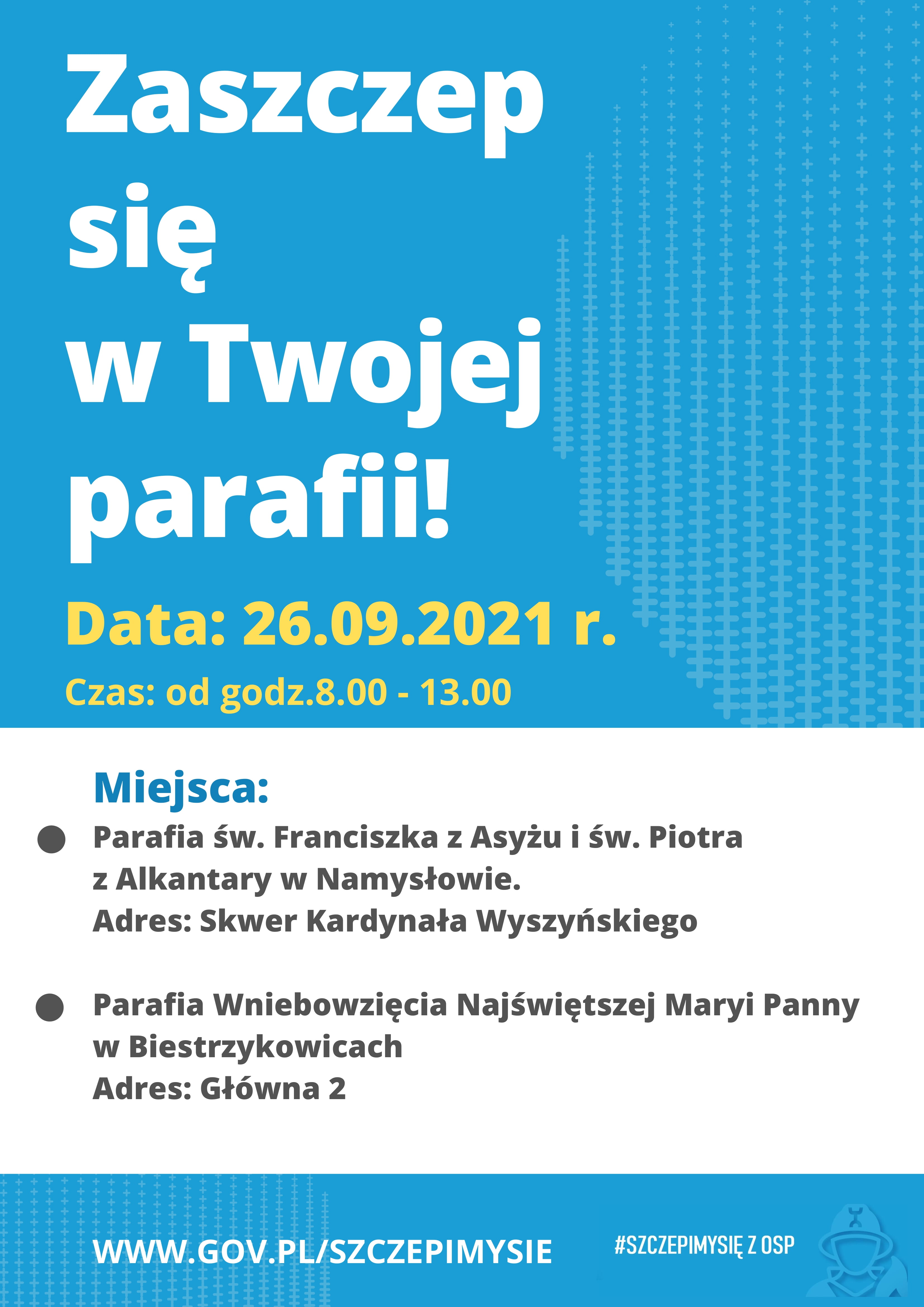 Kolejne parafie w regionie włączają się do Narodowego Programu Szczepień. Po sukcesie dotychczas przeprowadzonych akcji szczepień na terenie parochii Diecezji Opolskiej - podczas których ze szczepienia skorzystało nieco ponad 1800 osób - przyszedł czas na parafie diecezji wrocławskiej, ulokowane na terenie woj. opolskiego. Mowa o par. św. Franciszka z Asyżu i św. Piotra z Alkantary w Namysłowie, par. Wniebowzięcia Najświętszej Maryi Panny w Biestrzykowicach oraz o dwóch parafiach w Brzegu, tj. par. św. Mikołaja i par. pw. Podwyższenia Krzyża Świętego.