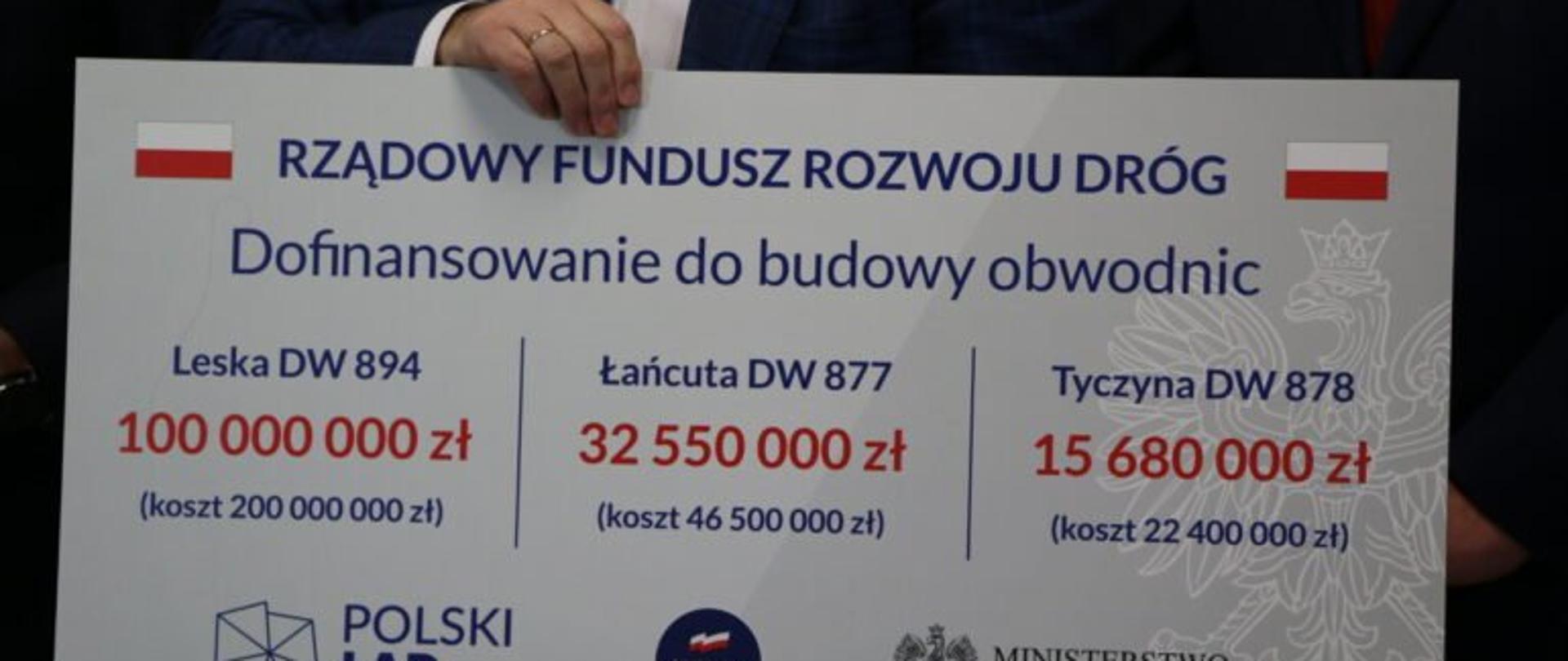 Budowa wschodniej obwodnicy Łańcuta zostanie zrealizowana w ciągu drogi wojewódzkiej nr 877 od węzła A4 „Łańcut” do drogi krajowej nr 94 w Głuchowie. Jej koszt całkowity wyniesie 46 mln złotych. Obwodnica będzie miała 3,4 km długości. Drugie zadanie to budowa obwodnicy Leska w ciągu drogi wojewódzkiej nr 894 od miejscowości Postołów do miejscowości Huzele. Całkowity koszt realizacji zadania wyniesie 182 mln złotych. Będzie to odcinek drogi o długości 3,7 km. W ramach obwodnicy ma powstać również most na Sanie. Obwodnica Tyczyna zostanie zrealizowana w ciągu drogi wojewódzkiej nr 878. Szacunkowy koszt zadania ma wynieść 22 mln złotych. Odcinek ma liczyć 1,5 km i będzie jednojezdniową drogą o klasie G, z dwoma pasami o szerokości pasa 3,5 m.
