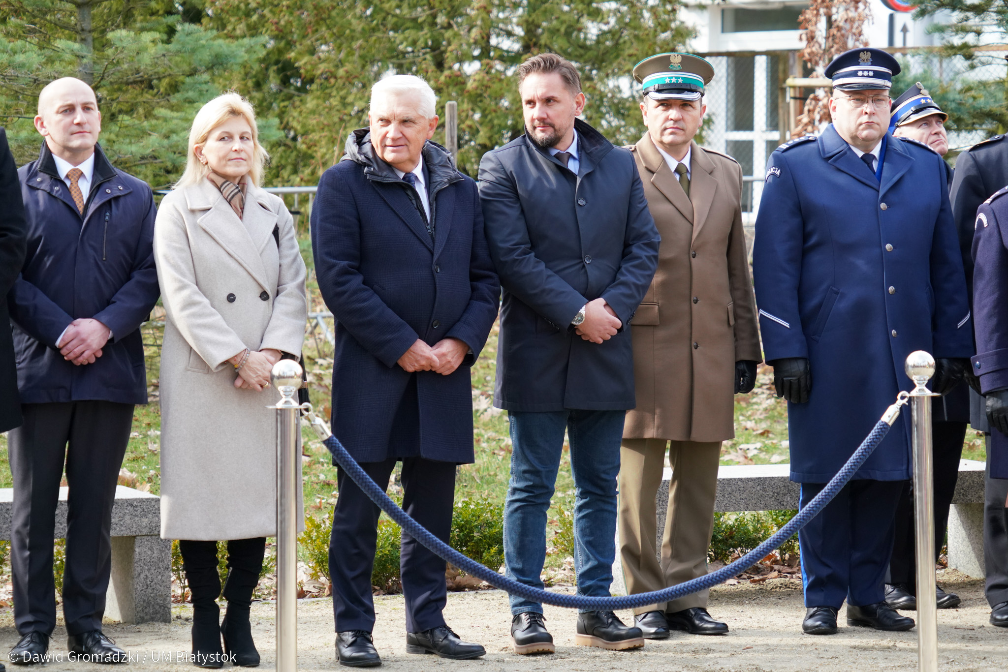 W uroczystości wzięli udział m.in. parlamentarzyści RP, przedstawiciele władz samorządowych i rządowych, służb mundurowych, kombatantów, harcerze i mieszkańcy Białegostoku.