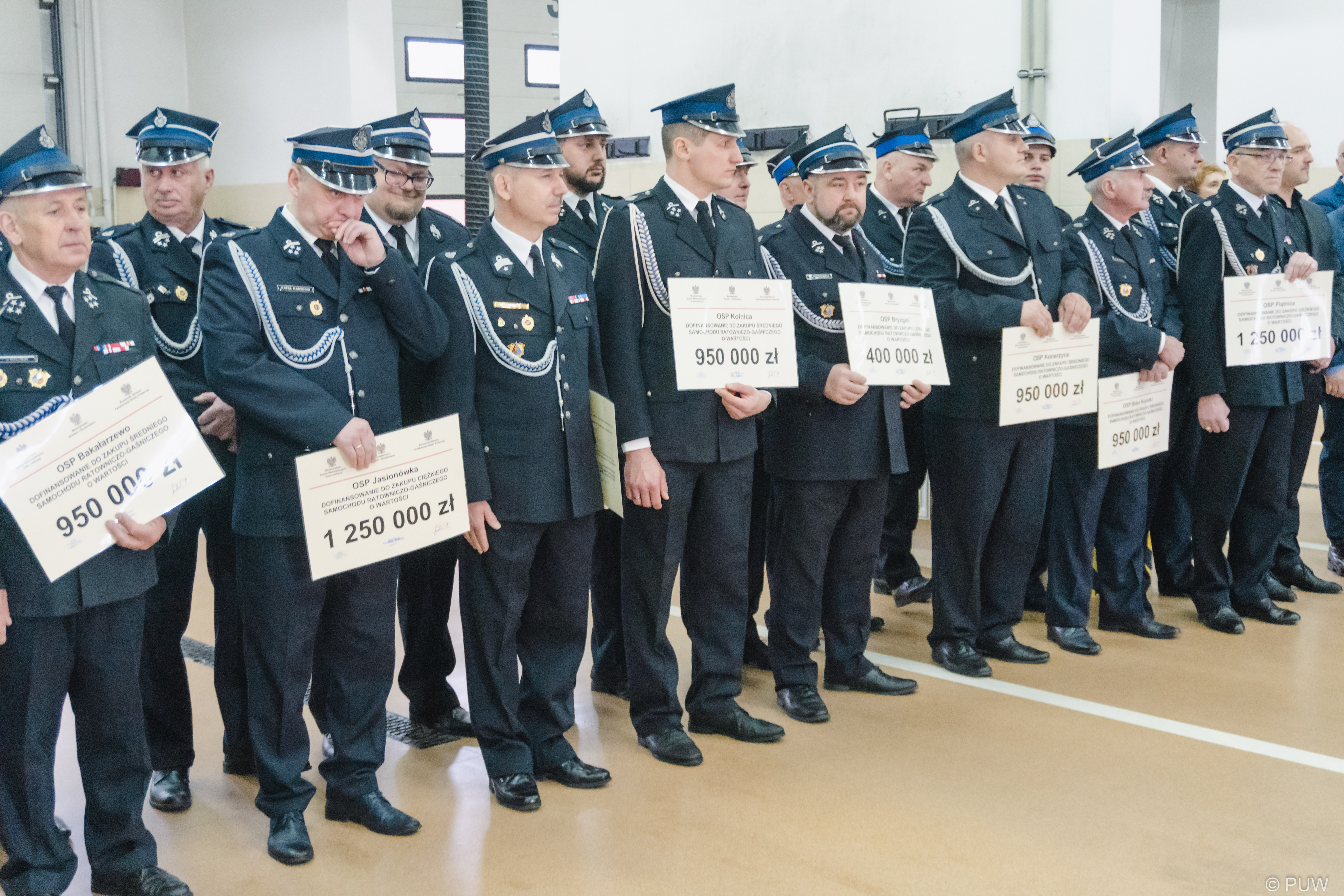Podczas sobotniej uroczystości w Komendzie Miejskiej PSP w Łomży promesy na zakup nowych samochodów odebrali przedstawiciele 12 jednostek OSP: Jasionówka, Jaświły (powiat moniecki), Kolnica, Bryzgiel (powiat augustowski), Wąsosz (powiat grajewski), Stare Kupiski, Piątnica, Konarzyce (powiat łomżyński), Przerośl, Bakałarzewo (powiat suwalski), Wiśniewo i Pęchratka Polska (powiat zambrowski).