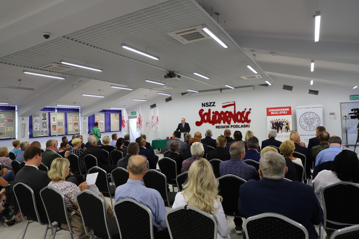 Część konferencyjna obchodów odbyła się w siedzibie Zarządu Regionu NSZZ "Solidarność" przy ul. Suraskiej 1. Wszystkich zgromadzonych powitał dr hab. Krzysztof Sychowicz - naczelnik Oddziałowego Biura Badań Historycznych IPN w Białymstoku, który wprowadził również audytorium w tło historyczne wydarzeń sprzed 42 lat. Następnie głos zabrał gospodarz miejsca Józef Mozolewski - przewodniczący Zarządu Regionu Podlaskiego NSZZ Solidarność, który podziękował wszystkim za przybycie, podziękował Instytutowi Pamięci Narodowej za owocną, długoletnią współpracę i uhonorował 3 członków NSZZ Solidarność, którzy odchodzą z zarządu, a wyróżniali się szczególnym zaangażowaniem.