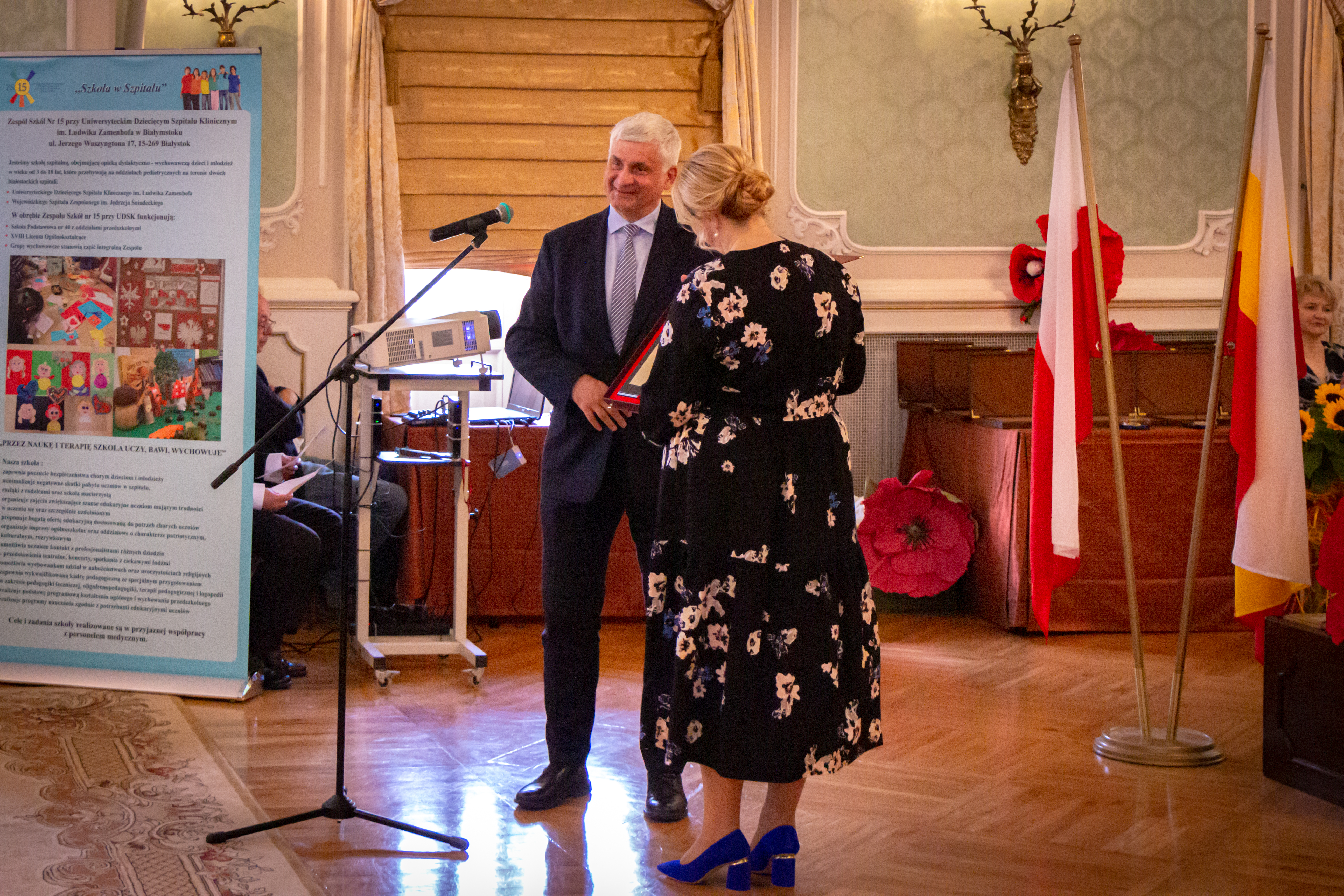 Główna część uroczystości odbyła się w środę (15.09) w Auli Magna Pałacu Branickich. Zebrani goście mogli poznać historię placówki oraz obejrzeć część artystyczną w wykonaniu nauczycieli szpitalnej szkoły. Wojewoda podlaski Bohdan Paszkowski pogratulował 60-lecia, wręczając pamiątkowy grawerton p.o. dyrektora Zespołu Szkół nr 15 Elżbiecie Sokólskiej. Uznanie dla rozwoju i sukcesów placówki wyraziła również Beata Pietruszka - podlaski kurator oświaty.