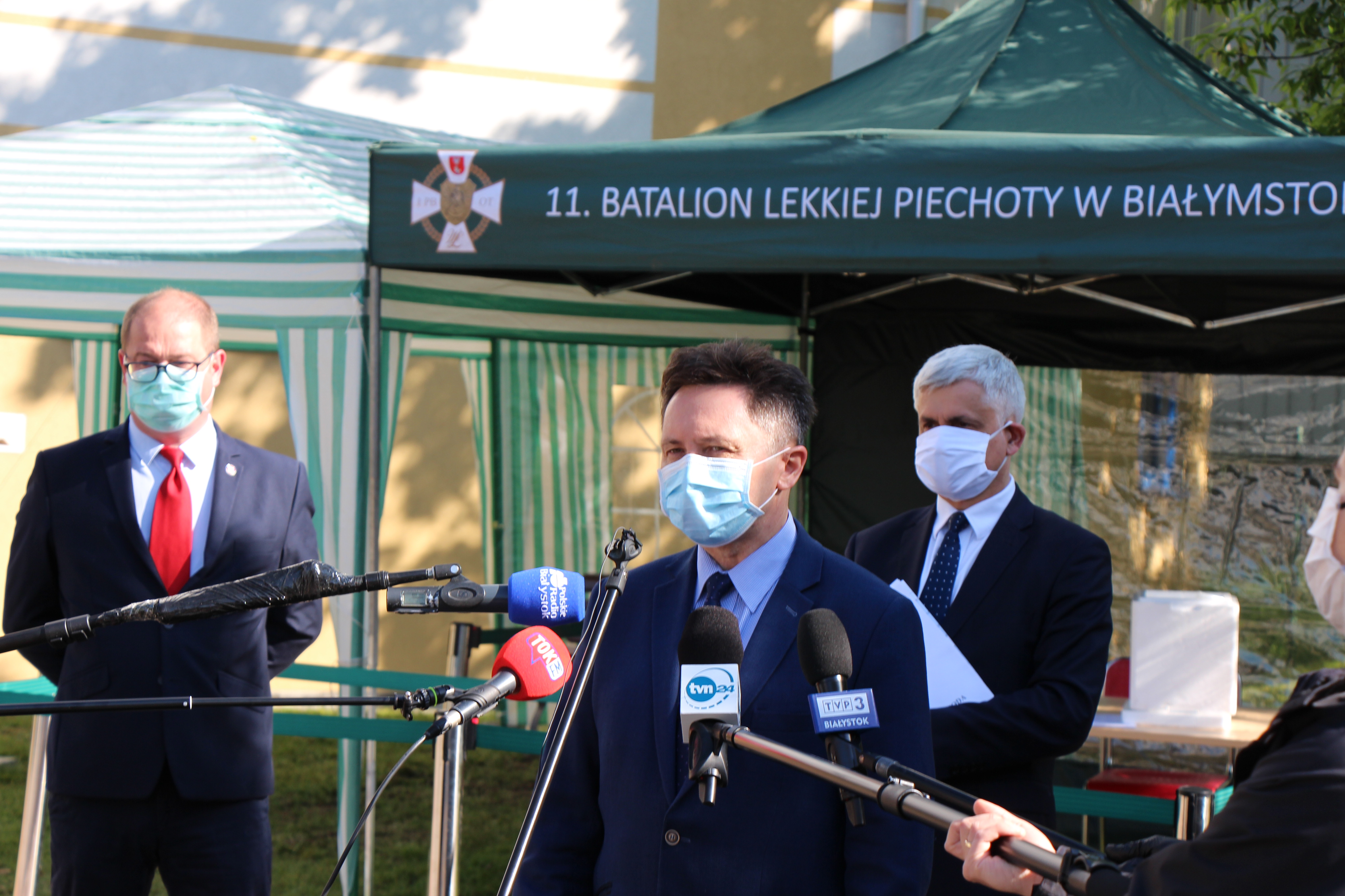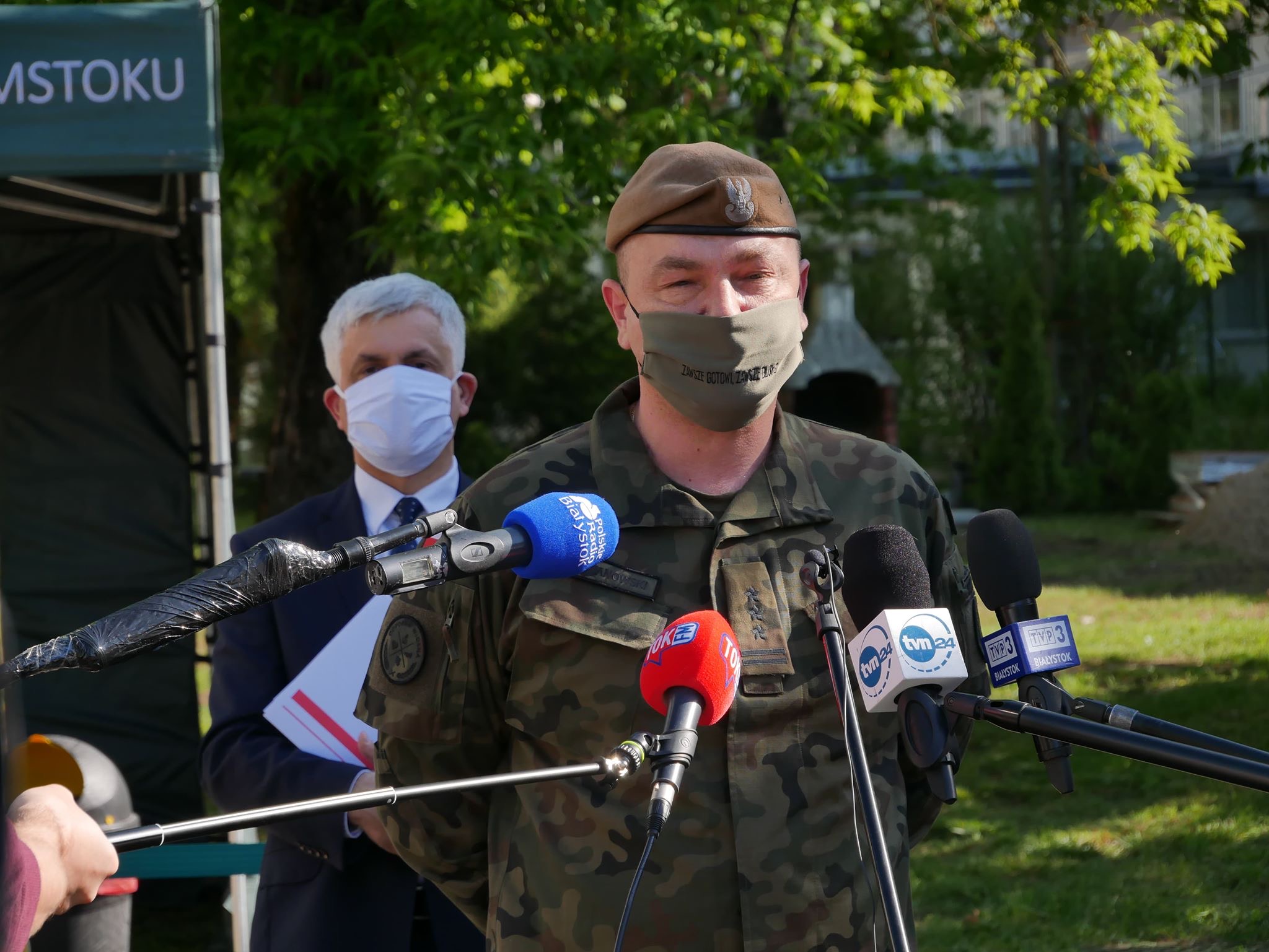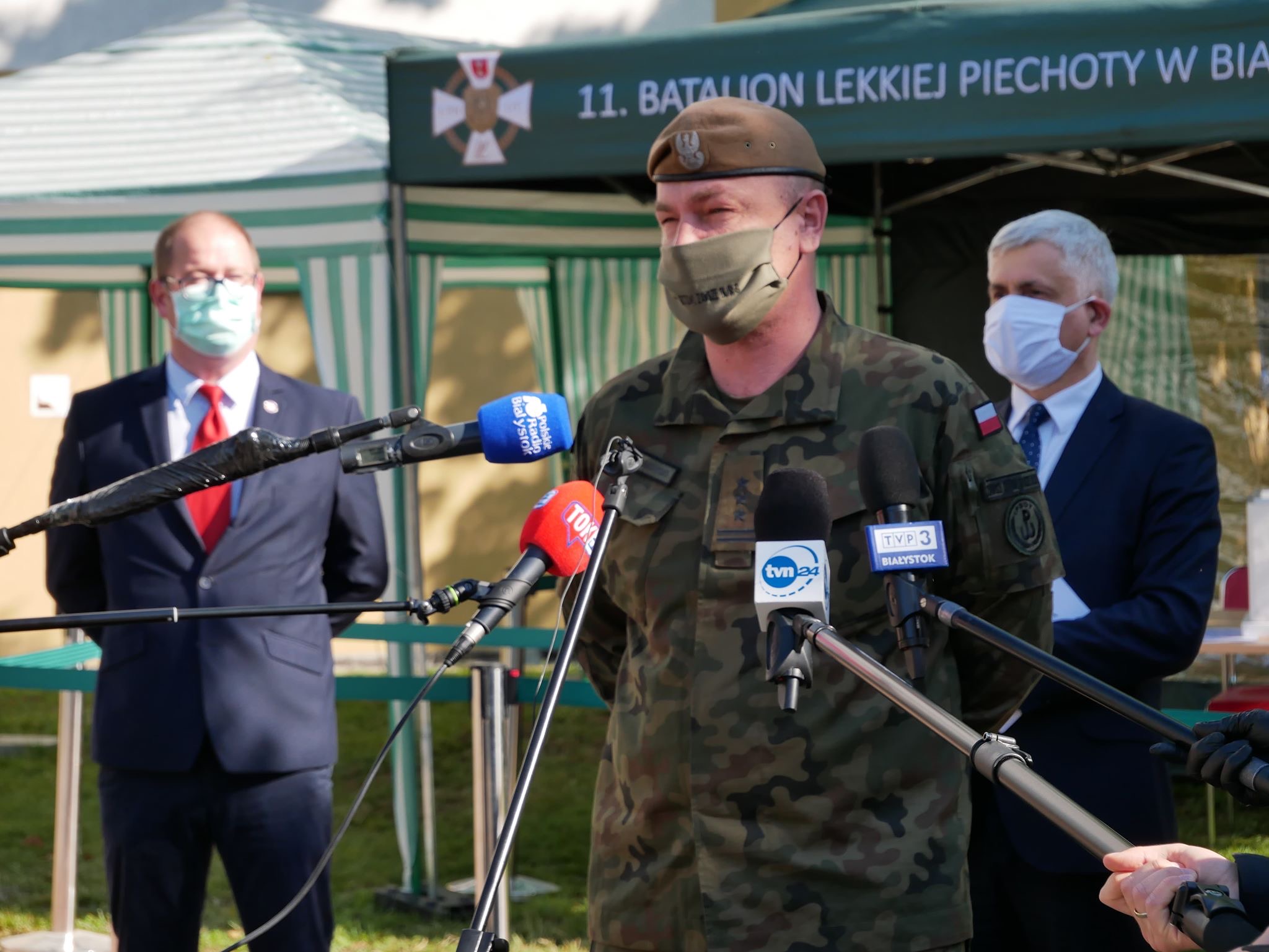 - Mamy do dyspozycji 11 zespołów wymazowych. Działamy nie tylko na terenie województwa podlaskiego - dziś jeden zespół jest również na Śląsku, wcześniej wspieraliśmy także województwo mazowieckie - przekazał dowódca 1. PBOT płk Sławomir Kocanowski.