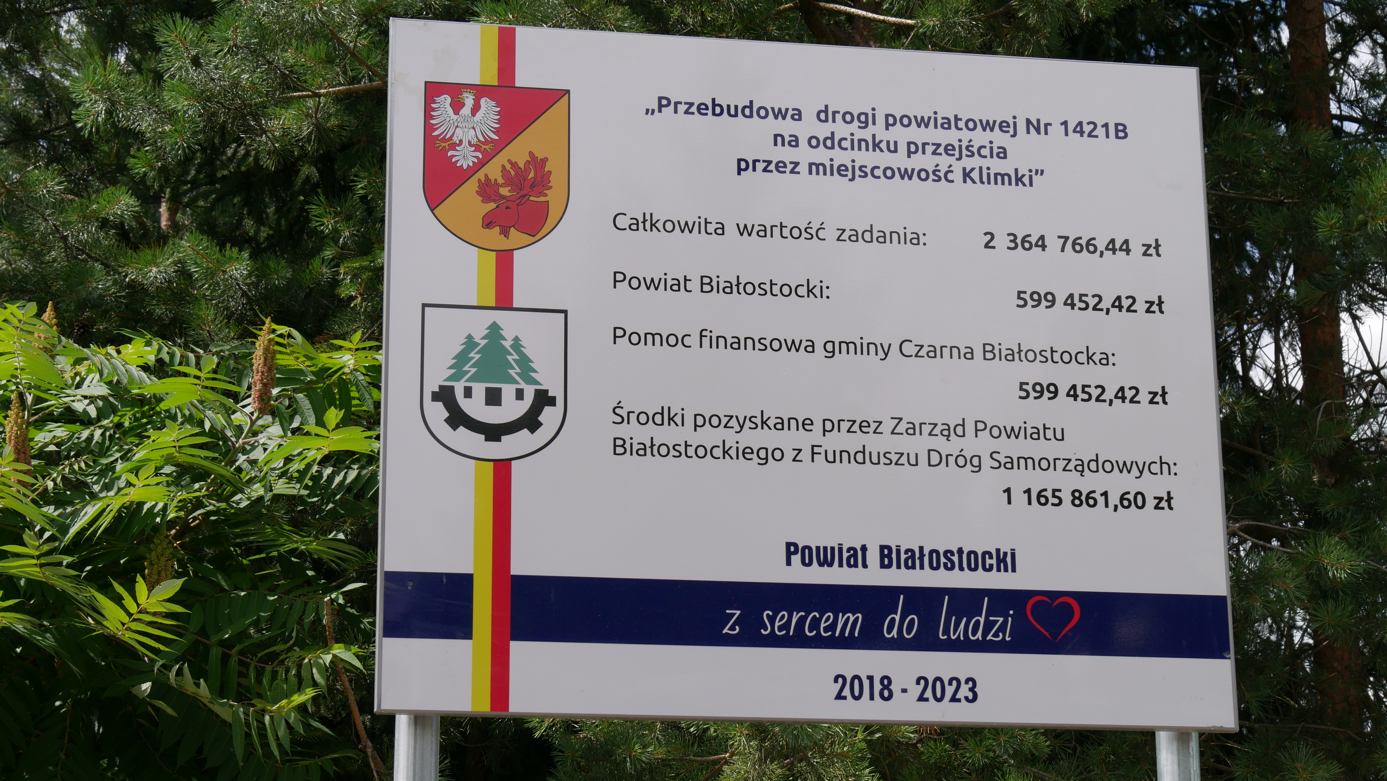 Całkowity koszt budowy nowej drogi w miejscowości Klimki to ponad 2,3 mln zł. Prawie 600 tys. z własnego budżetu wygospodarował powiat białostocki, tyle samo dołożyła gmina Czarna Białostocka, reszta - prawie 1,2 mln zł - to wsparcie z Funduszu Dróg Samorządowych.
