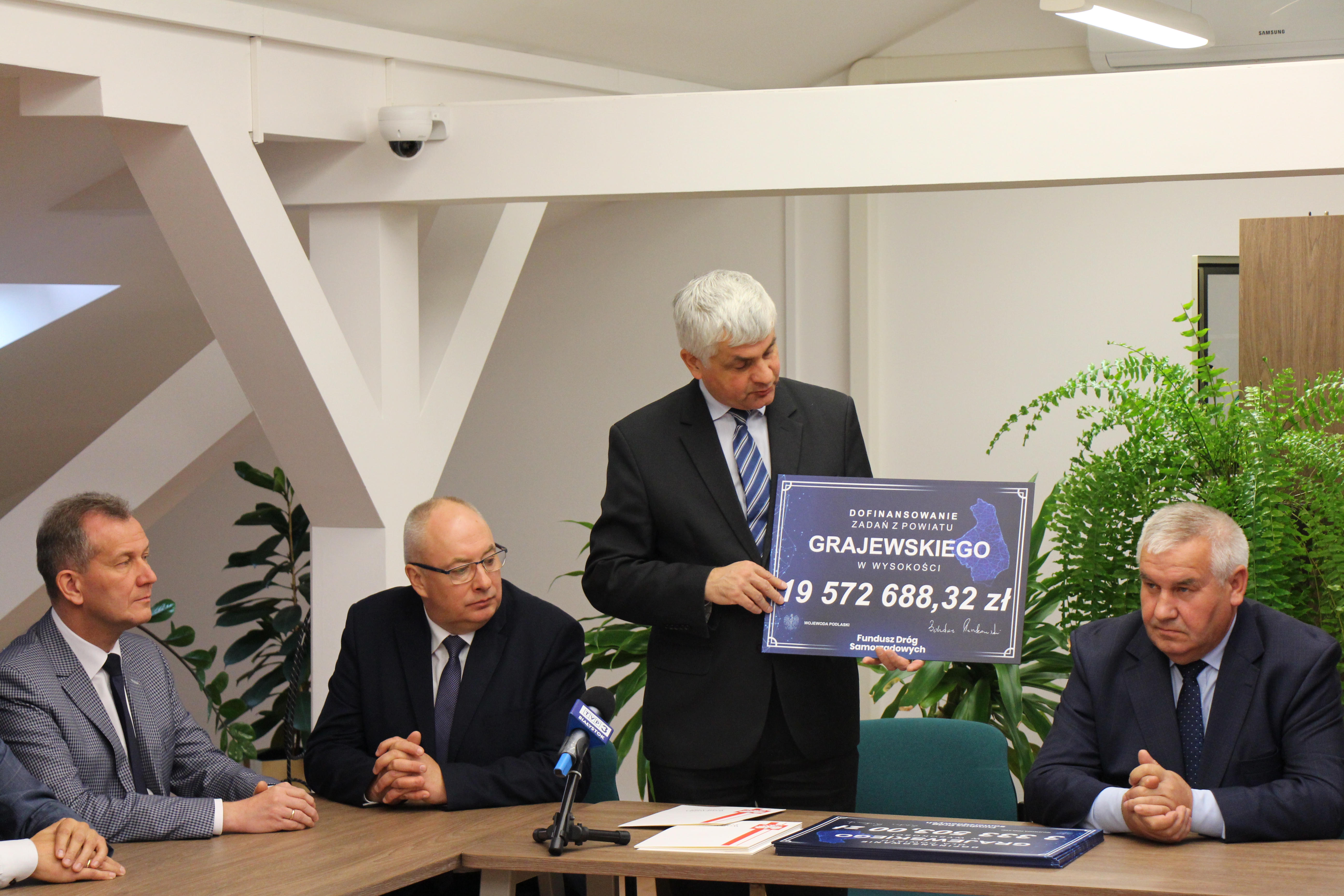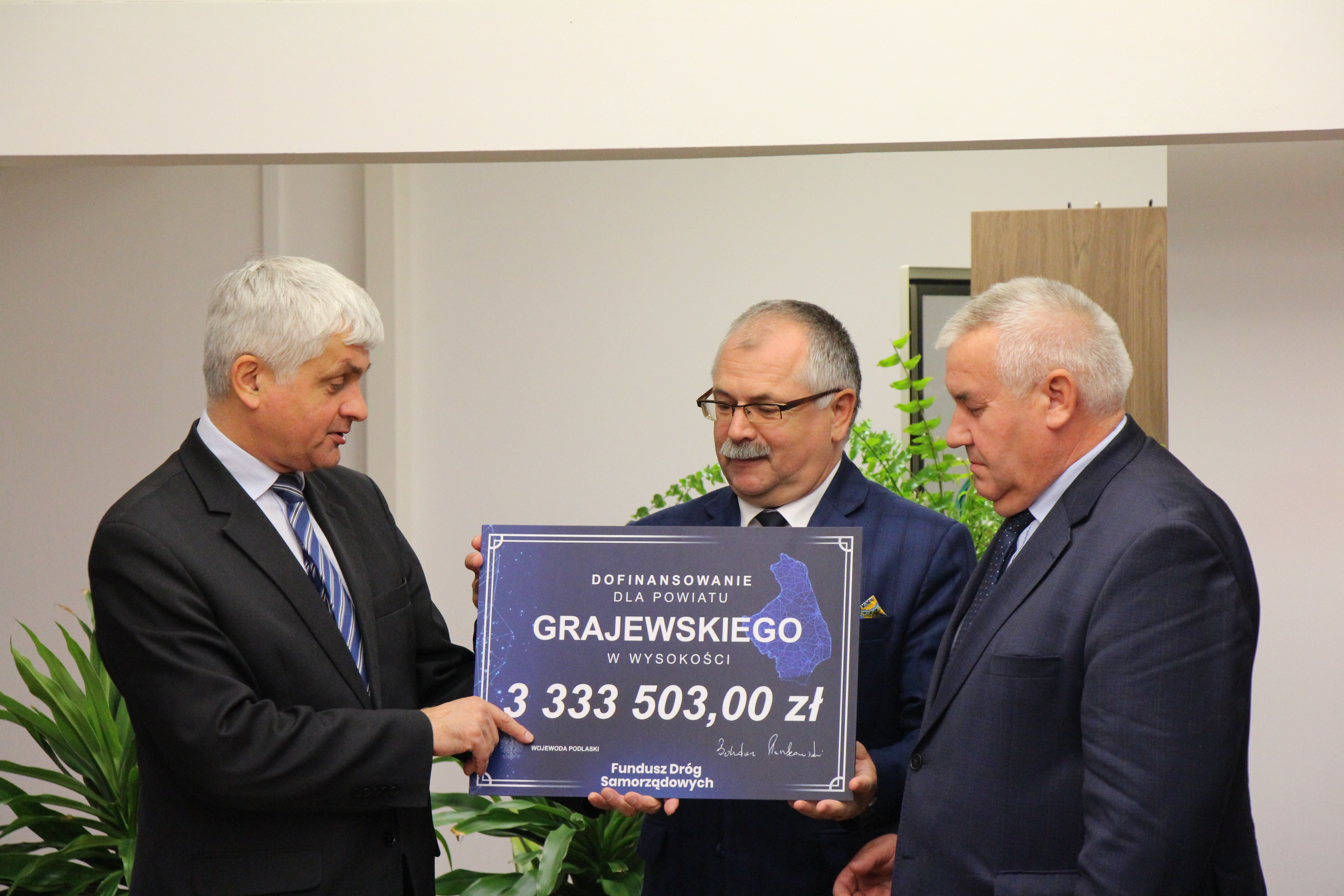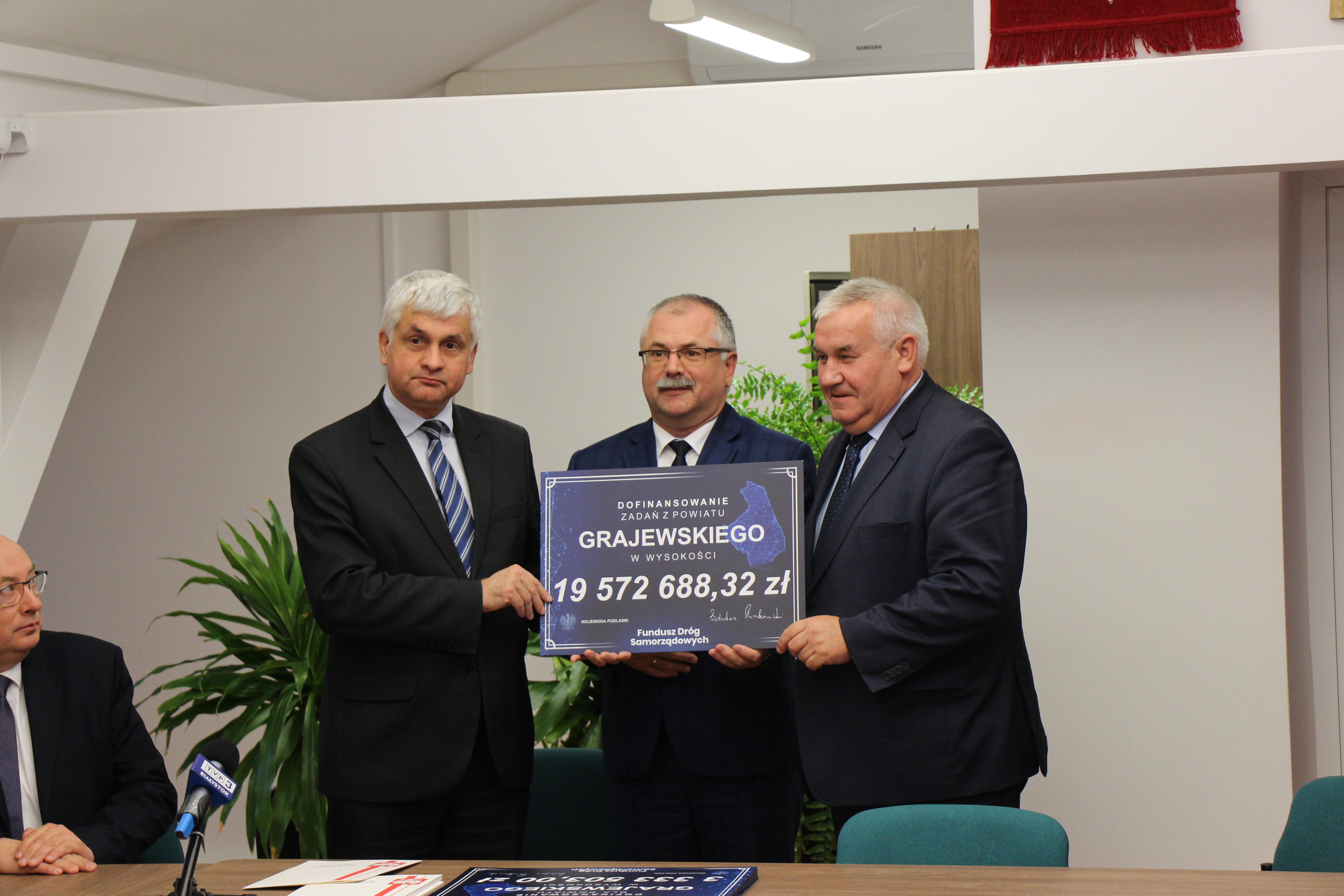 Blisko 20 mln zł na remont i przebudowę dróg otrzymał we wtorek powiat grajewski i sześć gmin z jego terenu. „Pozwoli to zrealizować samorządom inwestycje, które bez rządowego wsparcia byłyby niemożliwe” – mówił wojewoda podlaski Bohdan Paszkowski, który we wtorek wręczył samorządowcom symboliczne czeki Funduszu Dróg Samorządowych.