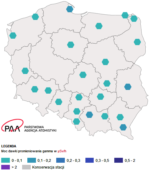 Poniżej mapa aktualnych mocy dawki promieniowania gamma na stacjach wczesnego wykrywania skażeń promieniotwórczych w Polsce.