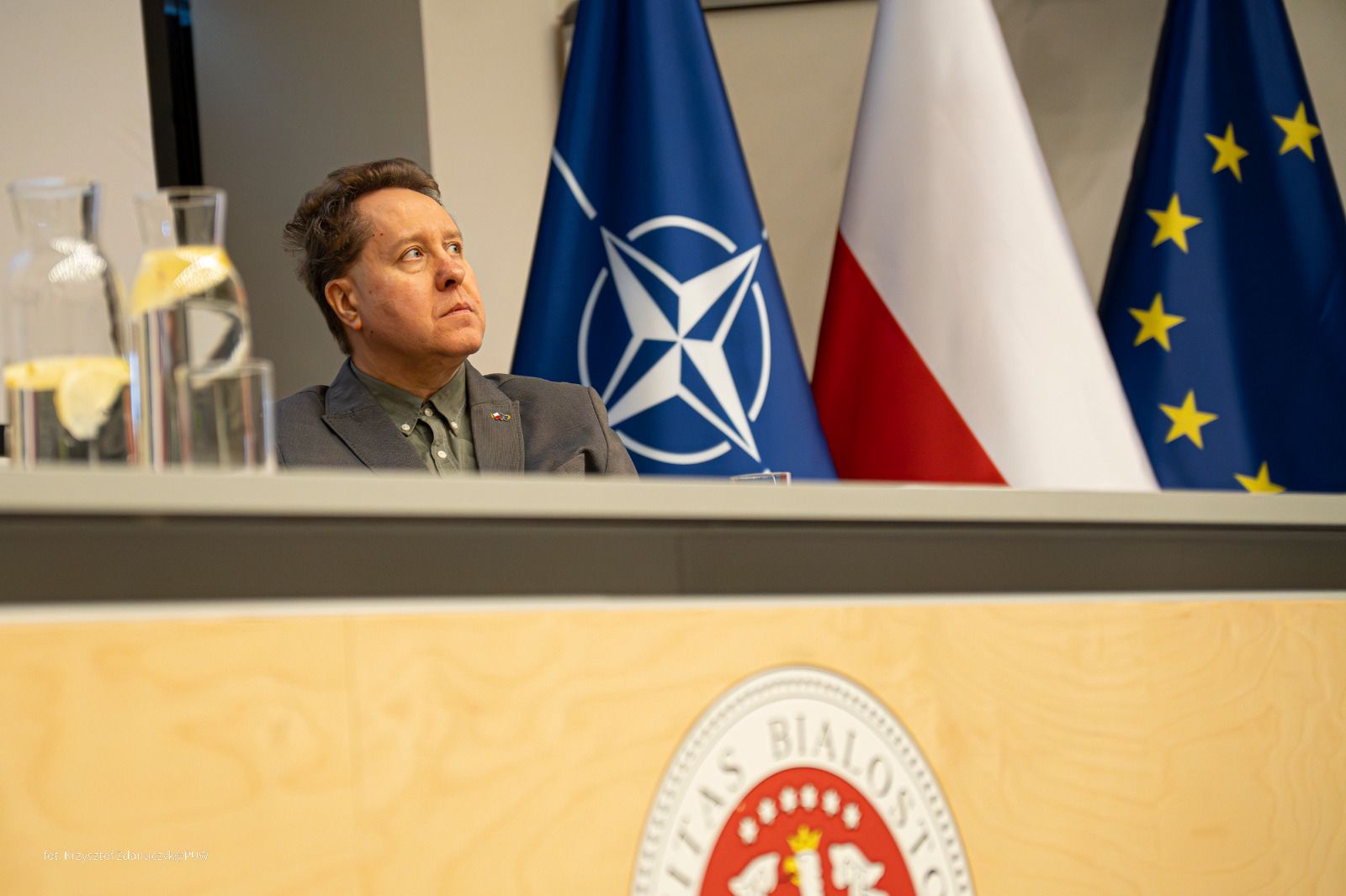 - Cieszę się, że w dniu, w którym powinniśmy podkreślać rolę i znaczenie Paktu Północnoatlantyckiego, a także miejsce Polski w strukturze tej organizacji, możemy spotkać się na Wydziale Stosunków Międzynarodowych UwB, ponieważ wydaje mi się, że to jest to miejsce, w którym powinniśmy rozmawiać o problemach współczesnego świata – mówił na wstępie wojewoda Jacek Brzozowski.