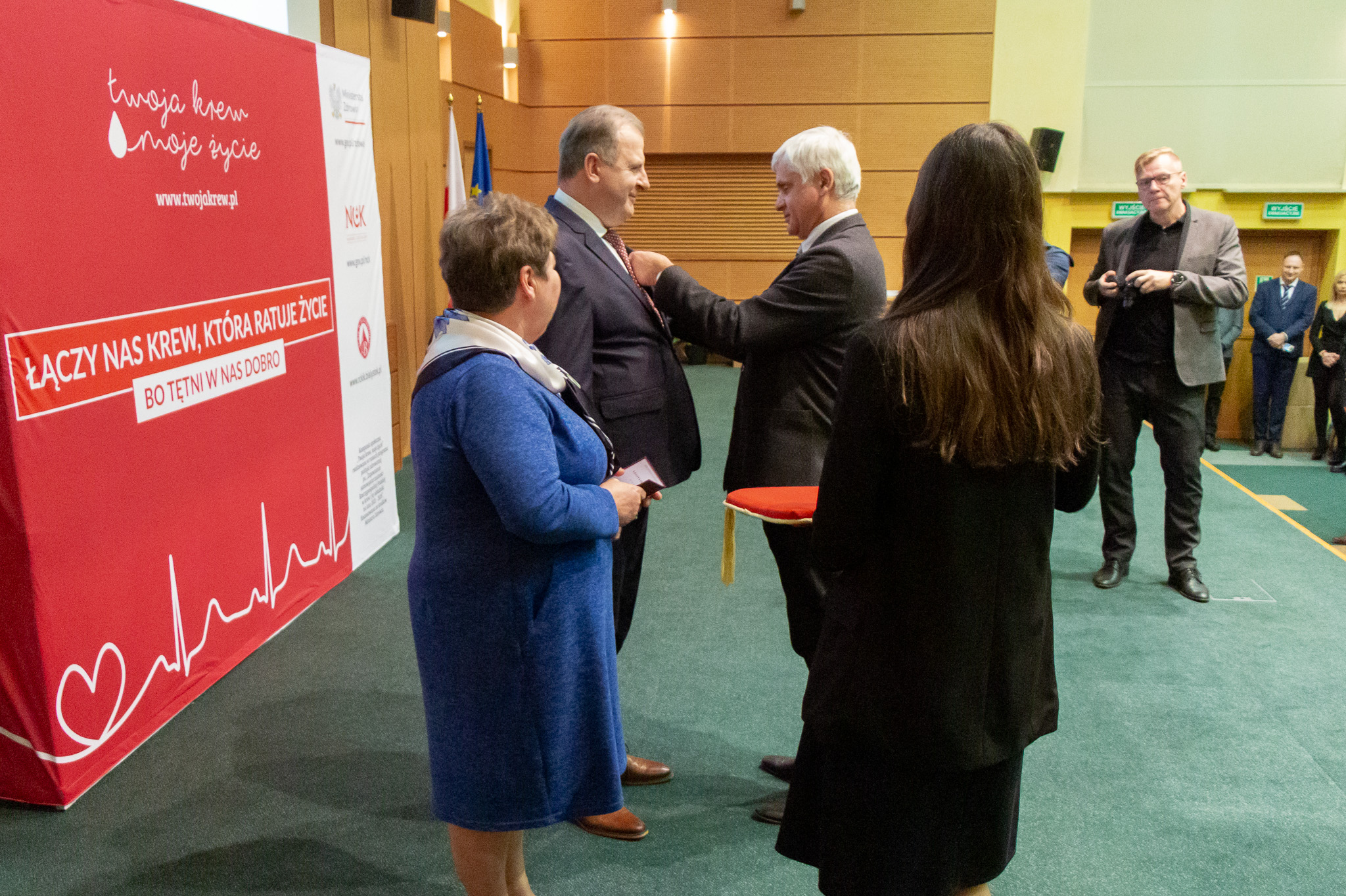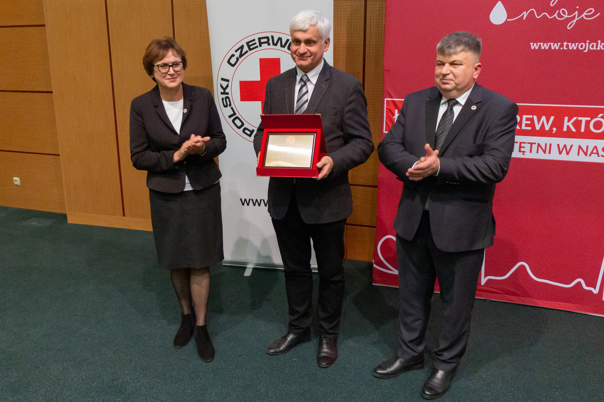 Wojewoda wręczył Brązowy Krzyż Zasługi, przyznany na jego wniosek przez prezydenta Andrzeja Dudę za zasługi na rzecz honorowego krwiodawstwa oraz za propagowanie idei czerwonokrzyskiej, Alinie Miszczuk i Wojciechowi Brzozowskiemu.