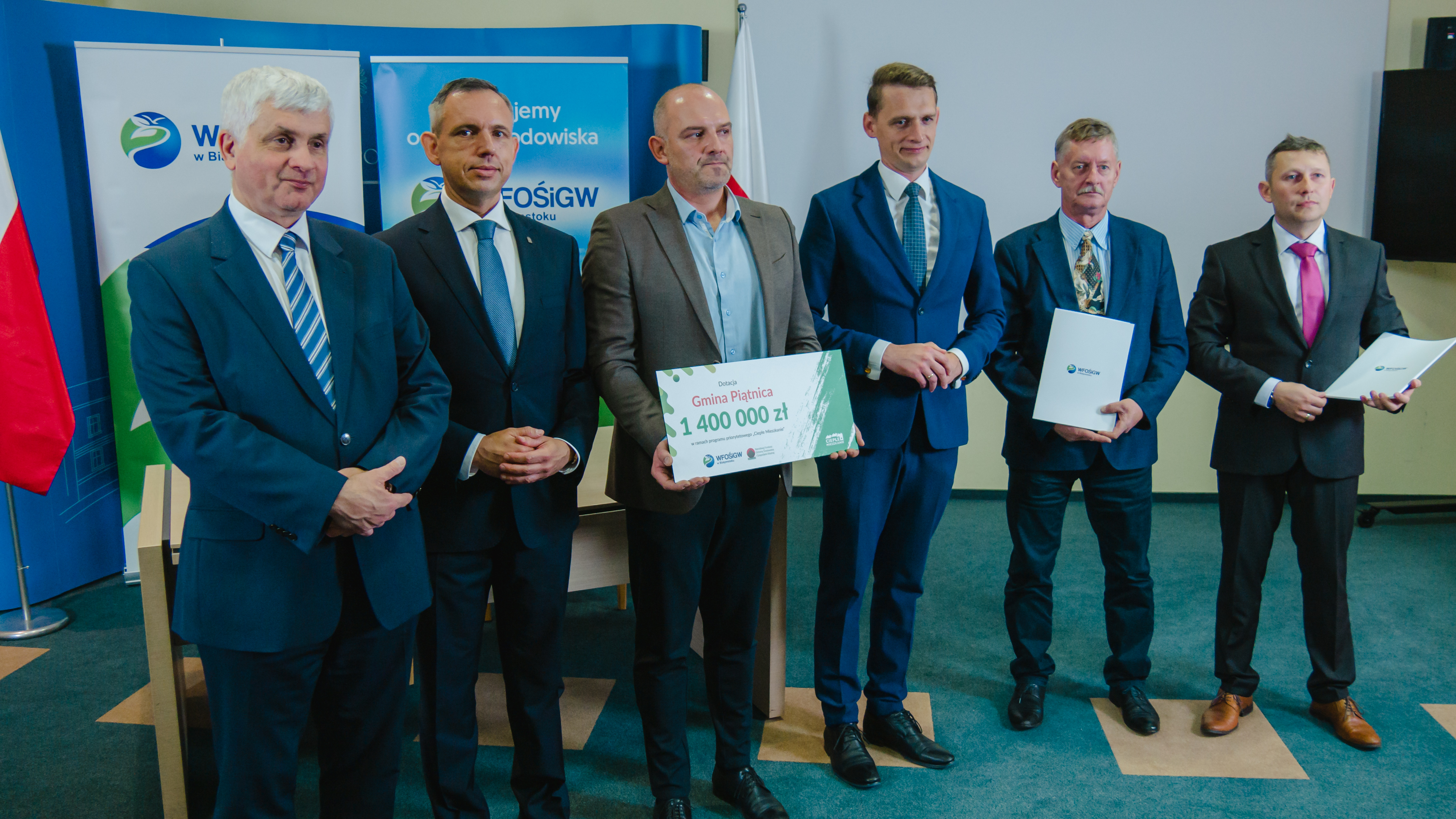 Wiceprezes NFOŚiGW, a od niedawna także pełnomocnik premiera ds. programu "Czyste Powietrze" Paweł Mirowski wręczył symboliczny czek na sumę 1,4 mln zł wójtowi gminy Piątnica Arturowi Wierzbowskiemu. Gmina została w ten sposób premierowym w województwie podlaskim beneficjentem programu "Ciepłe Mieszkanie", skierowanego do właścicieli mieszkań w budynkach wielorodzinnych, a będącego uzupełnieniem projektu "Czyste Powietrze".