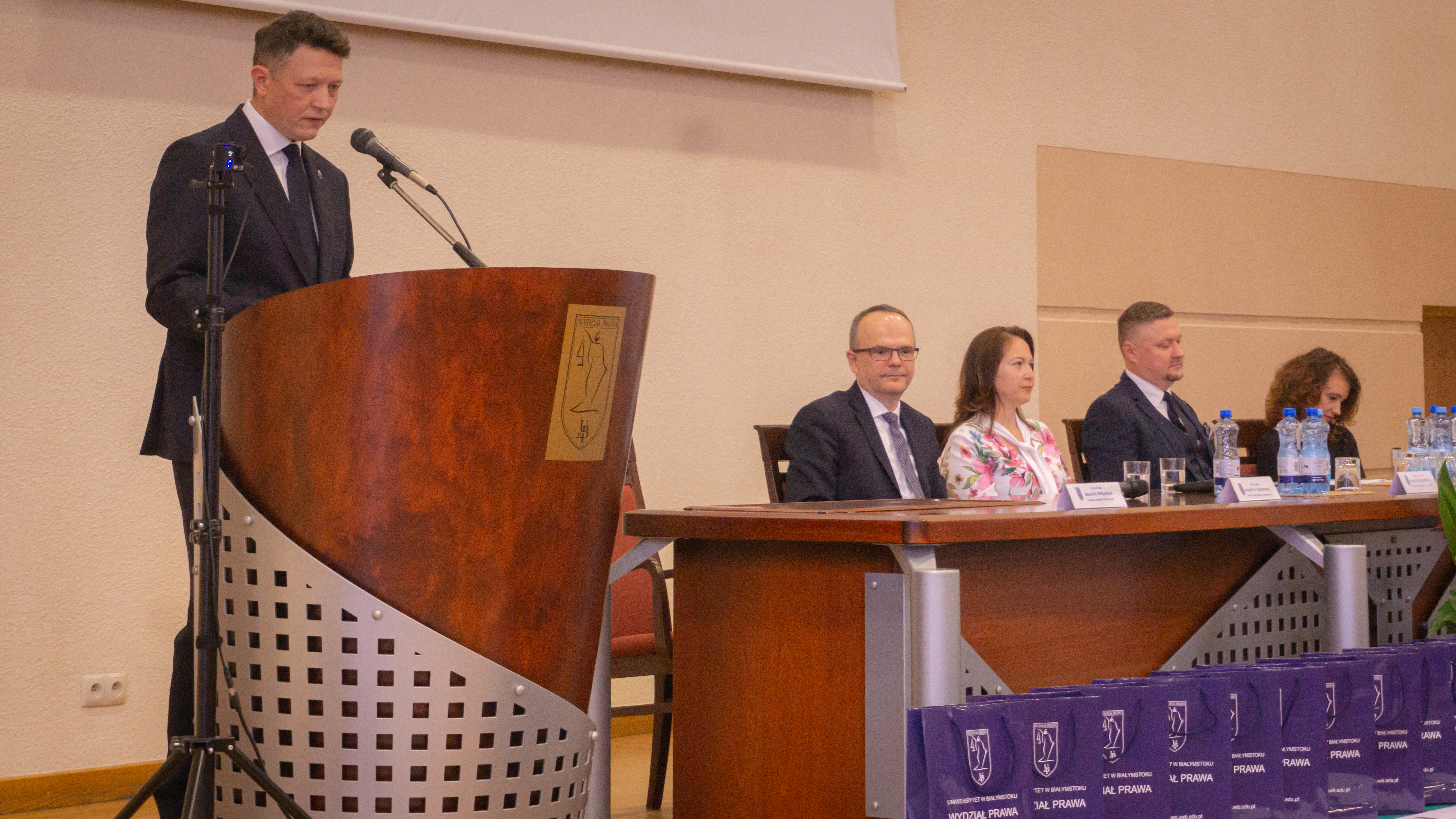 Studentów i zaproszonych gości powitał dziekan Wydziału Prawa UwB prof. Mariusz Popławski, a następnie głos zabrał rektor Uniwersytetu w Białymstoku prof. Robert Ciborowski.