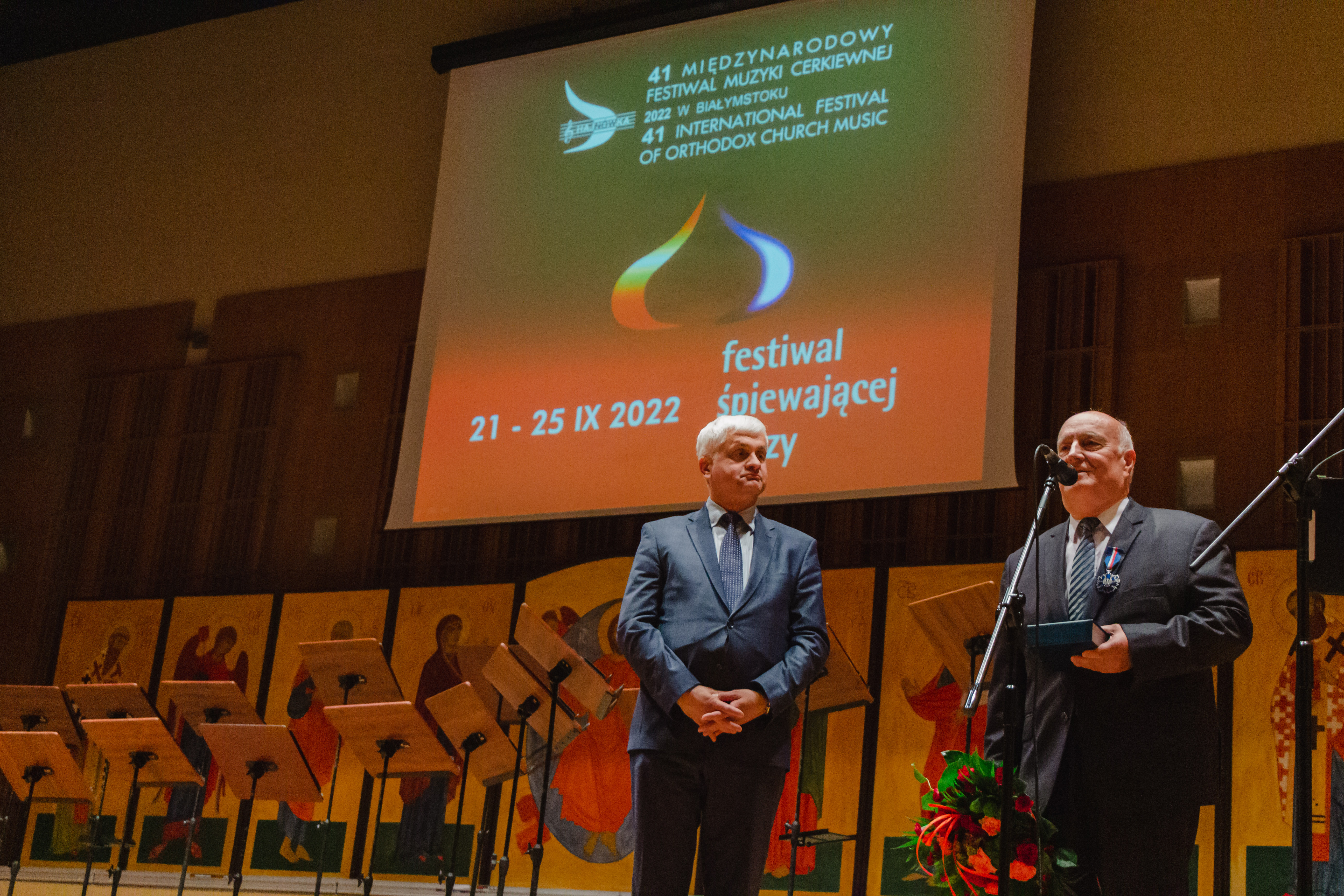 Koncert chóru Filharmonii Częstochowskiej „Collegium Cantorum” pod batutą Janusza Siadlaka rozpoczął w środę (21.09) w Białymstoku 41. Międzynarodowy Festiwal Muzyki Cerkiewnej „Hajnówka 2022”. Przed występem artystów wojewoda podlaski Bohdan Paszkowski wręczył Andrzejowi Dyrdałowi, wieloletniemu dyrektorowi Wojewódzkiego Ośrodka Animacji Kultury, Srebrny Medal „Zasłużony Kulturze Gloria Artis”.