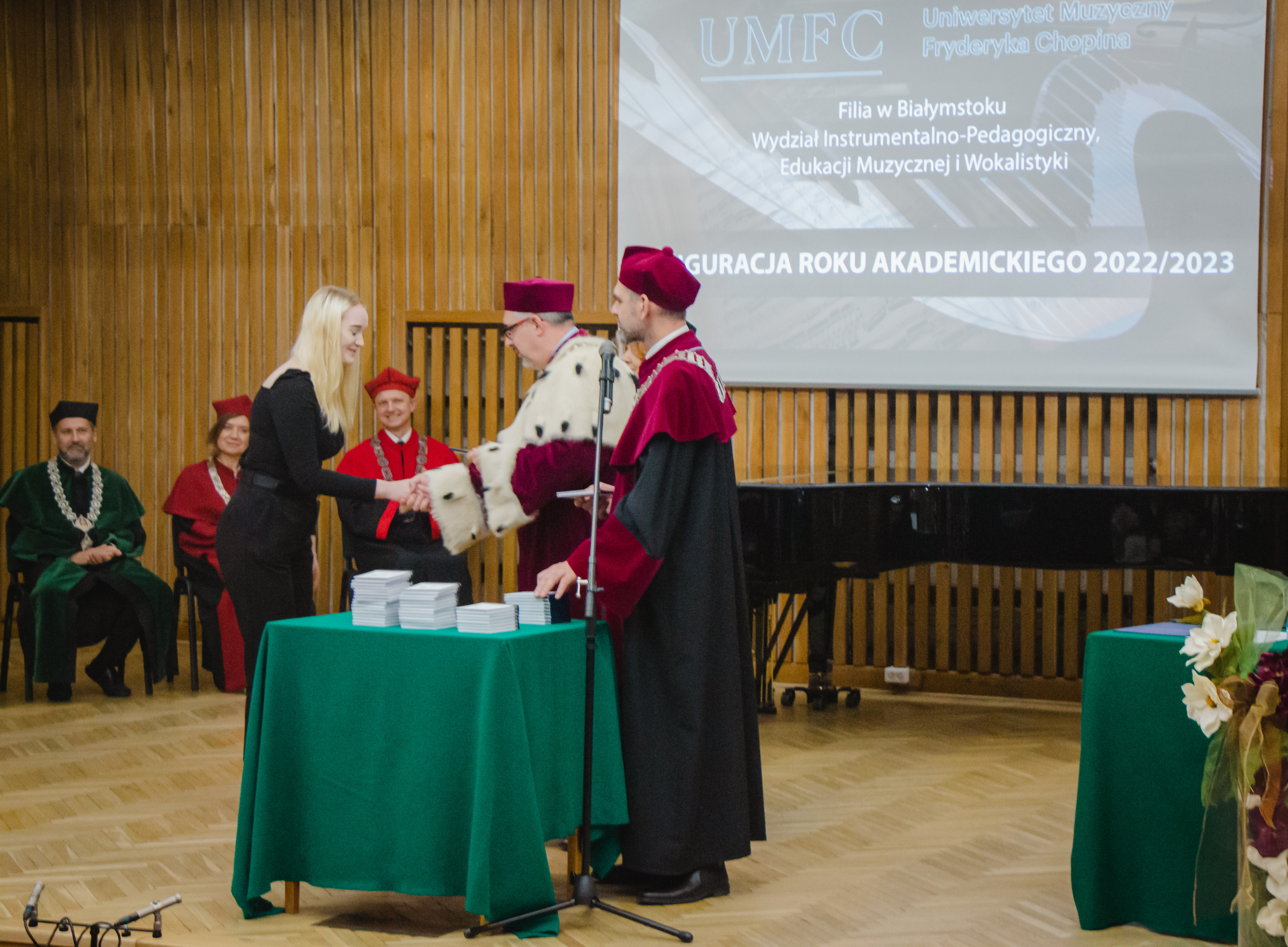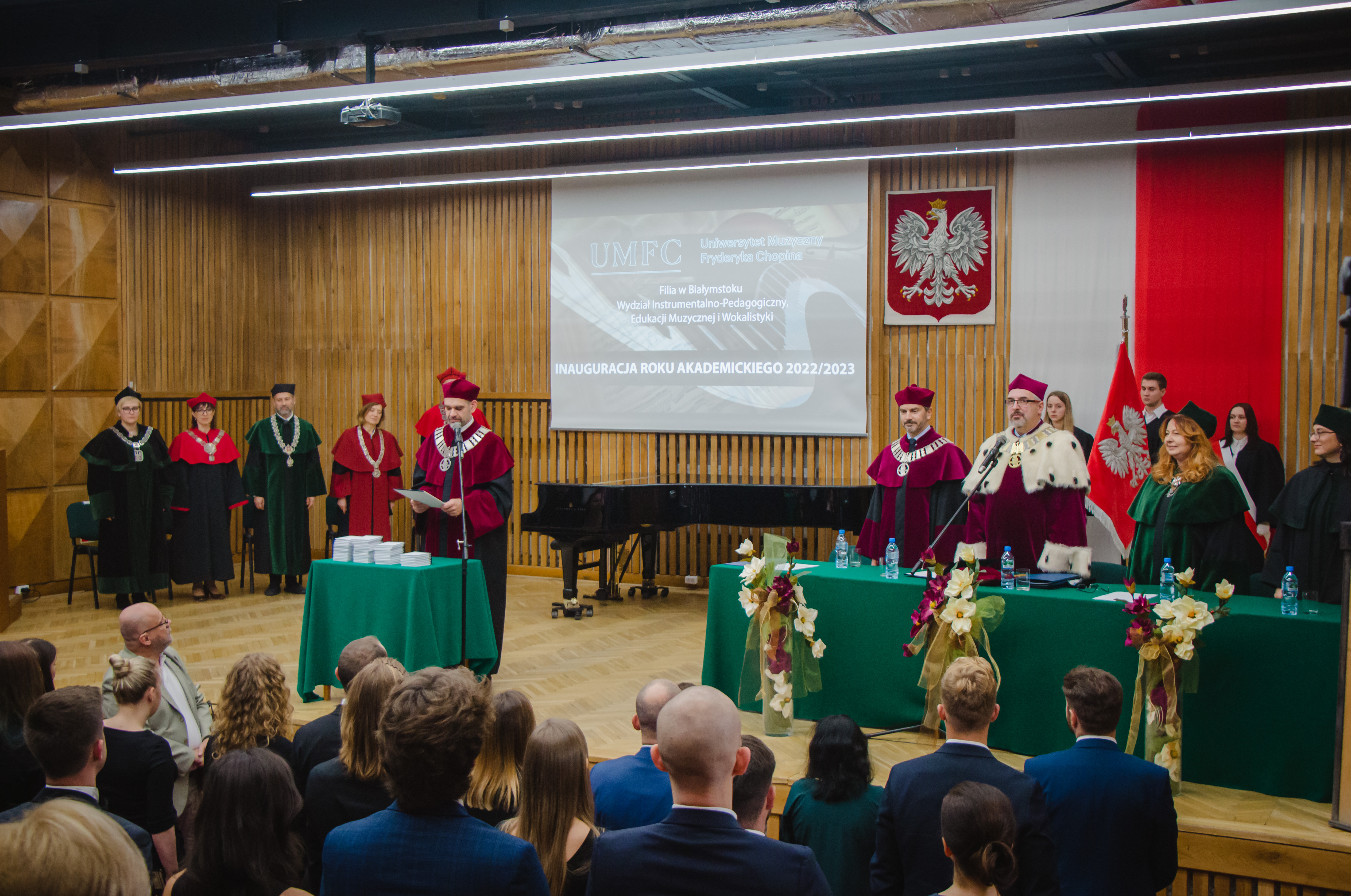Prawie 60 nowych studentów rozpoczęło naukę na białostockiej filii Uniwersytetu Muzycznego Fryderyka Chopina. Uczelnia kształci w sumie ponad 150 osób na trzech kierunkach: Instrumentalistyka, Wokalistyka i Edukacja artystyczna. We wtorek (11.10) w uroczystej inauguracji roku akademickiego wzięli udział wojewoda podlaski Bohdan Paszkowski i wicewojewoda Tomasz Madras.