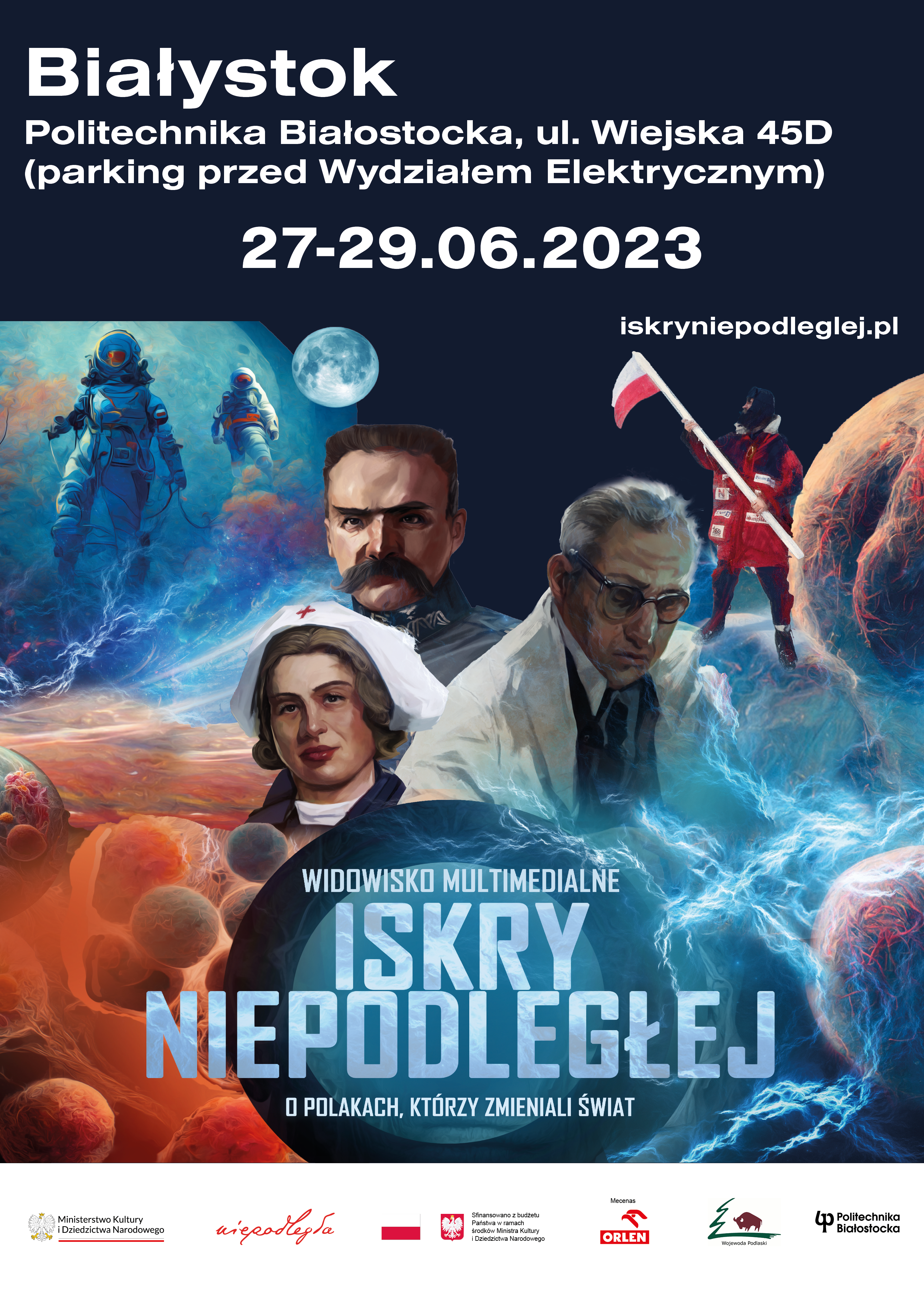 ISKRY NIEPODLEGŁEJ to nowoczesny spektakl multimedialny Biura „Niepodległa” umieszczony w specjalnie zaprojektowanej naczepie ekspozycyjnej, która może podróżować po całej Polsce. Od 27 do 29 czerwca zatrzyma się przy Politechnice Białostockiej, gdzie każdy będzie mógł za pomocą nowoczesnych technologii wizualnych poznać fakty i postaci tworzące niesamowitą opowieść o potencjale naszej polskiej wspólnoty. Serdecznie zapraszamy!