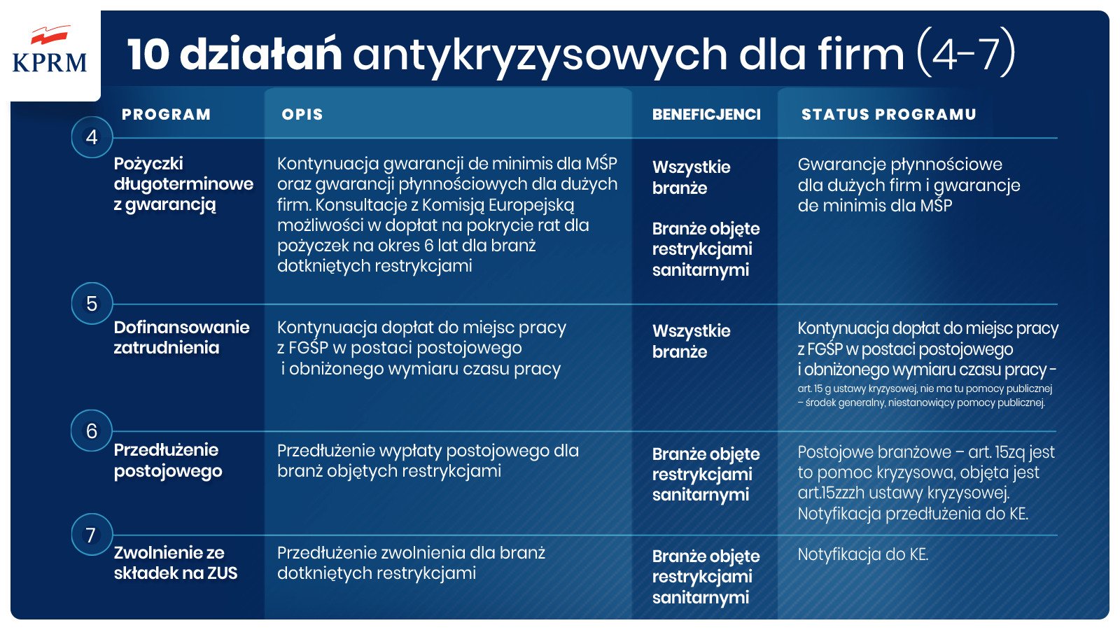- Kontynuacja gwarancji de minimis dla MŚP oraz gwarancje płynnościowe dla dużych firm. Z Komisją Europejską będziemy konsultować możliwości dopłat na pokrycie rat dla pożyczek na 6 lat dla branż dotkniętych restrykcjami.
