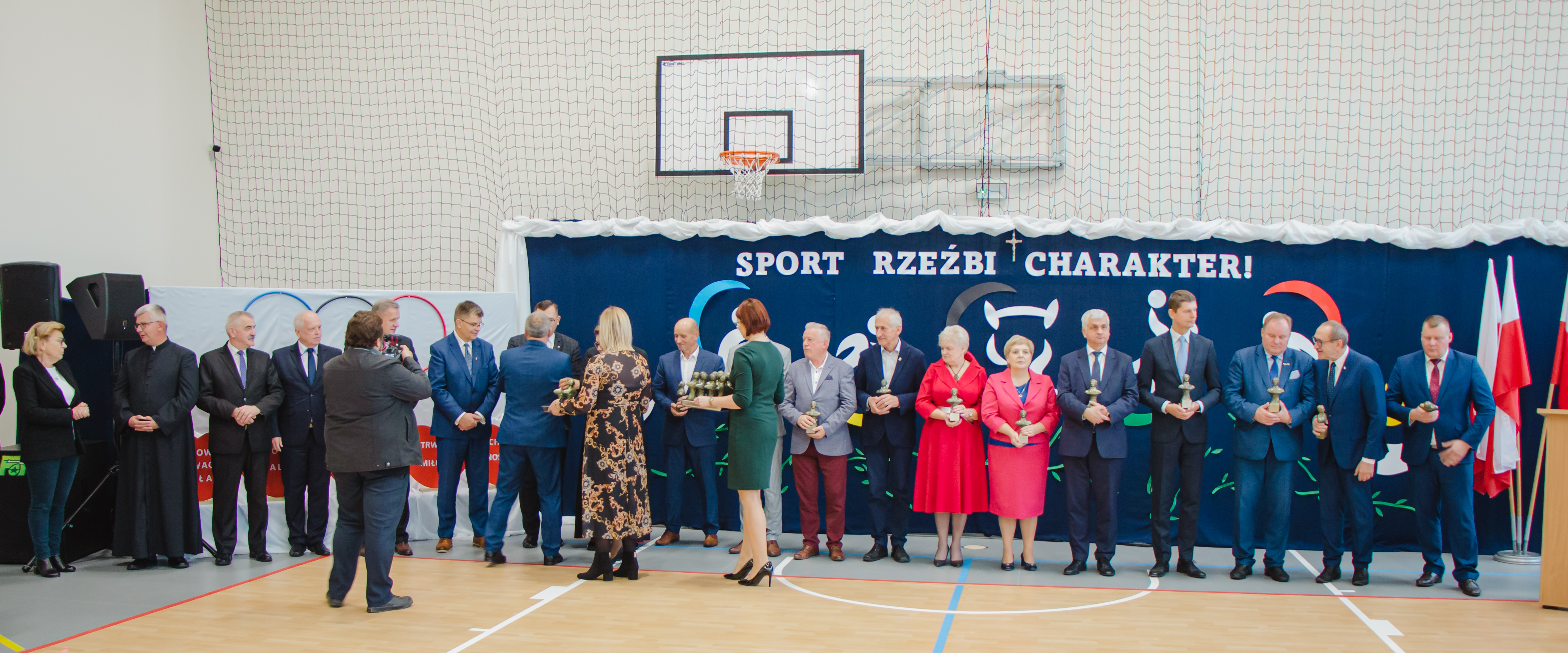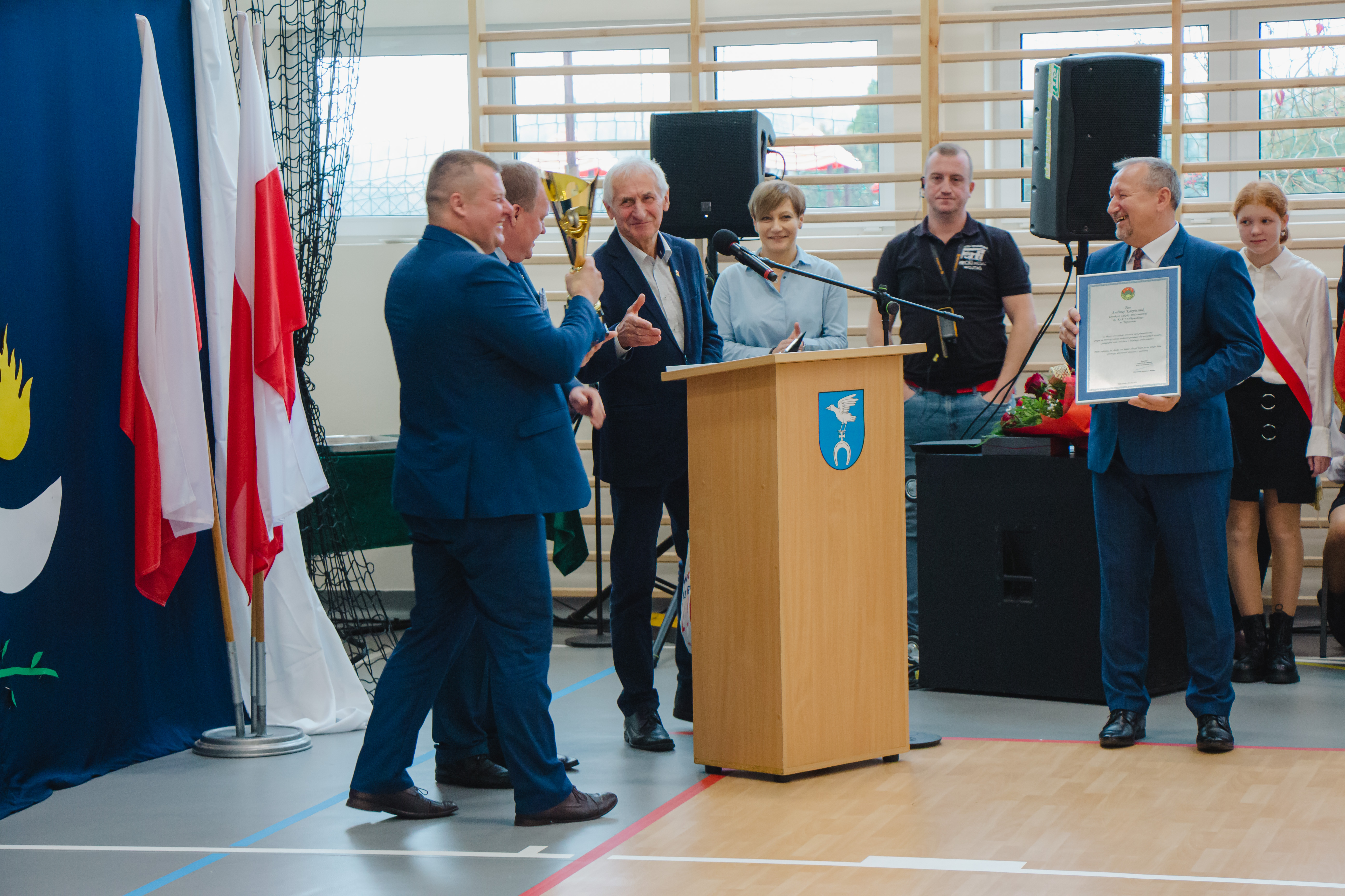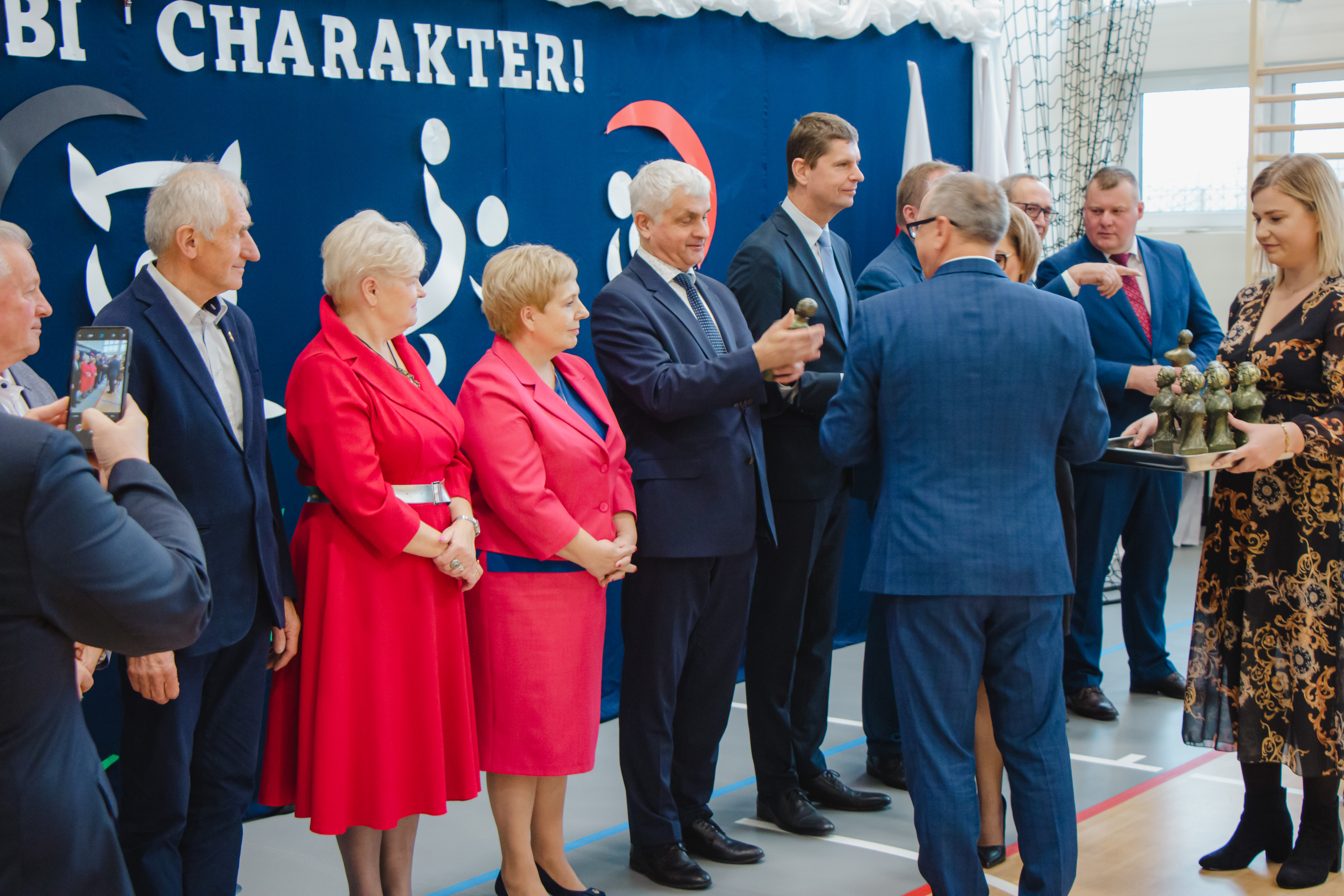 Osoby zasłużone dla budowy sali, przyjaciele szkoły w ramach podziękowań otrzymali od dyrektora placówki figurki patrona szkoły - ks. Franciszka Jakuba Falkowskiego - pochodzącego z Gminy Wyszki założyciela Instytutu Głuchoniemych w Warszawie.