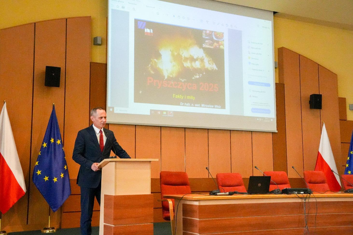 Prof. dr hab. Wiesław Niedbalski z Państwowego Instytutu Weterynaryjnego (Dział Wirusologii i Chorób Wirusowych Zwierząt – Zespół Badawczy Pryszczycy) omówił epidemiologię choroby i przedstawił wytyczne w zakresie pobiegania próbek do badań.