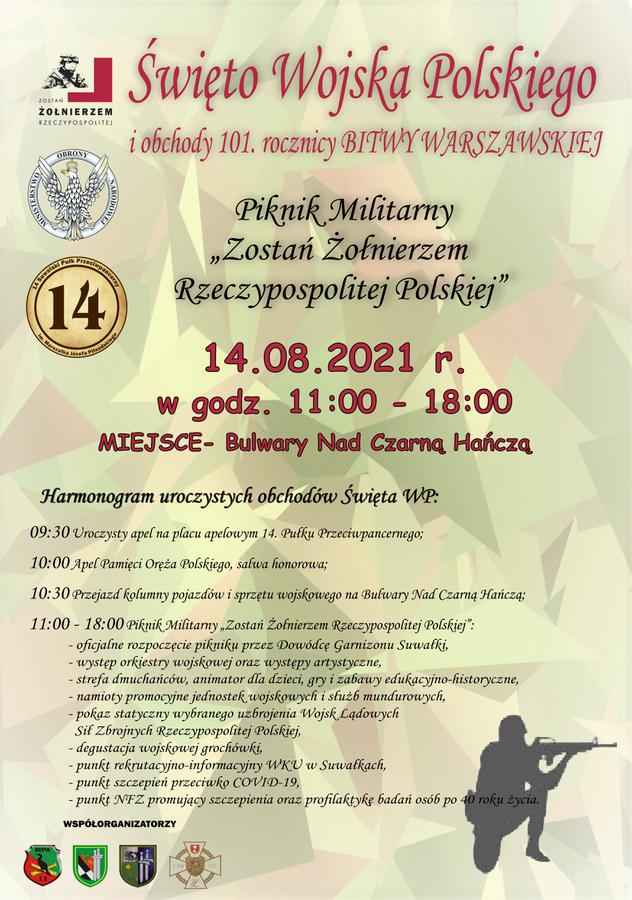 14 i 15 sierpnia, w ramach obchodów święta Wojska Polskiego, na piknikach zobaczyć będzie można m.in.: pokazy sprzętu i wyszkolenia żołnierzy, pokazy lotnicze, koncerty orkiestr wojskowych, przewidziano też mobilne punkty szczepień, strefy zabaw dla dzieci i żołnierską kuchnię. Będzie można zapoznać się ze sprzętem, którym dysponują żołnierze Wojska Polskiego i porozmawiać z żołnierzami na temat służby wojskowej.