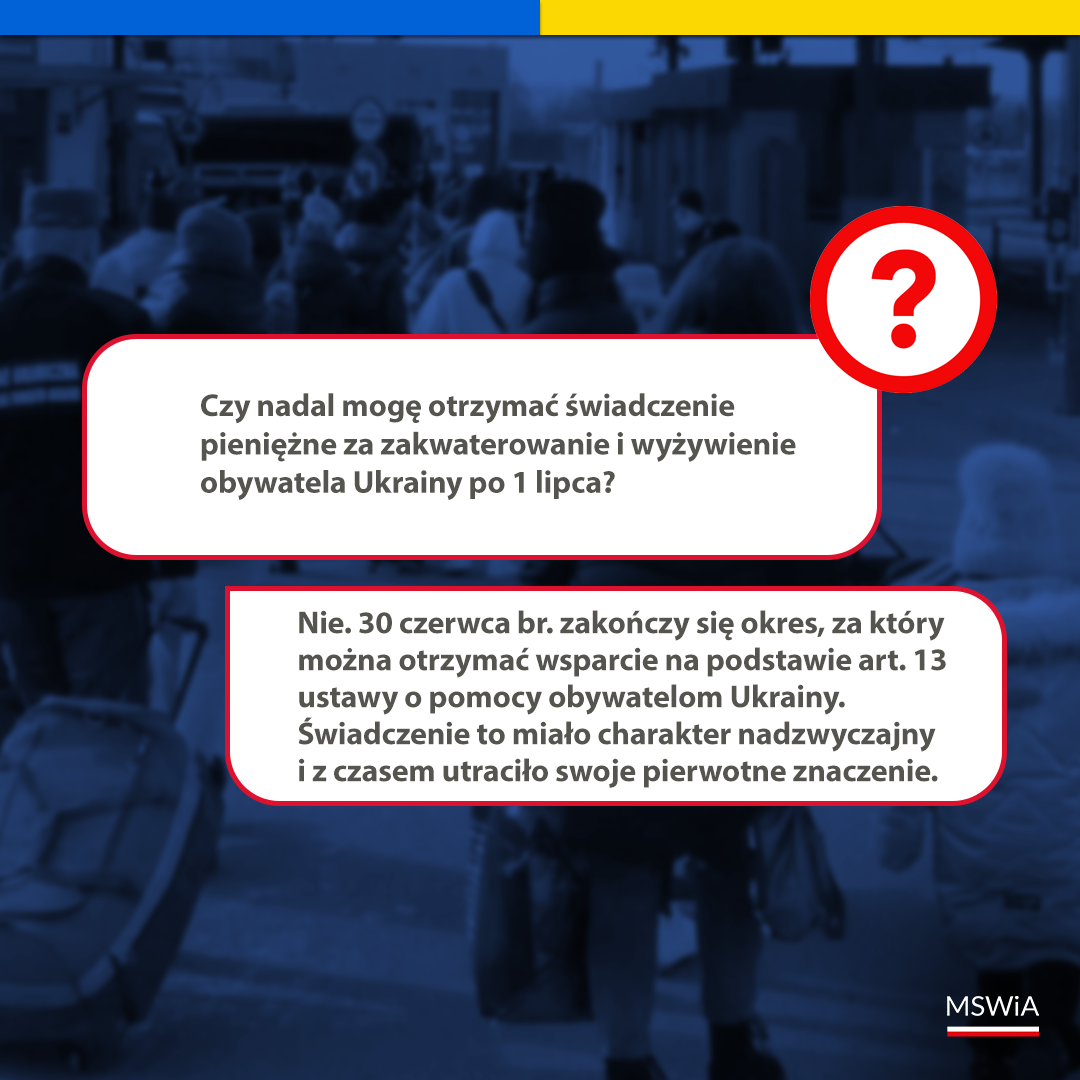 W ostatnich miesiącach maleje liczba wnioskodawców o to świadczenie, a pula wolnych miejsc w obiektach zbiorowego zakwaterowania rośnie. Stąd decyzja o zakończeniu tej formy pomocy. Natomiast obywatele Ukrainy, którzy nadal będą wymagali wsparcia, mogą się zgłaszać do właściwego miejscowo wojewody, który udzieli im tego wsparcia. Wskaże im wolne miejsce w obiekcie zbiorowego zakwaterowania, dostosowanym do potrzeb danego uchodźcy.
