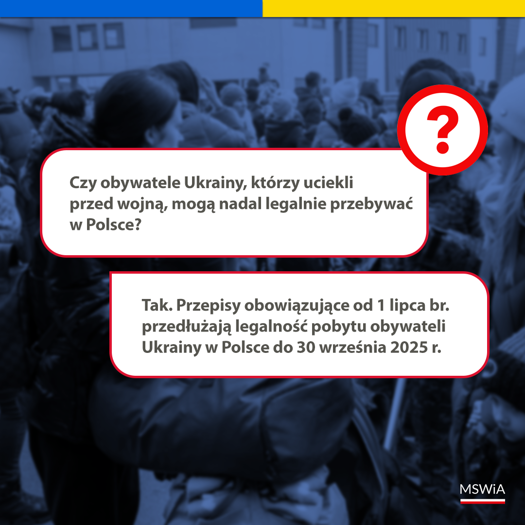 Od poniedziałku 1 lipca 2024 r. zmieniają się przepisy tzw. ustawy pomocowej (Ustawa z dnia 12 marca 2022 r. o pomocy obywatelom Ukrainy w związku z konfliktem zbrojnym na terytorium tego państwa). Przedłużona zostanie legalność pobytu w Polsce obywateli Ukrainy. Nowe regulacje obejmą również narzędzia wsparcia osób objętych ochroną czasową. Przepisy przygotowało MSWiA we współpracy z innymi resortami - MRPiPS, MEN, MZ, MC, MI, MF oraz KPRM. Są one efektem szerokich konsultacji z organizacjami pozarządowymi, samorządowcami oraz instytucjami państwowymi.