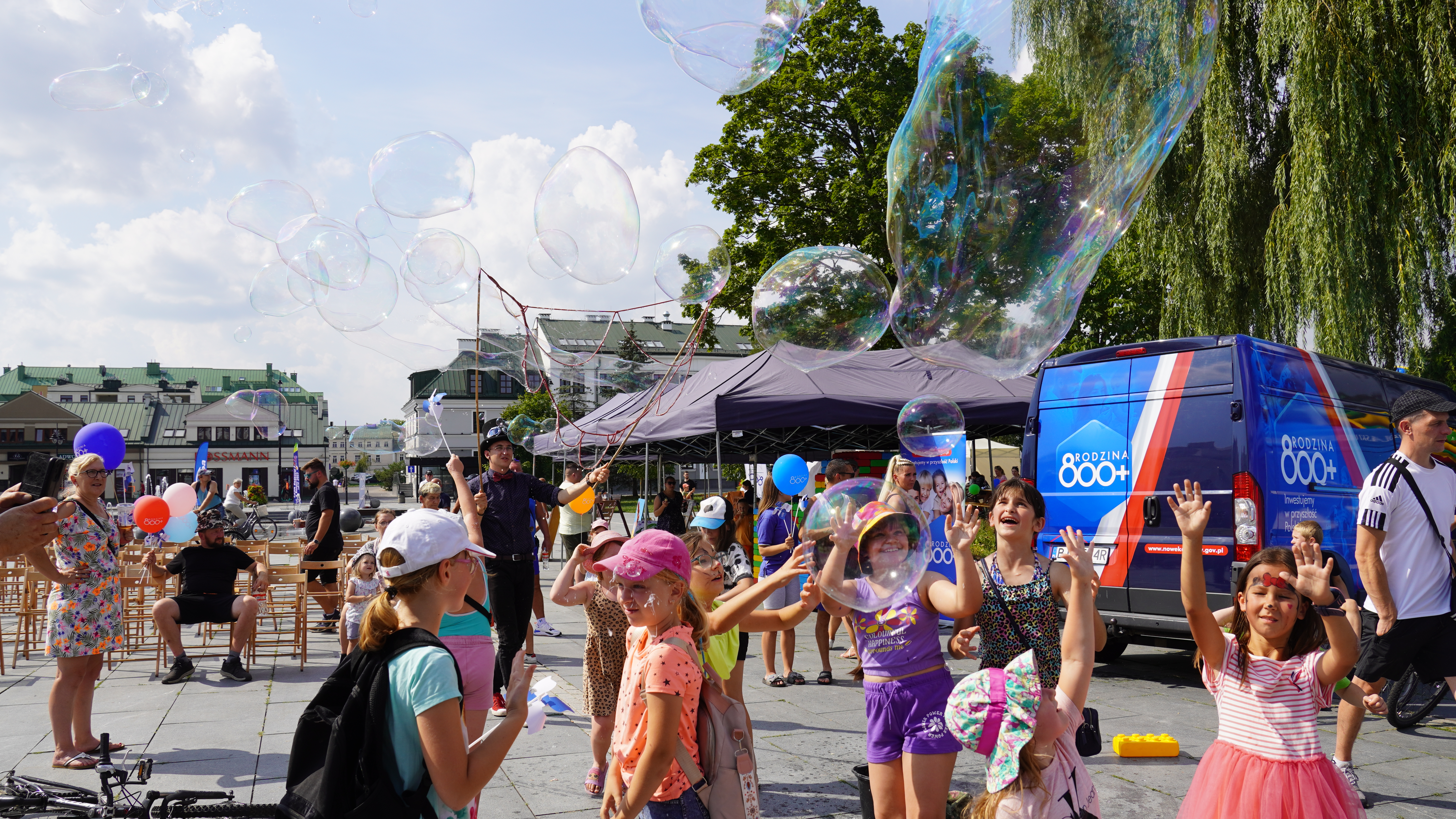 Piknik Rodzinny 800+ w Suwałkach był okazją do integracji pokoleń. Przybyły dzieci z rodzicami lub dziadkami, a na wszystkich czekały liczne atrakcje. Ucieszyli się przede wszystkim najmłodsi, którzy mogli skorzystać z dmuchańców, malowania twarzy, warkoczyków i kącików z zabawkami, ale także obejrzeć pokaz iluzjonisty czy gigantycznych baniek mydlanych.