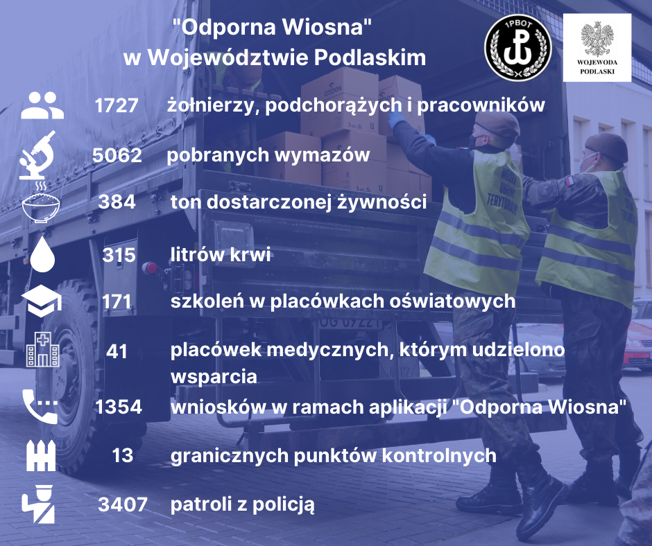 Na zlecenie Podlaskiego Urzędu Wojewódzkiego, w związku z przywróceniem działalności żłobków, przedszkoli oraz przygotowaniem do przeprowadzenia egzaminów maturalnych, żołnierze 1PBOT dostarczyli około 100 ton płynów dezynfekujących. Z oferty szkoleń, służących przygotowaniu personelu do funkcjonowania w warunkach COVID-19, skorzystało 171 placówek z całego województwa.