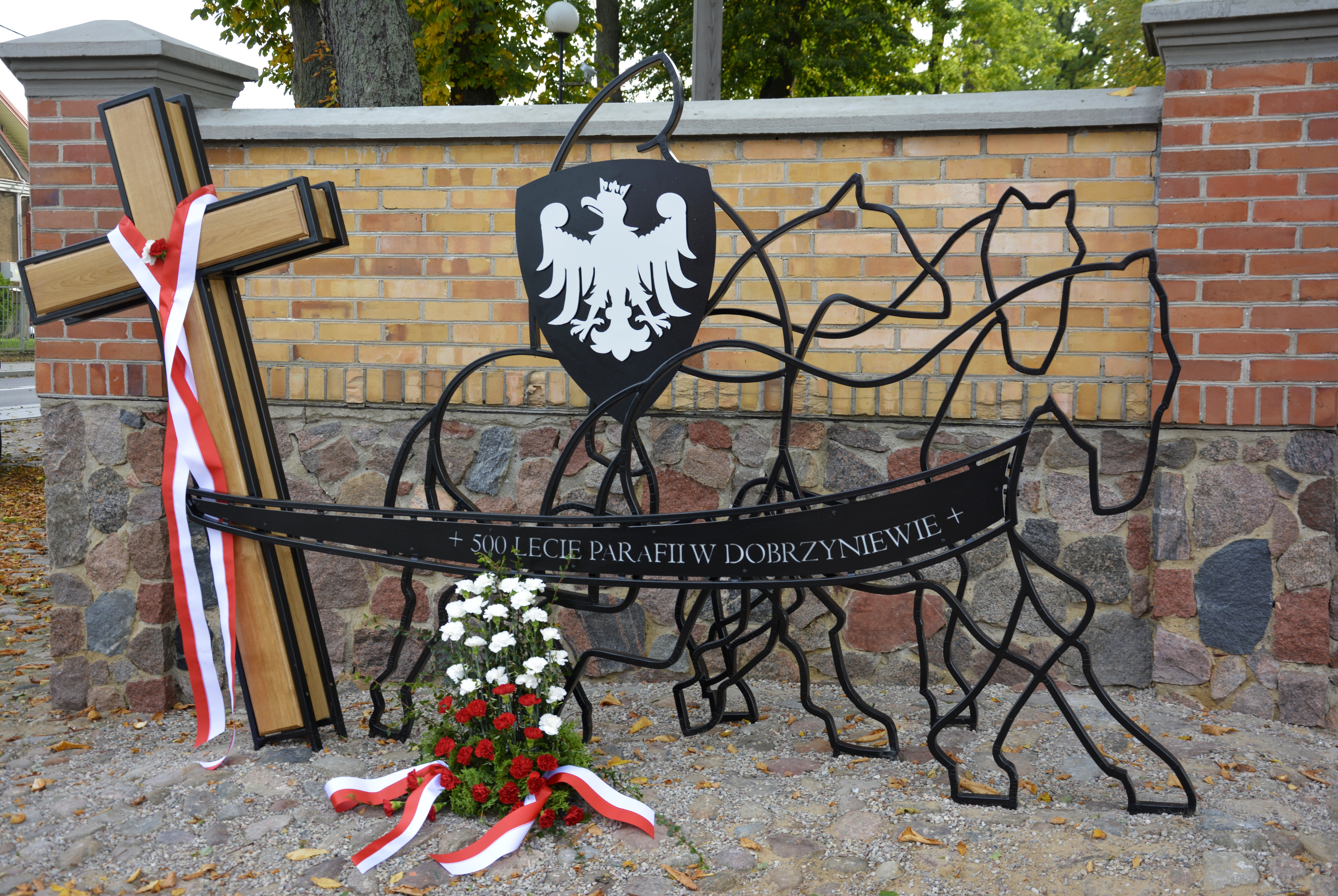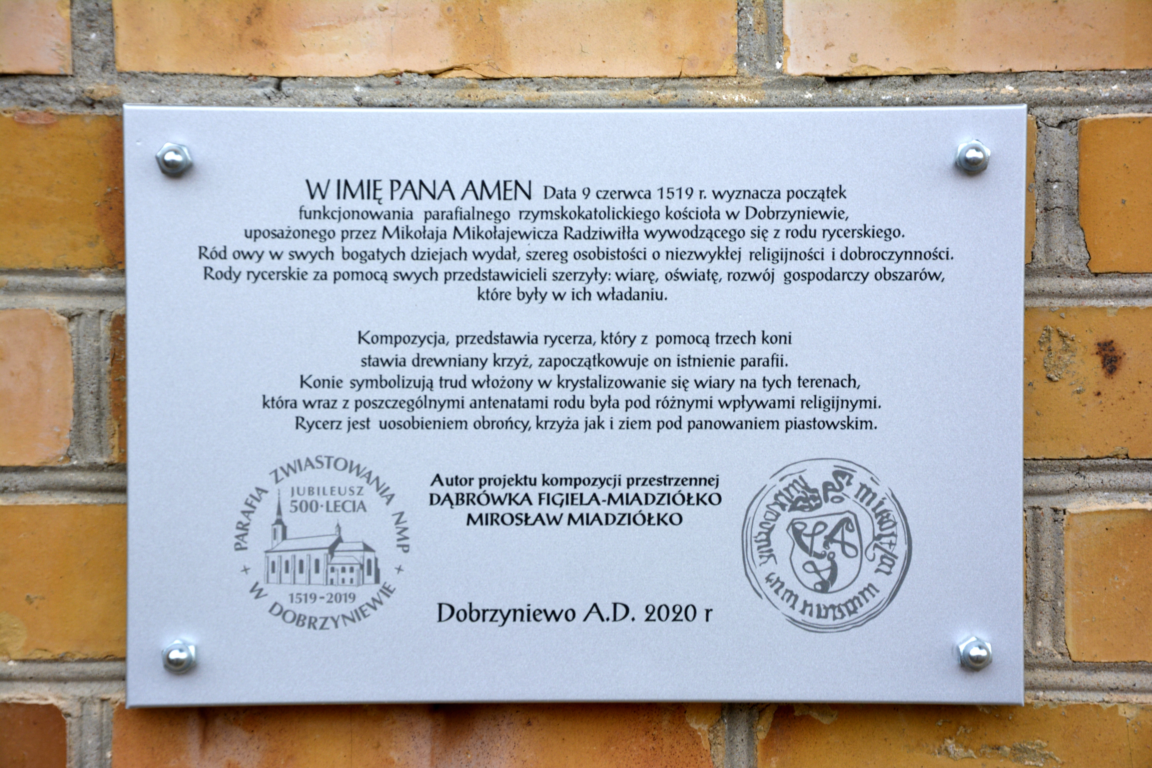 Data 9 czerwca 1519 r. wyznacza początek funkcjonowania parafialnego rzymskokatolickiego kościoła w Dobrzyniewie, uposażonego przez Mikołaja Mikołajewicza Radziwiłła wywodzącego się z rodu rycerskiego. (...) Kompozycja, przedstawia rycerza, który z pomocą trzech koni stawia drewniany krzyż, zapoczątkowuje on istnienie parafii. Konie symbolizują trud włożony w krystalizowanie się wiary na tych terenach, która wraz z poszczególnymi antenatami rodu była pod różnymi wpływami religijnymi. Rycerz jest uosobieniem obrońcy, krzyża jak i ziem pod panowaniem piastowskim.