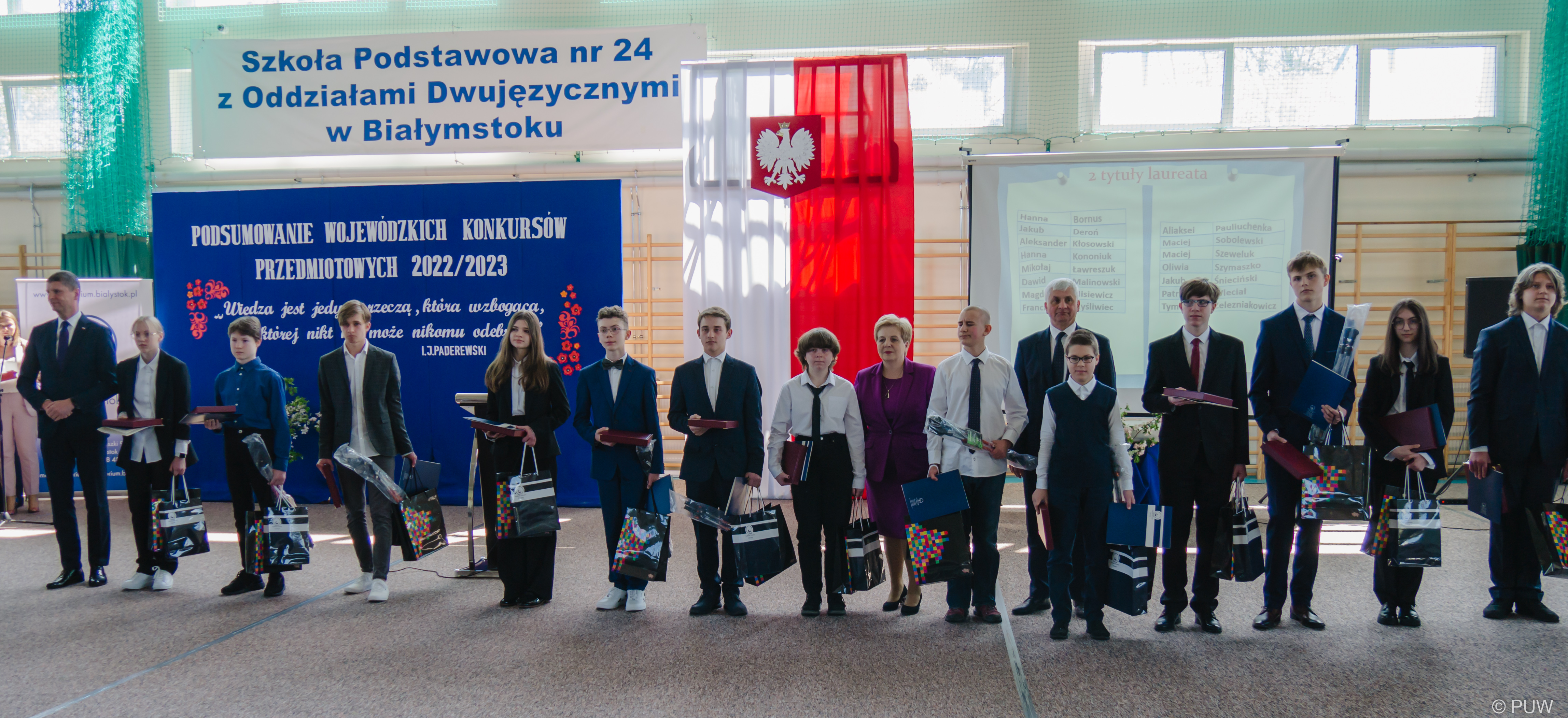 Prawie 13 tysięcy uczniów z podlaskich szkół podstawowych wzięło w tym roku udział w konkursach przedmiotowych organizowanych przez Kuratorium Oświaty w Białymstoku. Ponad 200 z nich zdobyło tytuł laureata, dzięki czemu będą mieć na świadectwie najwyższe oceny z tych przedmiotów, a także zapewnione miejsce w wybranej szkole średniej. W poniedziałek (8.05) w Szkole Podstawowej nr 24 w Białymstoku odbyło się podsumowanie, w którym wzięli udział wojewoda podlaski Bohdan Paszkowski i wicewojewoda Tomasz Madras.
