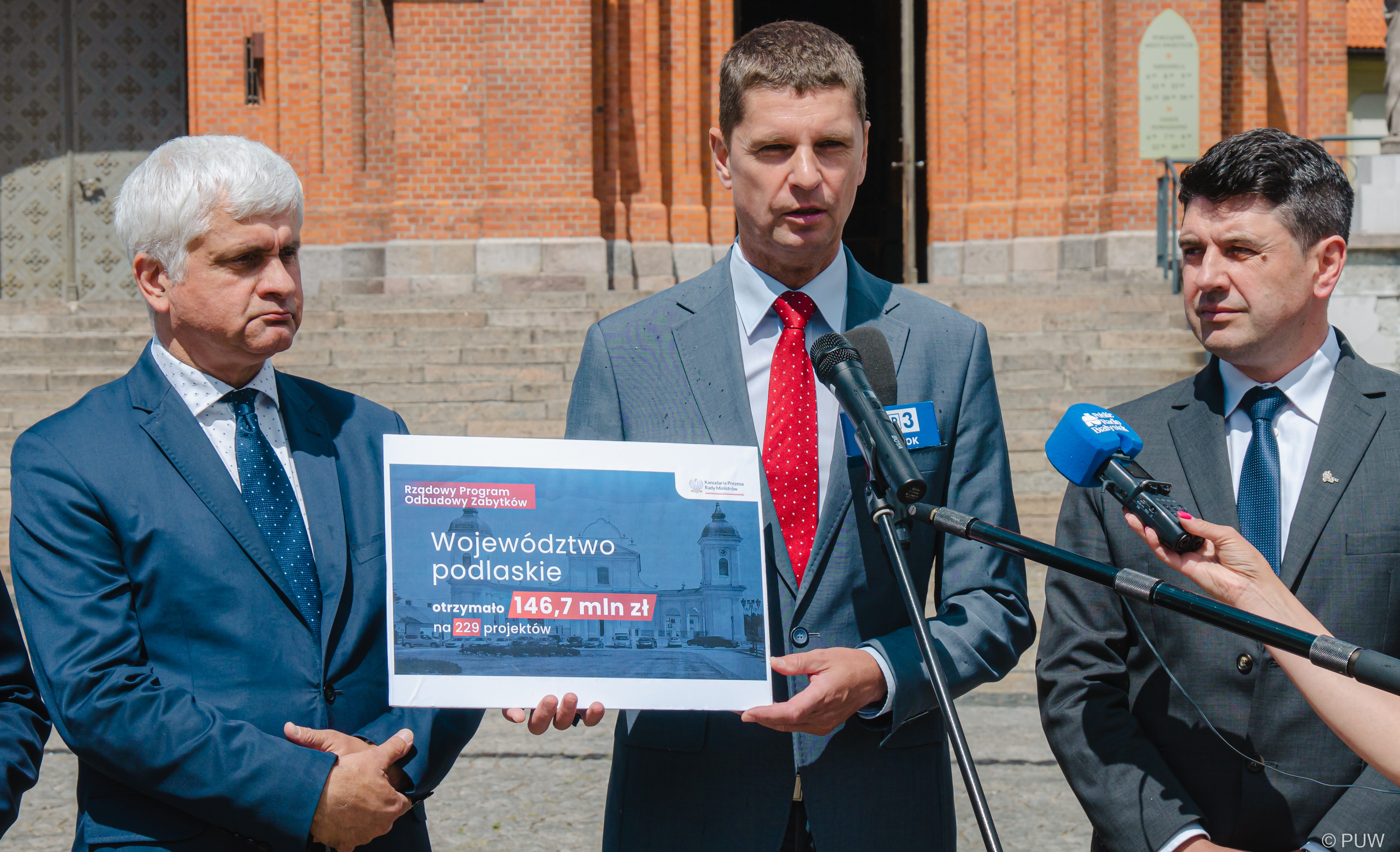 Rząd premiera Mateusza Morawieckiego stale wspiera województwo podlaskie i jego mieszkańców. Tym razem nasze lokalne samorządy otrzymają nawet do 3,5 mln zł na remont lub odbudowę zabytków. Wiceminister edukacji i nauki Dariusz Piontkowski, wojewoda podlaski Bohdan Paszkowski, wicewojewoda podlaski Tomasz Madras oraz podlascy parlamentarzyści i samorządowcy poinformowali w piątek dziennikarzy o wsparciu z Rządowego Programu Odbudowy Zabytków, jakie trafi do naszego regionu. W budżecie krajowym jest 2,5 mld zł na przeszło 4800 projektów, z czego ponad 150 mln zł otrzyma 231 zabytkowych obiektów w Podlaskiem.