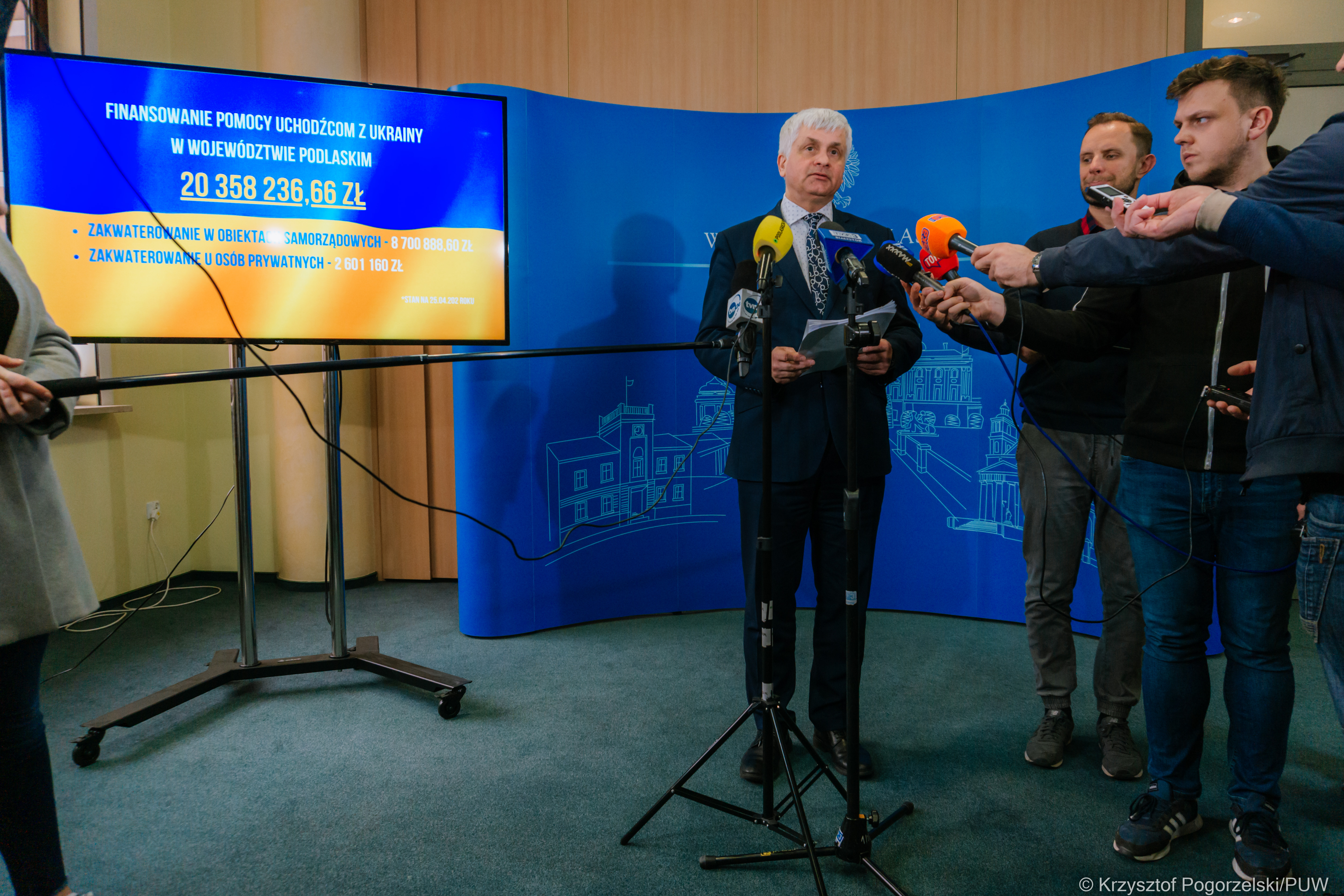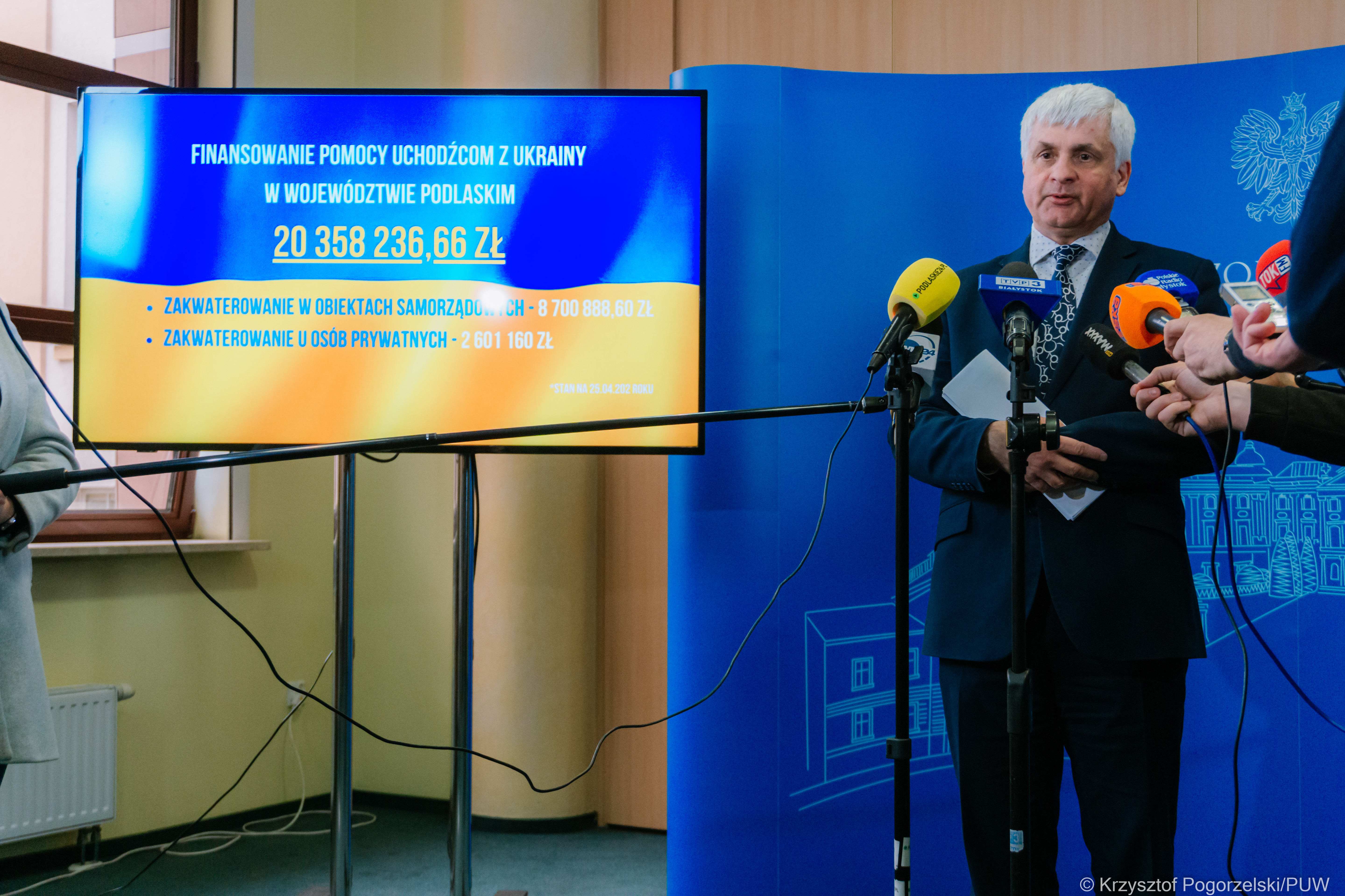 Prawie 18,5 mln zł z Funduszu Pomocy i prawie 2 mln zł z rezerwy ogólnej wojewody - tak wygląda finansowanie pobytu uchodźców z Ukrainy w województwie podlaskim. To pieniądze przekazane głównie samorządom na zakwaterowanie, wyżywienie i świadczenia społeczne. - Płatności z Funduszu Pomocy realizowane przez Podlaski Urząd Wojewódzki odbywają się na bieżąco - poinformował we wtorek (26.04) na konferencji prasowej wojewoda podlaski Bohdan Paszkowski.