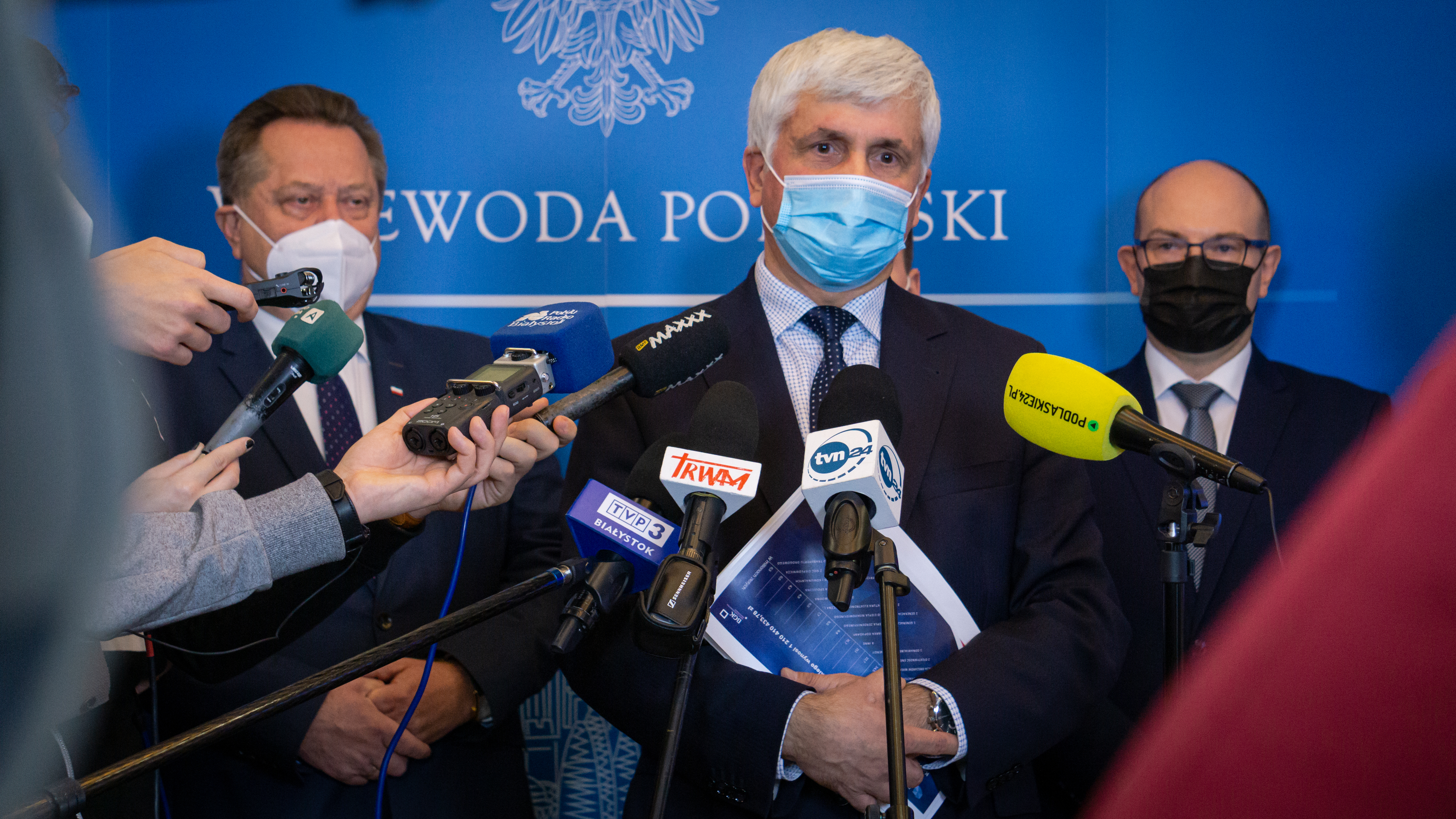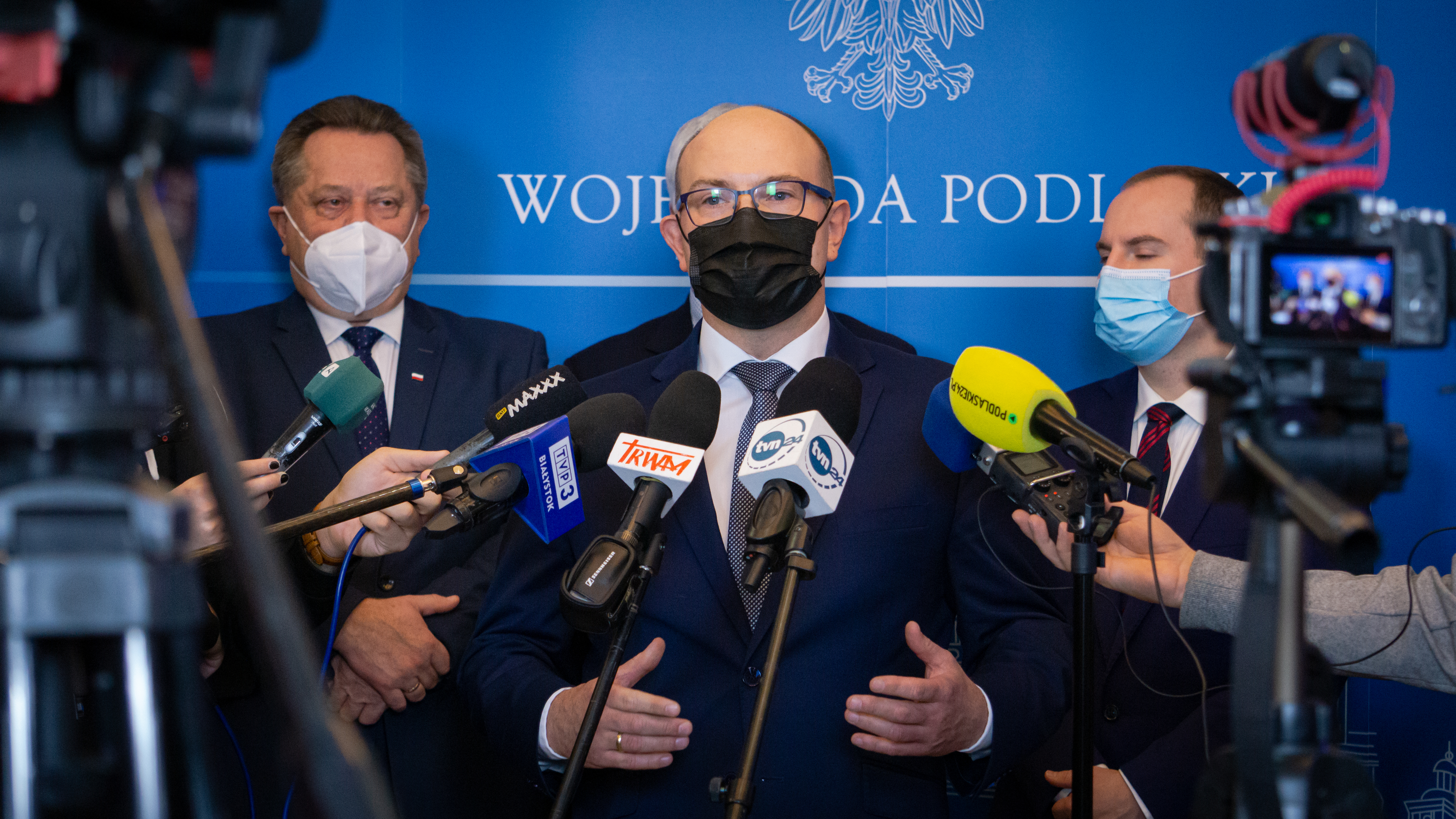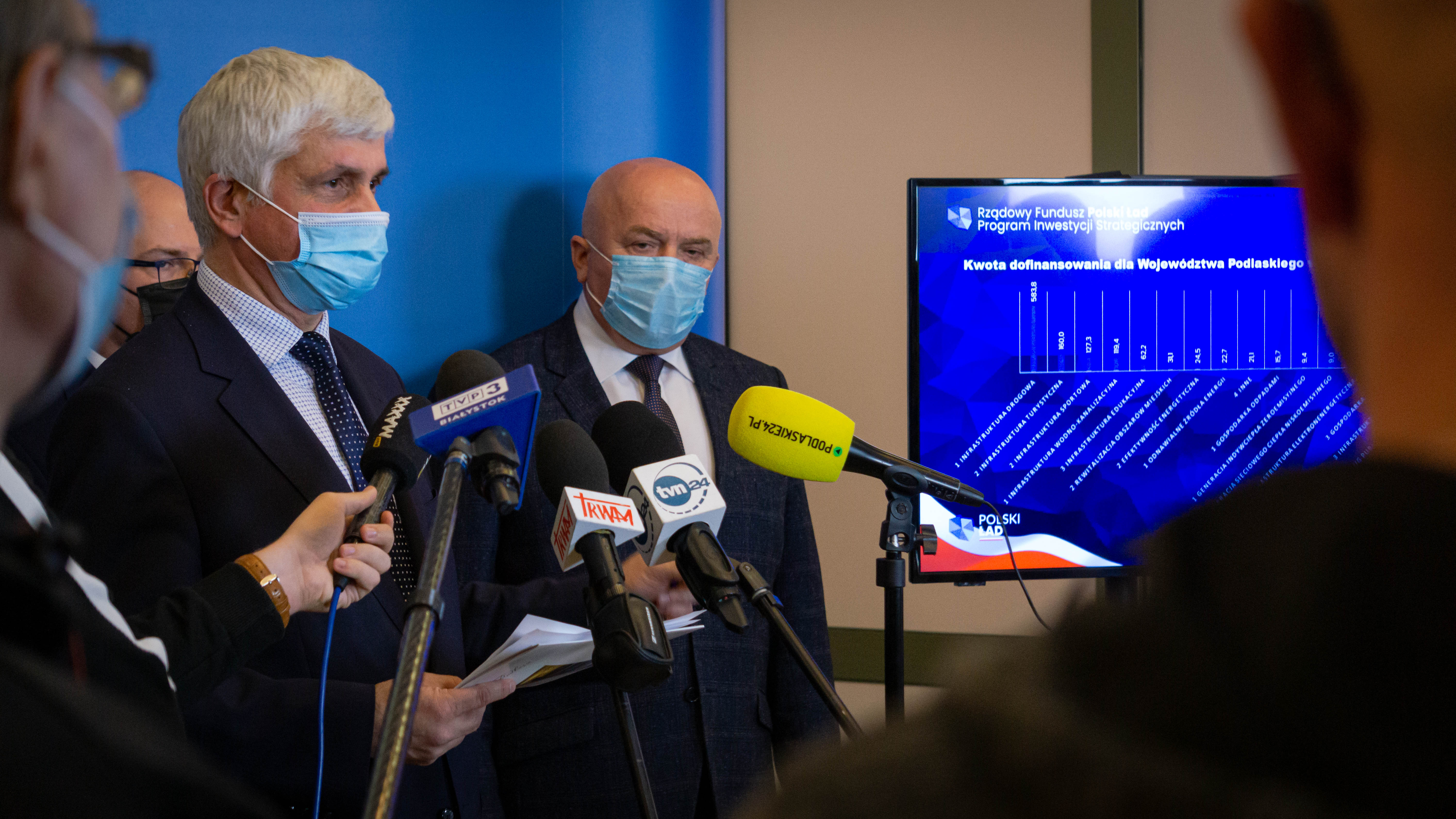 W konferencji prasowej w Podlaskim Urzędzie Wojewódzkim wzięli również udział: wicewojewoda podlaski Tomasz Madras, marszałek województwa podlaskiego Artur Kosicki oraz wójt Gminy Turośń Kościelna Grzegorz Jakuć.