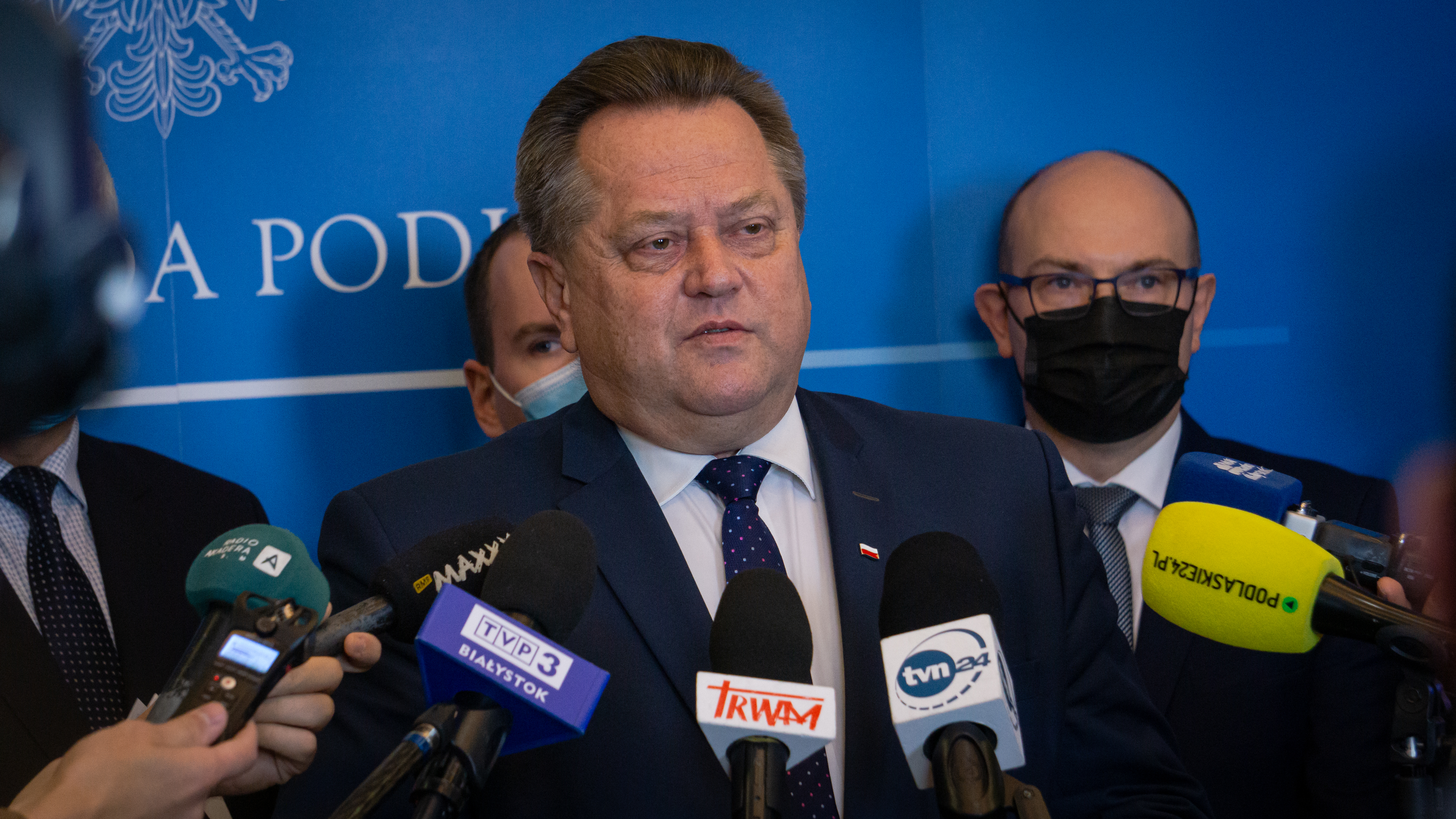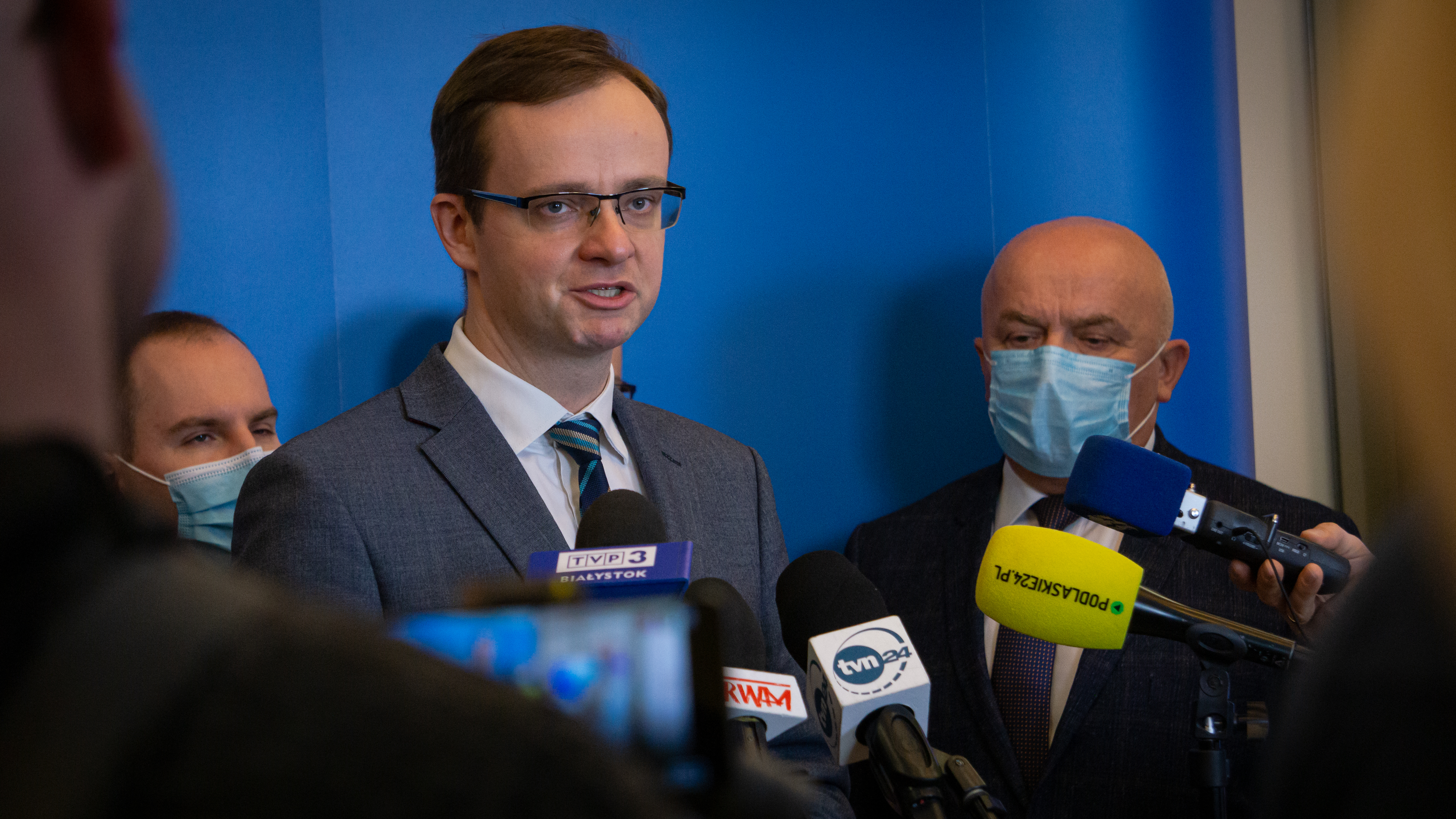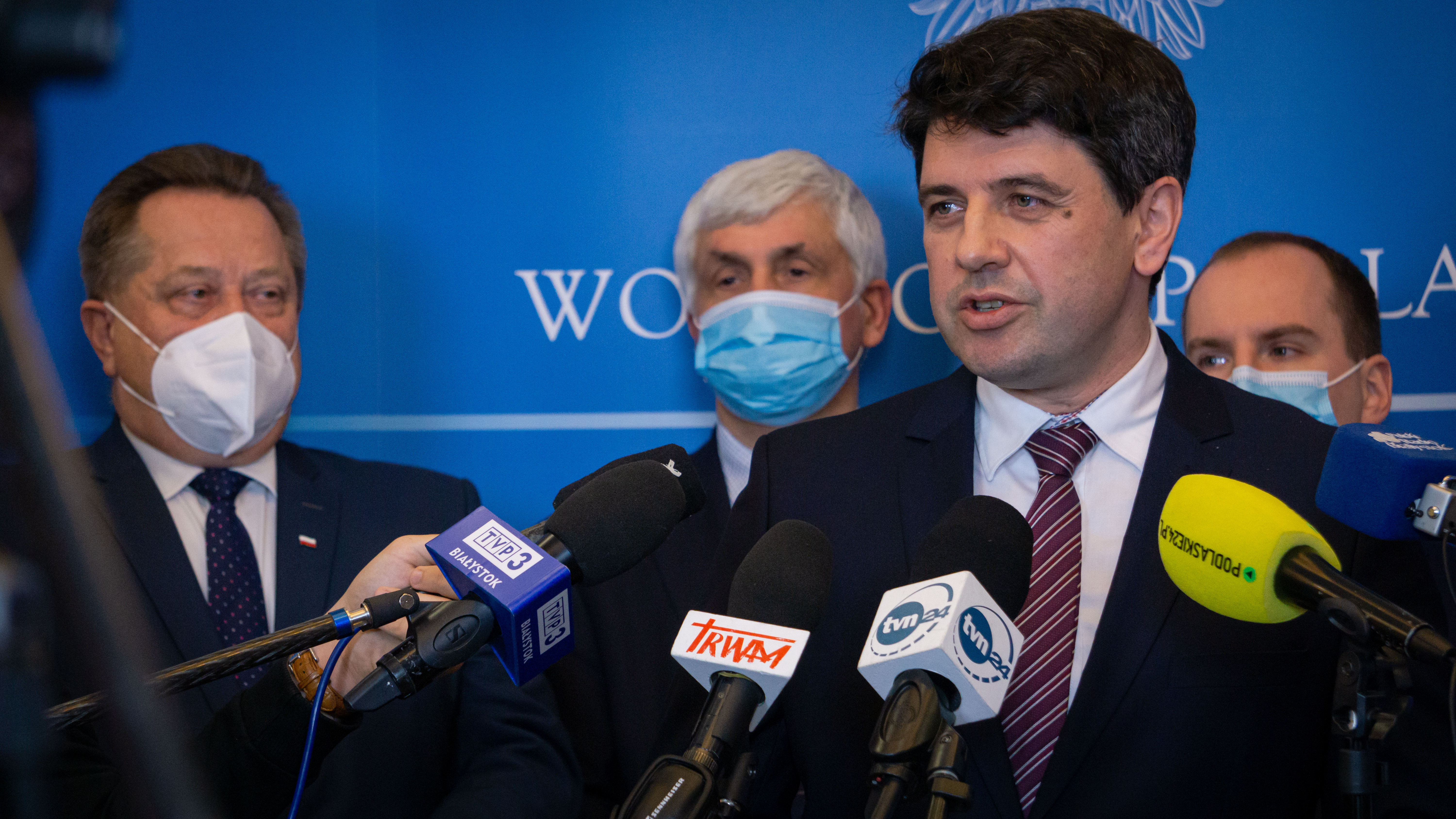 W konferencji prasowej w Podlaskim Urzędzie Wojewódzkim wzięli również udział: wicewojewoda podlaski Tomasz Madras, marszałek województwa podlaskiego Artur Kosicki oraz wójt Gminy Turośń Kościelna Grzegorz Jakuć.