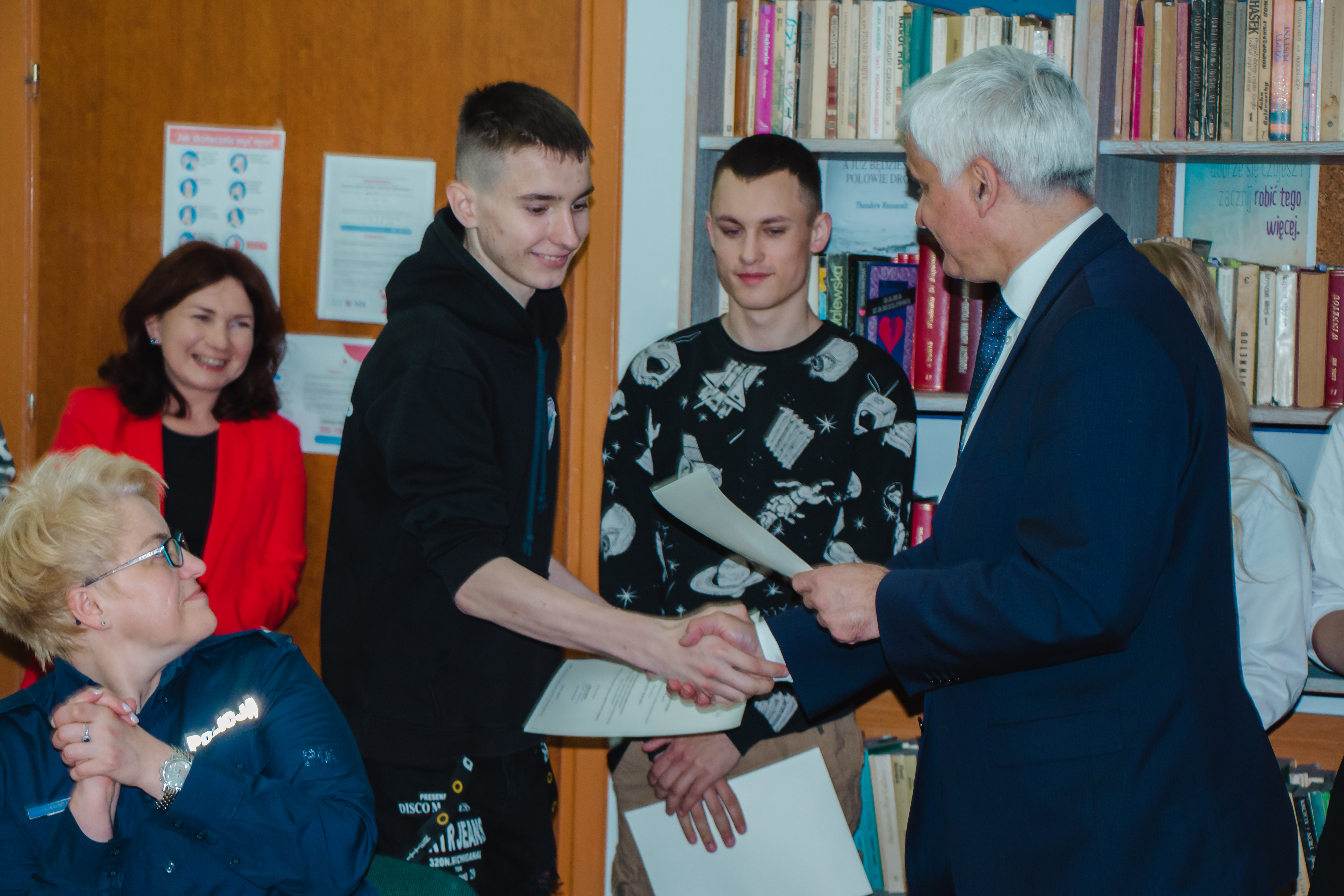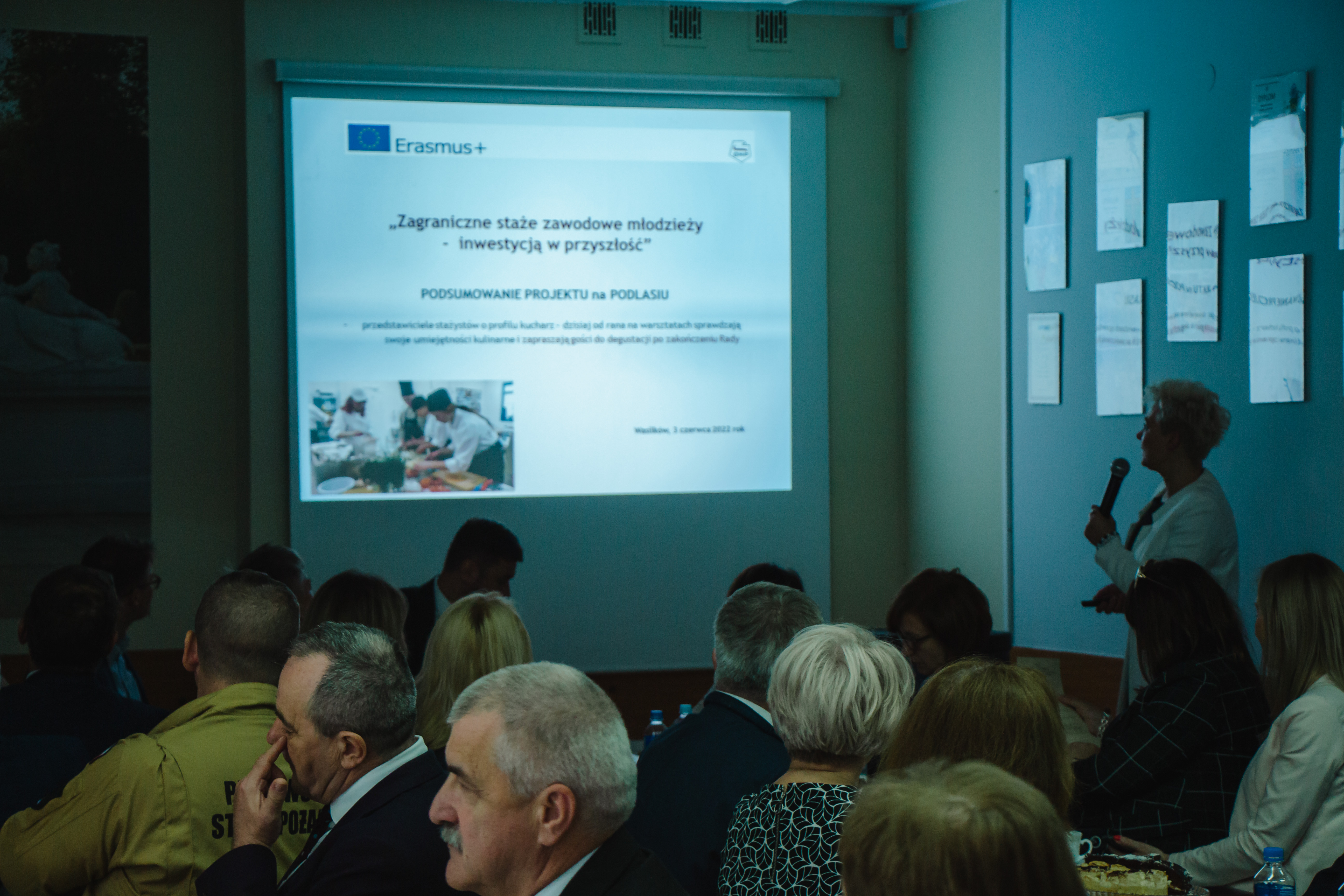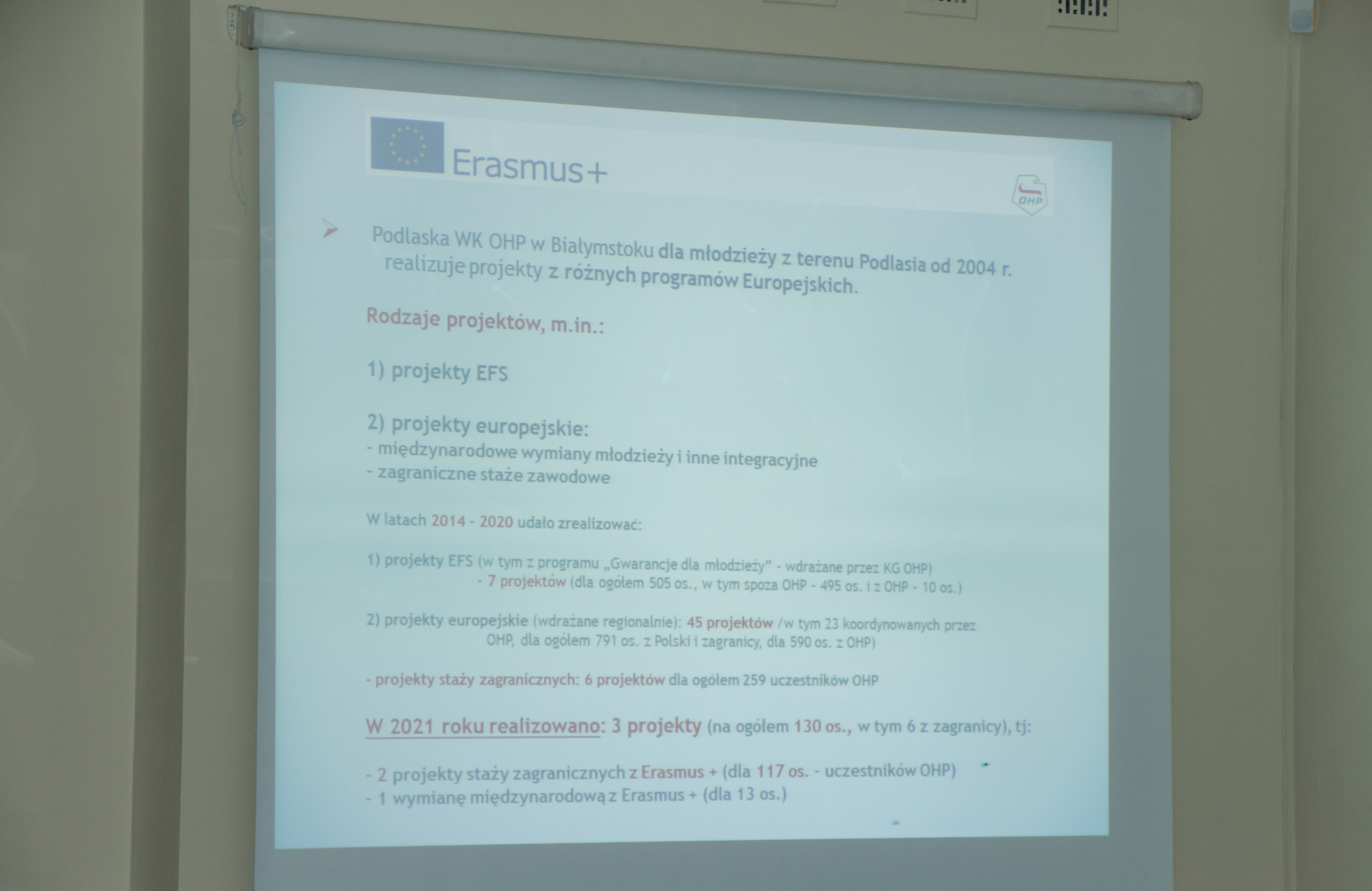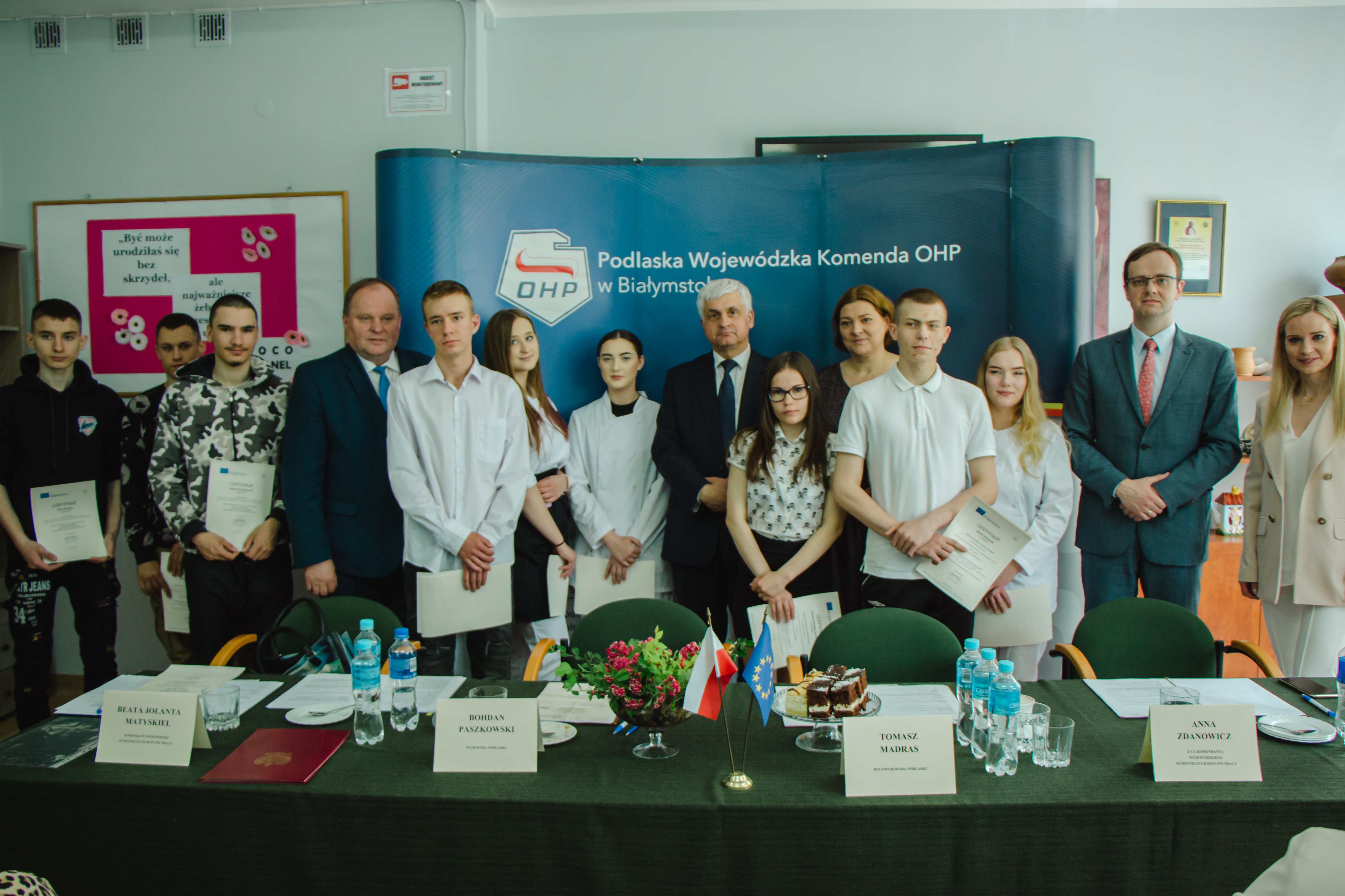 Następnie kończący się na Podlasiu projekt, wdrażany z programu Erasmus + a finansowany ze środków UE, pt. „Inwestycja w przyszłość – zagraniczne staże zawodowe młodych kucharzy, stolarzy i murarzy w Niemczech" podsumowali w swoich prezentacjach multimedialnych m.in.: koordynator wojewódzki projektu Elżbieta Dziemianiuk oraz przedstawiciele uczestników staży z Hufca Pracy w Białymstoku i Ośrodka Szkolenia i Wychowania OHP w Wasilkowie przy wsparciu opiekunów Beaty Bratumił (Kierownika OSIW Wasilków) i Jolanty Powichrowskiej (Komendant HP Białystok). Po prezentacjach uczestnicy staży otrzymali certyfikaty zdobyte w ramach projektu z rąk wojewody i Wojewódzkiego Komendanta OHP, co było dla młodzieży niecodziennym wydarzeniem.