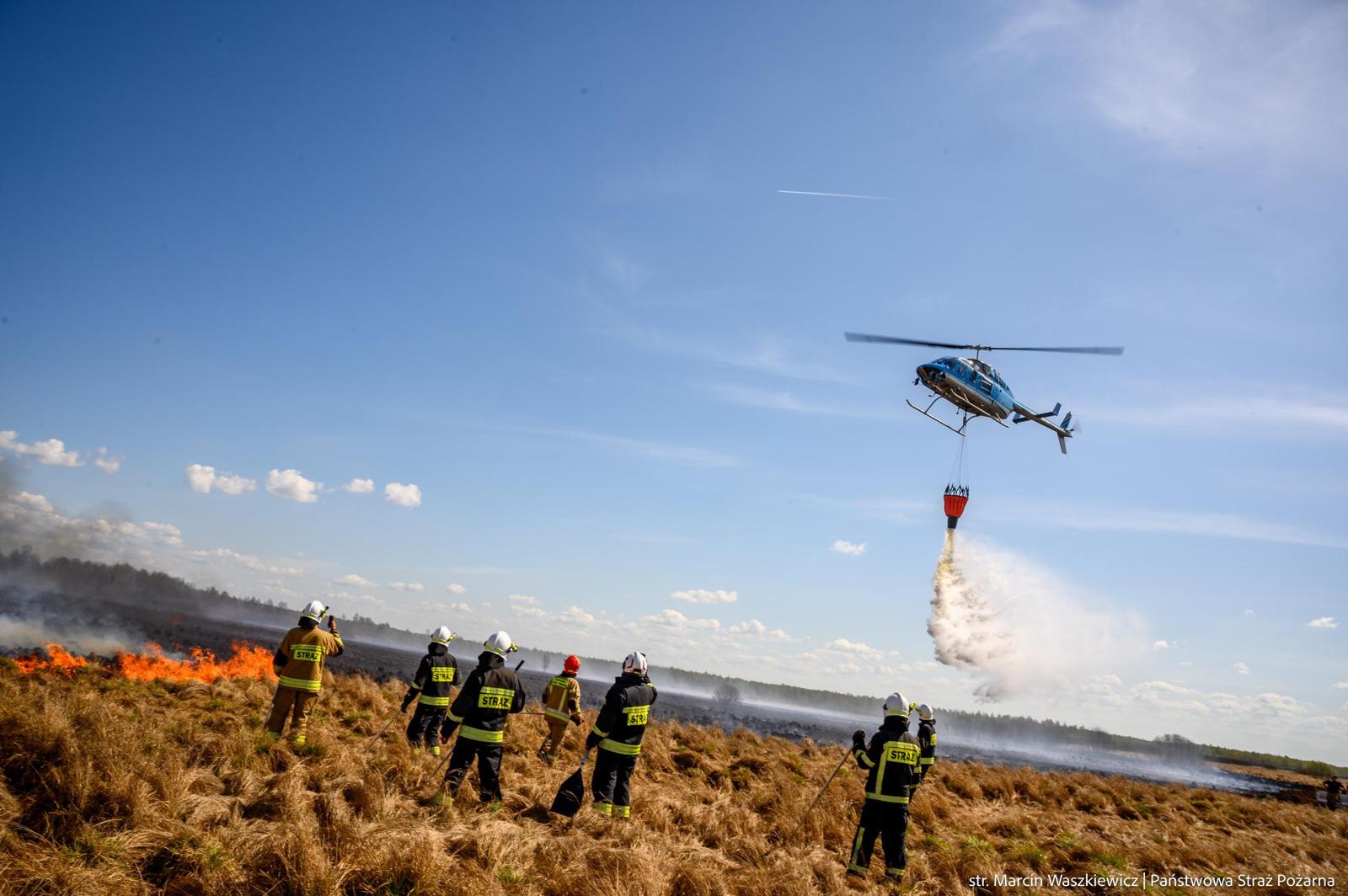 Zrzuty wody wykonuje pięć śmigłowców: jeden Black Hawk, który może przewieźć 3 tys. litrów, są też cztery mniejsze śmigłowce – 500 litrowe. Powierzchnia pożaru to ok. 450 hektarów.