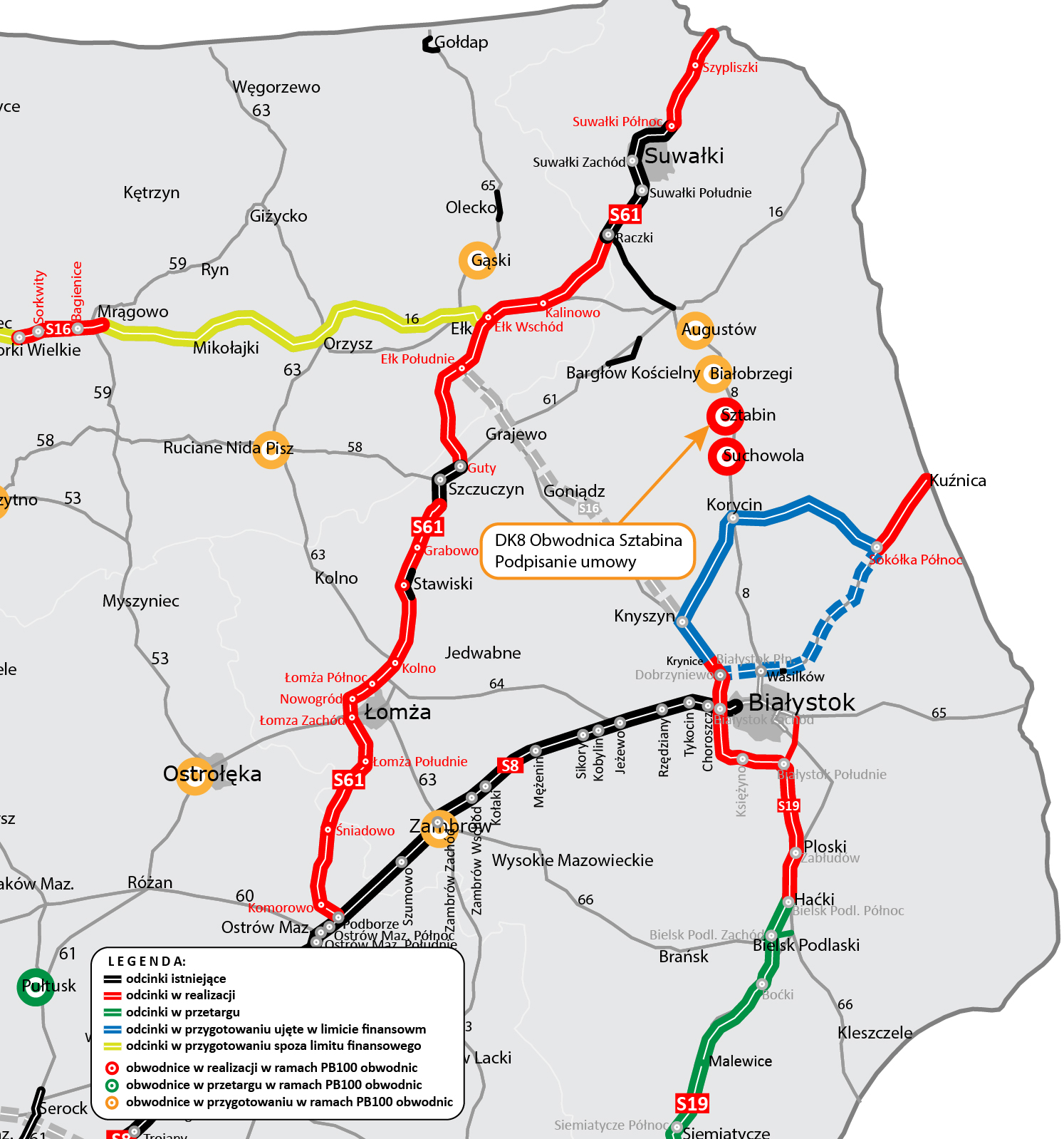 W piątek (28.05), podczas wideokonferencji, Generalna Dyrekcja Dróg Krajowych i Autostrad podpisała umowę na zaprojektowanie i budowę obwodnicy Sztabina w ciągu drogi krajowej nr 8 Białystok – Augustów. Jest to druga umowa na realizację podpisana w województwie podlaskim w ramach rządowego Programu budowy 100 obwodnic. W spotkaniu uczestniczyli m.in. wiceminister infrastruktury Rafał Weber i wojewoda podlaski Bohdan Paszkowski.