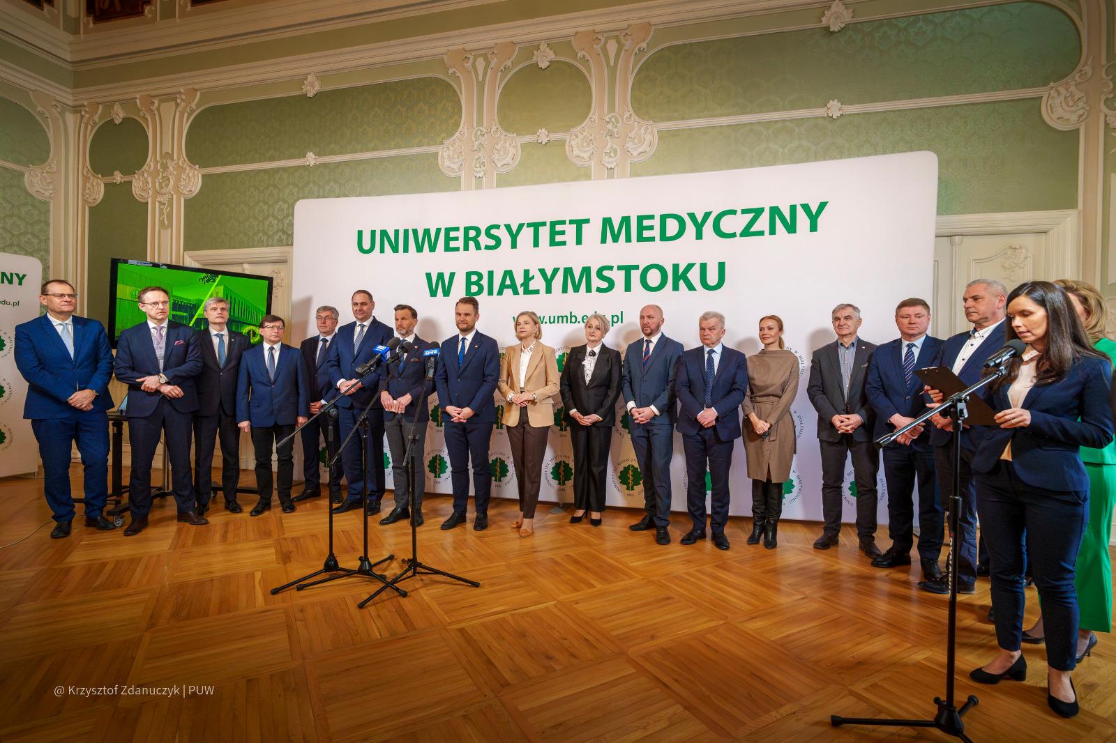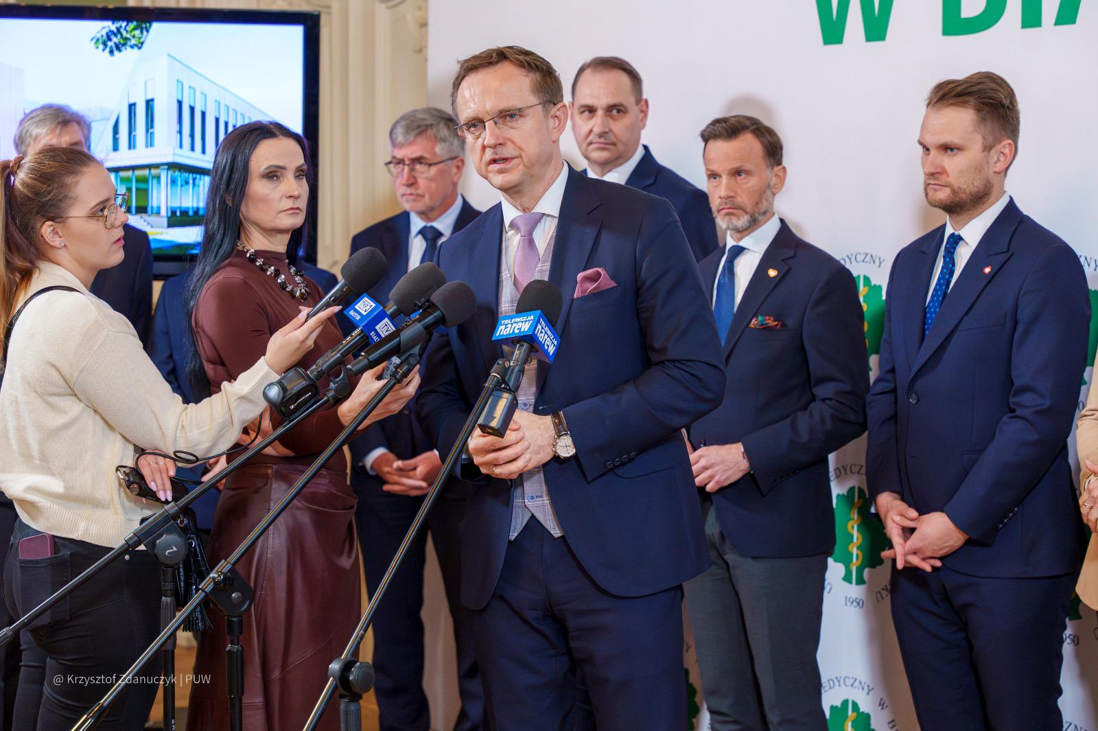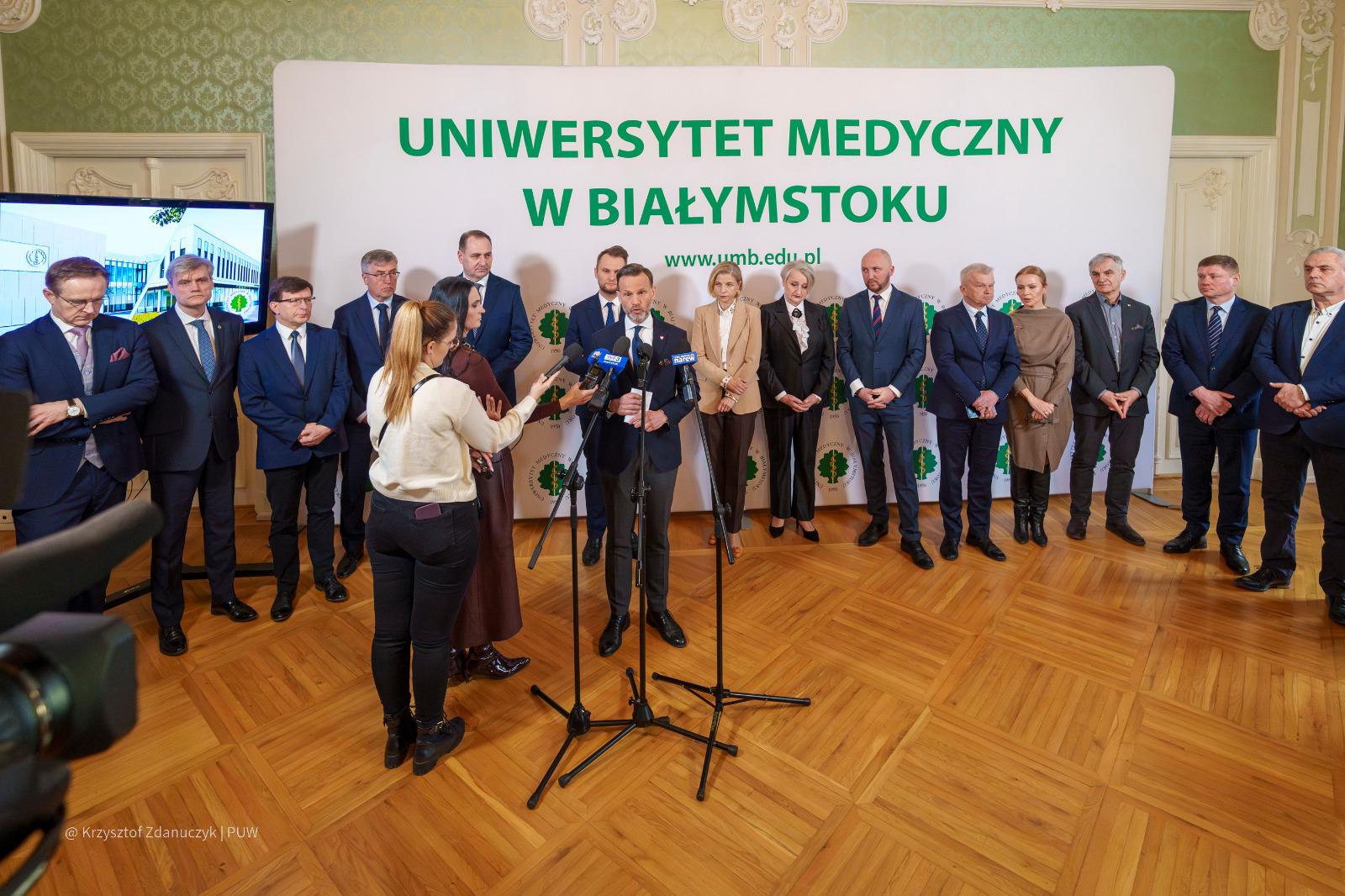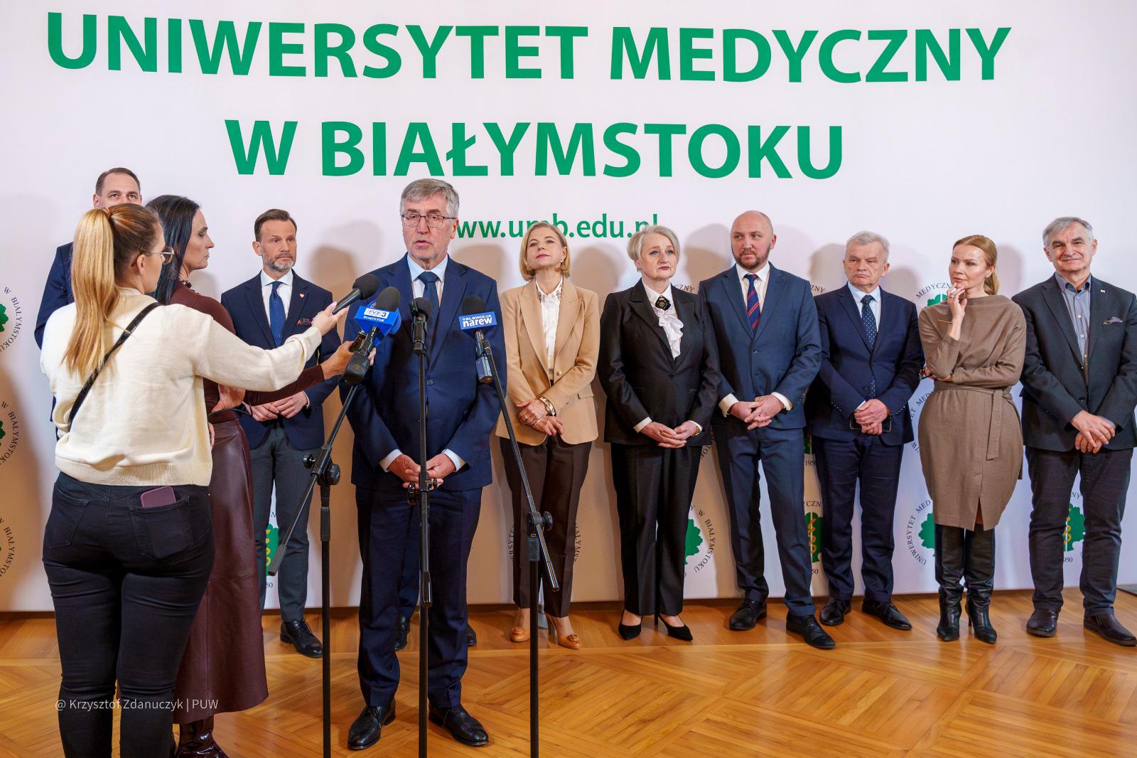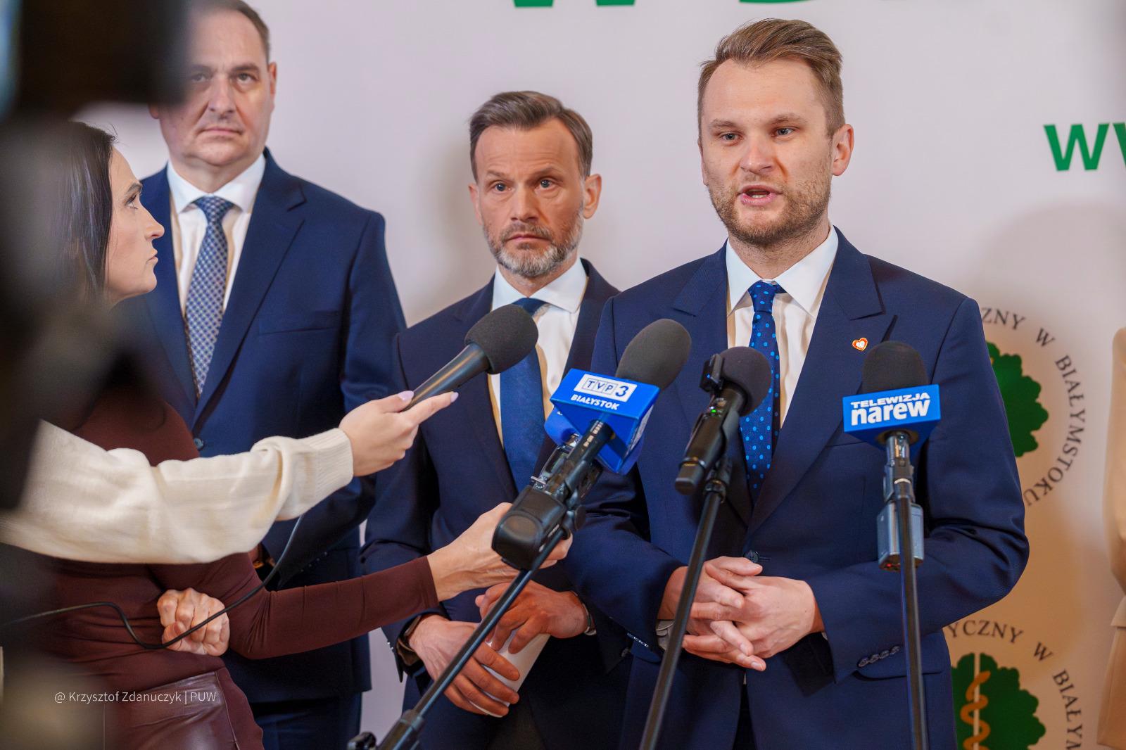 W spotkaniu z przedstawicielami mediów w Auli Magna Pałacu Branickich w Białymstoku wzięli udział także rektor Uniwersytetu Medycznego w Białymstoku prof. Marcin Moniuszko z prorektorami uczelni, członkowie zarządu województwa podlaskiego oraz dyrektor Podlaskiego Oddziału Wojewódzkiego NFZ Anna Rzemek.