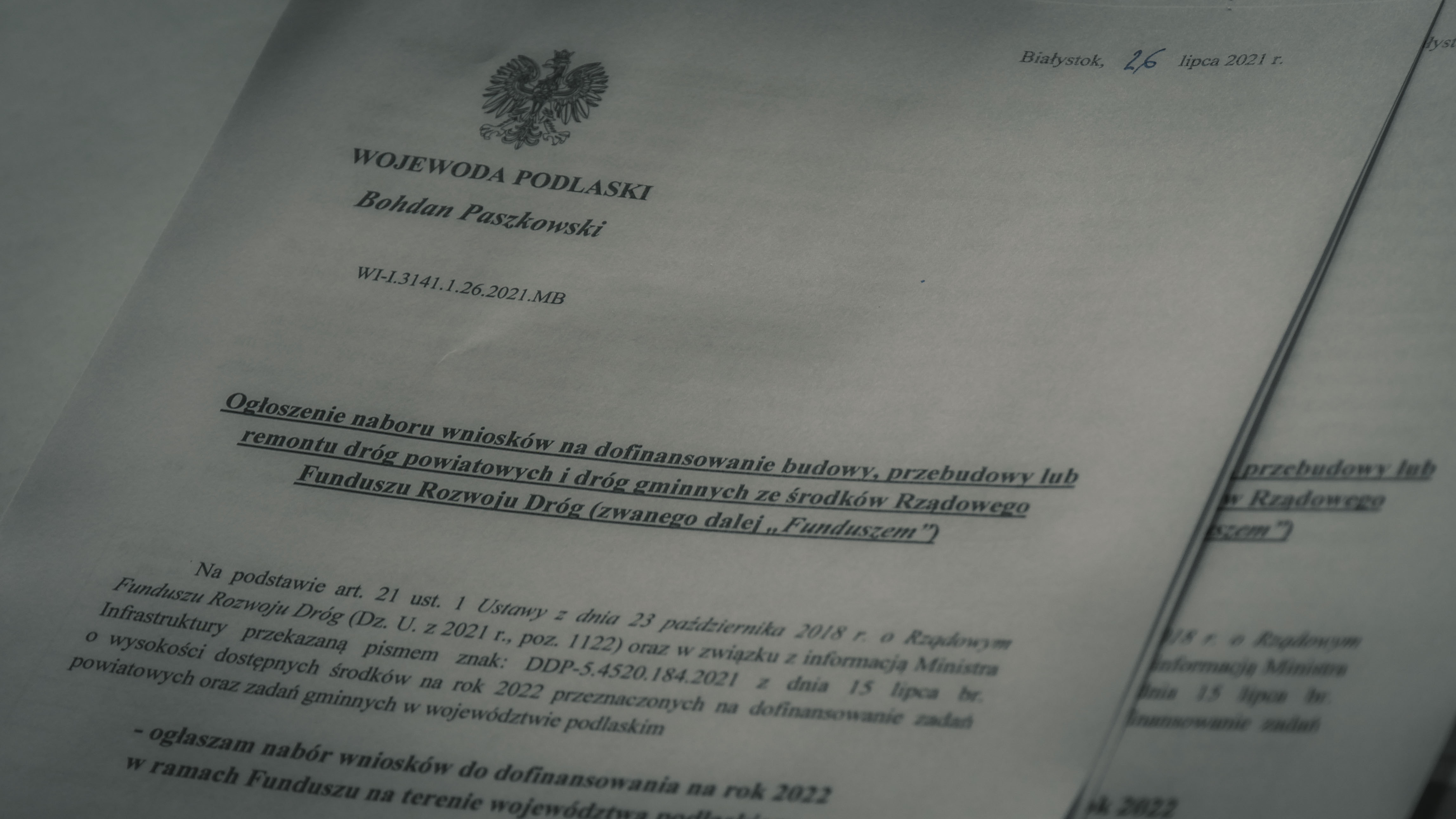 Na podstawie art. 21 ust. 1 ustawy z dnia 23 października 2018 r. o Rządowym Funduszu Rozwoju Dróg, Wojewoda Podlaski ogłasza nabór wniosków dla jednostek samorządu terytorialnego z terenu województwa podlaskiego, zainteresowanych uzyskaniem dofinansowania na budowy, przebudowy lub remonty dróg powiatowych i gminnych.
