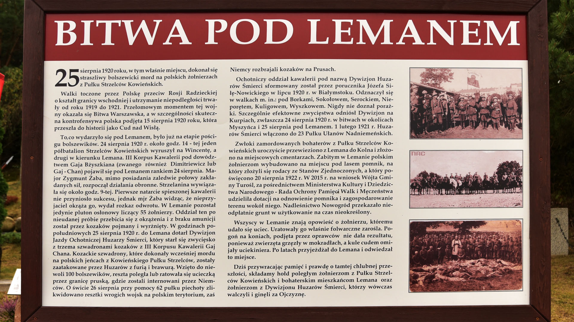 Bitwa pod Lemanem to jeden z ostatnich epizodów wojny polsko-bolszewickiej w 1920 roku. Pod wsią Leman, nad granicą z Prusami Wschodnimi, oddział 55 polskich żołnierzy osłaniał odwrót batalionu kowieńskiego pułku strzelców. Po wykonaniu zadania żołnierze ci próbowali wydostać się z okrążenia. Nie udało im się. Pojmanych Kozacy okrutnie wymordowali. Na rzeź polskich żołnierzy kazali patrzeć mieszkańcom miejscowości. Ocalał tylko jeden kawalerzysta.