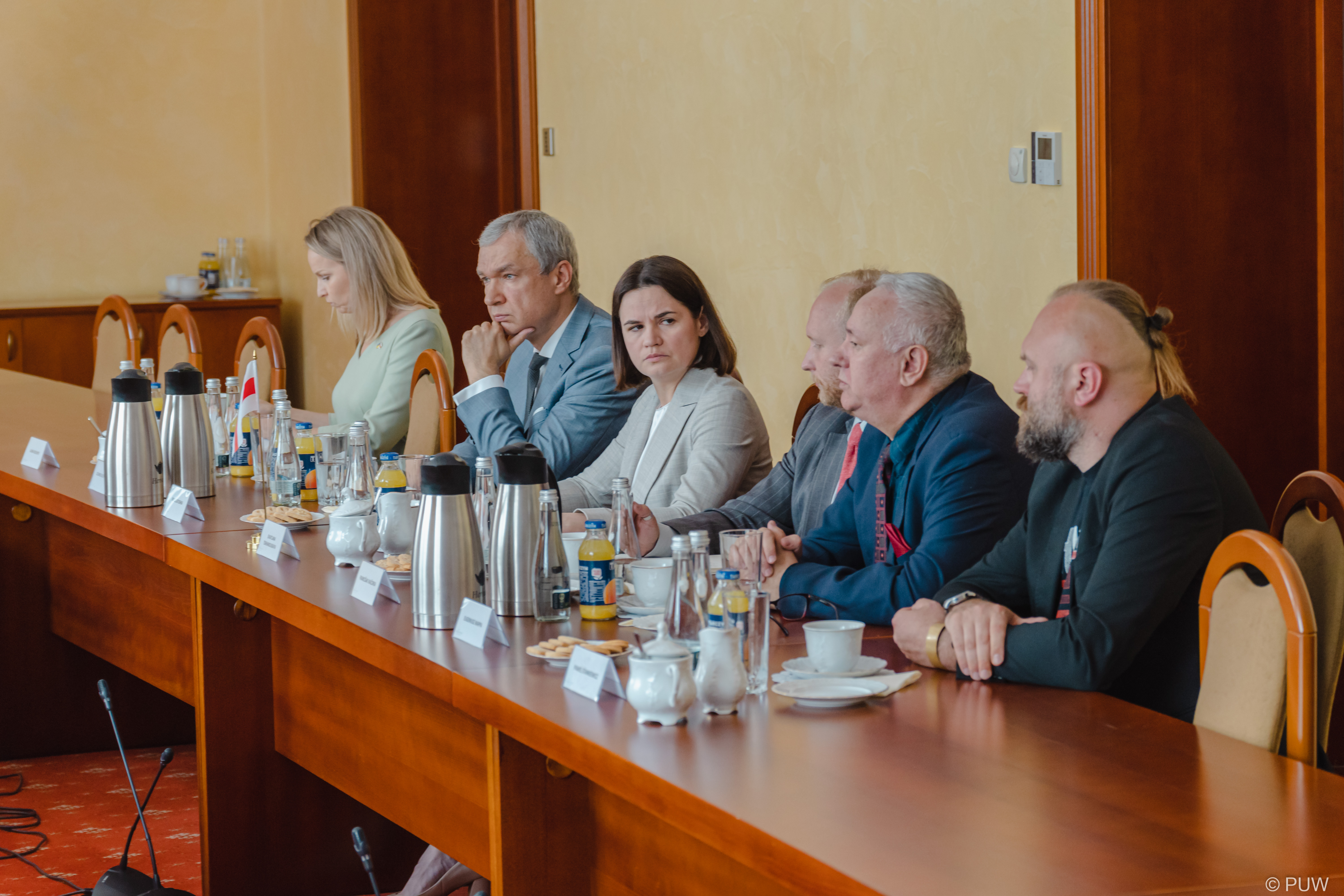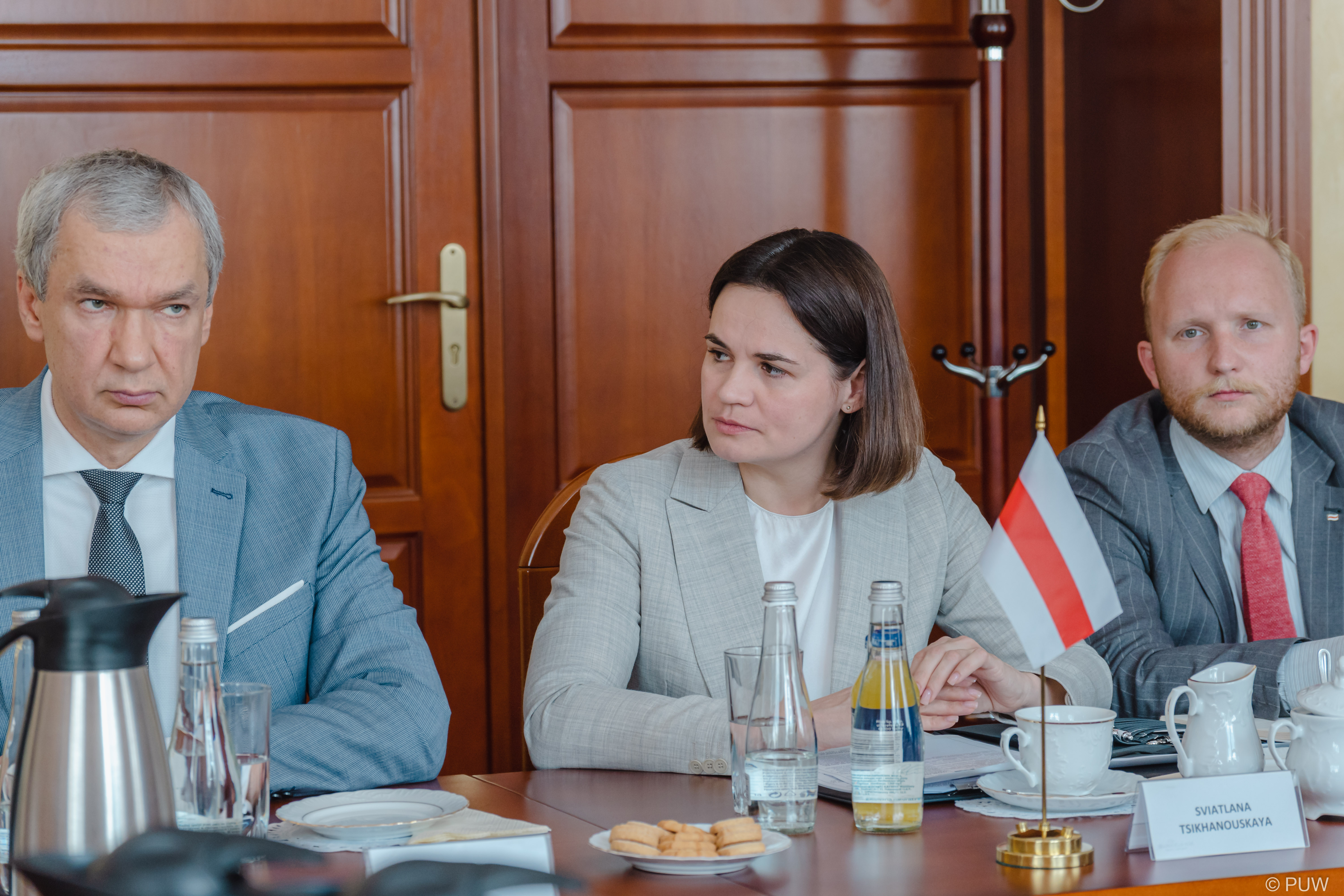 Sviatlanie Tsikhanouskiej towarzyszyła delegacja, w skład której wchodzili: Pavel Latushka - zastępca szefa Zjednoczonego Gabinetu Tymczasowego, doradca dyplomatyczny Dzianis Kuchynski, przedstawiciel ds. Odrodzenia Narodowego Alina Koushyk, szef Fundacji "Tutaka" Paweł Stankiewicz oraz przedstawiciel mniejszości białoruskiej w Podlaskiem Eugeniusz Wappa.