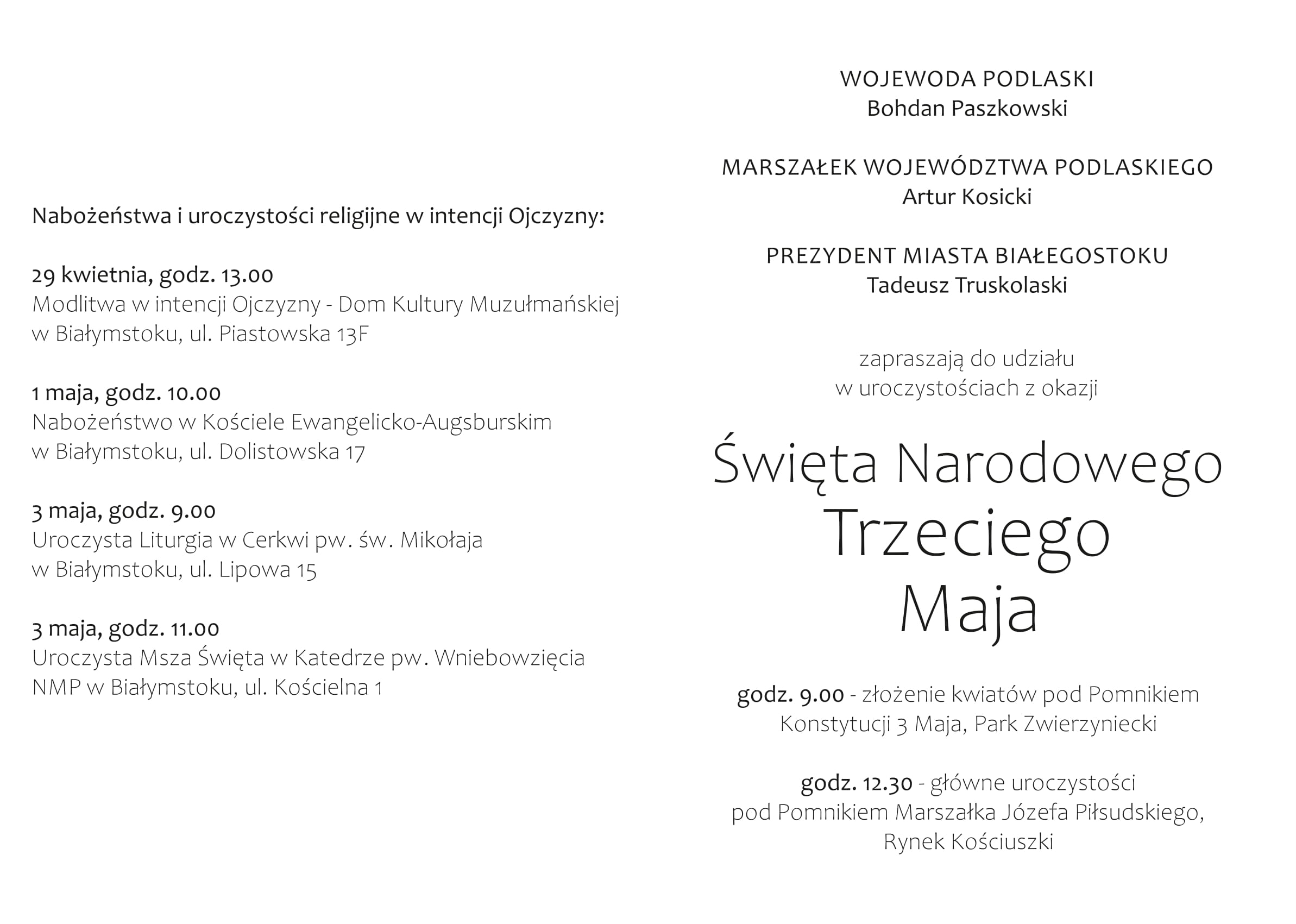 Wojewoda podlaski Bohdan Paszkowski, marszałek województwa podlaskiego Artur Kosicki oraz prezydent Białegostoku Tadeusz Truskolaski zapraszają wszystkich mieszkańców regionu do udziału w uroczystościach z okazji Święta Narodowego Trzeciego Maja.