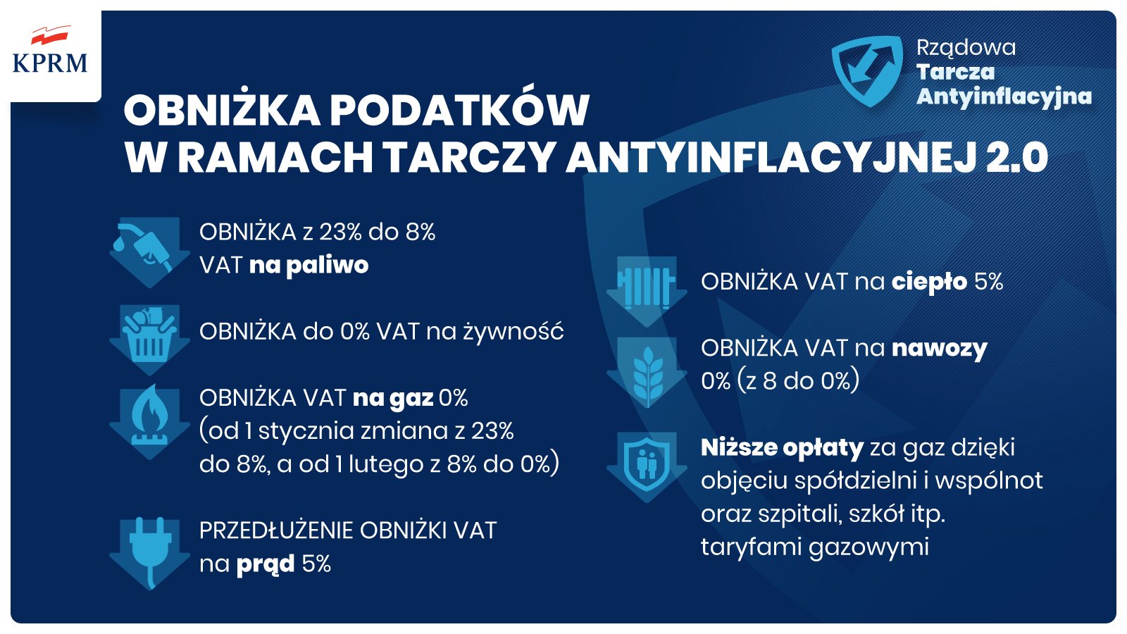 - obniżenie stawki VAT na gaz ziemny z 23 proc. do 8 proc.;