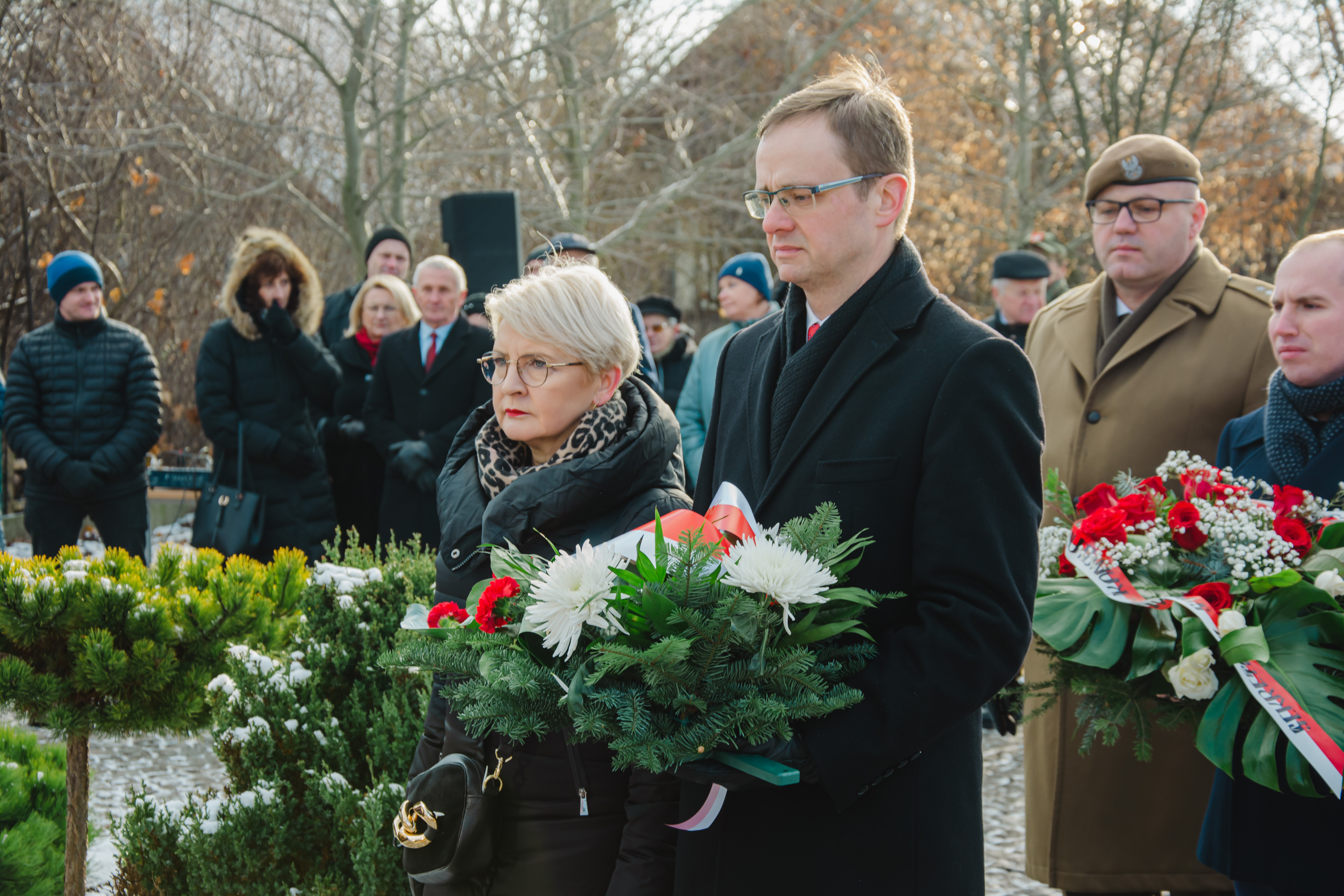 Uczestnicy uroczystości w Sokołach - wśród nich m.in. Wojciech Labuda - pełnomocnik premiera ds. ochrony miejsc pamięci, sekretarz stanu w KPRM Adam Andruszkiewicz, wicewojewodowie: Tomasz Madras i Bogusława Szczerbińska oraz wójt Sokół Józef Zajkowski, złożyli kwiaty pod pomnikiem, oddają hołd pomordowanym.